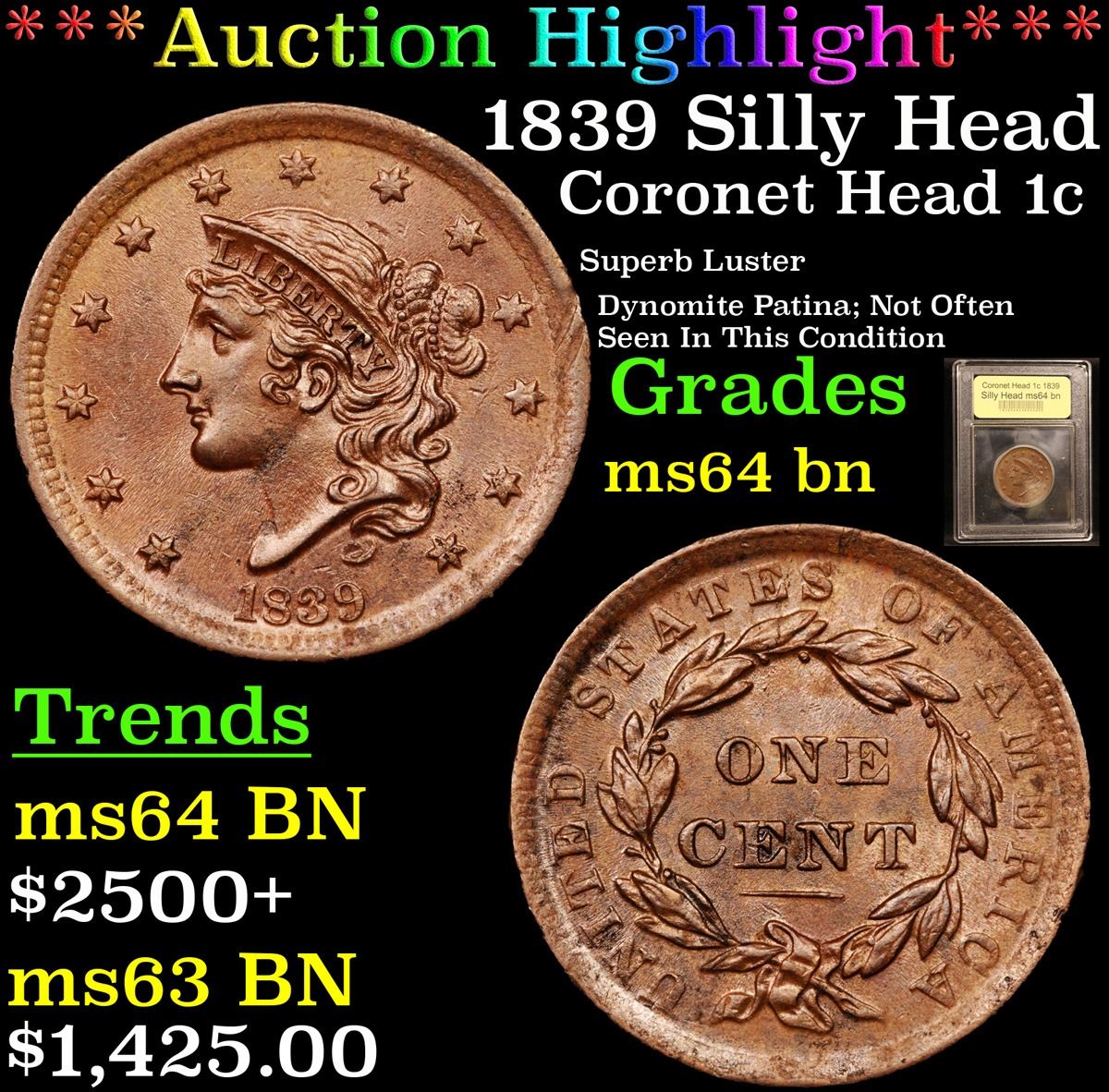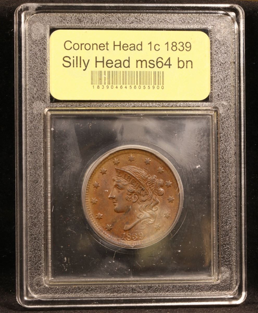 ***Auction Highlight*** 1839 Silly Head Coronet Head Large Cent 1c Graded Choice Unc BN By USCG. A Corey's Pick, Bid to Win, Don't let it get Away Coin
