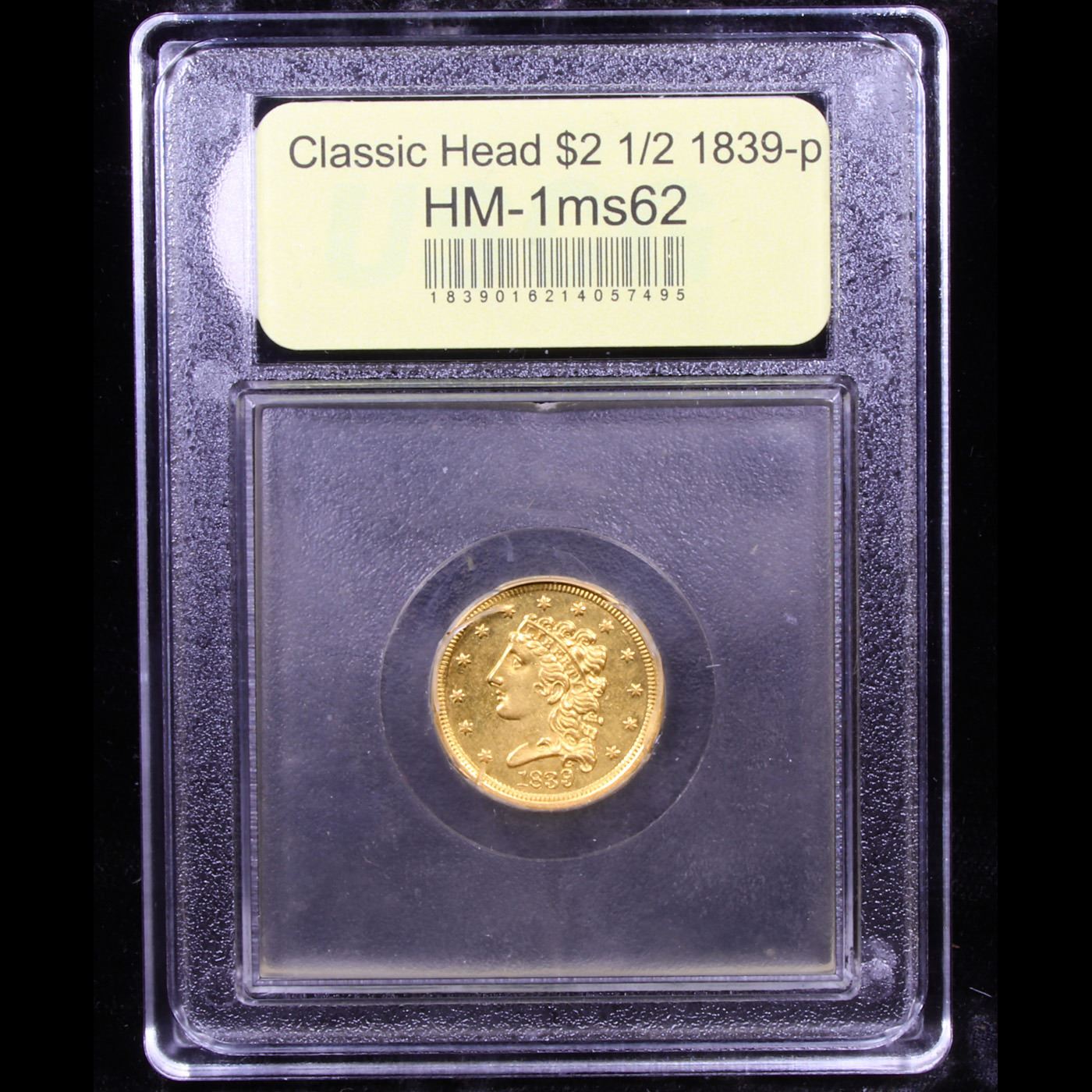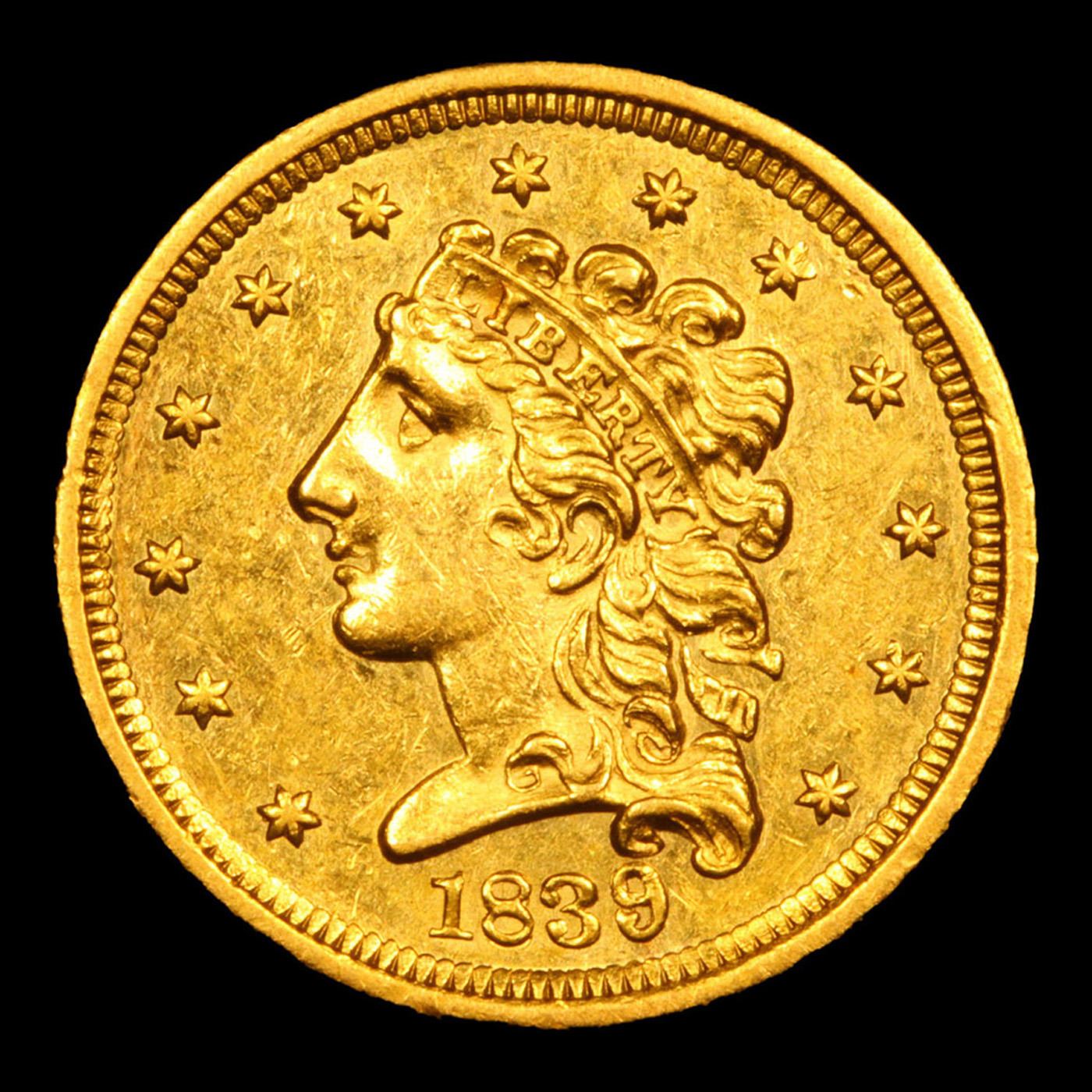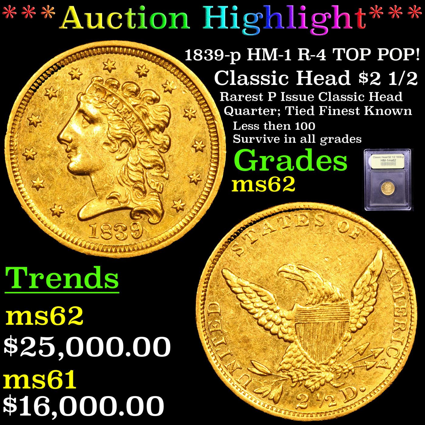 ***Auction Highlight*** 1839-p HM-1 R-4 TOP POP! Gold Classic Head Quarter Eagle $2 1/2 Graded Select Unc By USCG. 1839-p $2 ½ Classic Head Gold Quarter Eagle, HM-1 Variety. The 1839 is the rarest Philadelphia issue in the Classic Head quarter eagle series, and it is actually scarcer than a couple of the branch mint issues. Fewer than 100 coins survive in all grades, and only eight are Uncirculated. This MS62 coin displays an unusually sharp central strike with trivial softness on the left-hand star centers. Light chatter in the fields limits the grade. Tied for Finest Known. We have included another ms62 for your comparison. A Corey's Pick, Bid to Win, Don't let it get Away, you might not find its equal Coin. I give this coin my highest recommendation