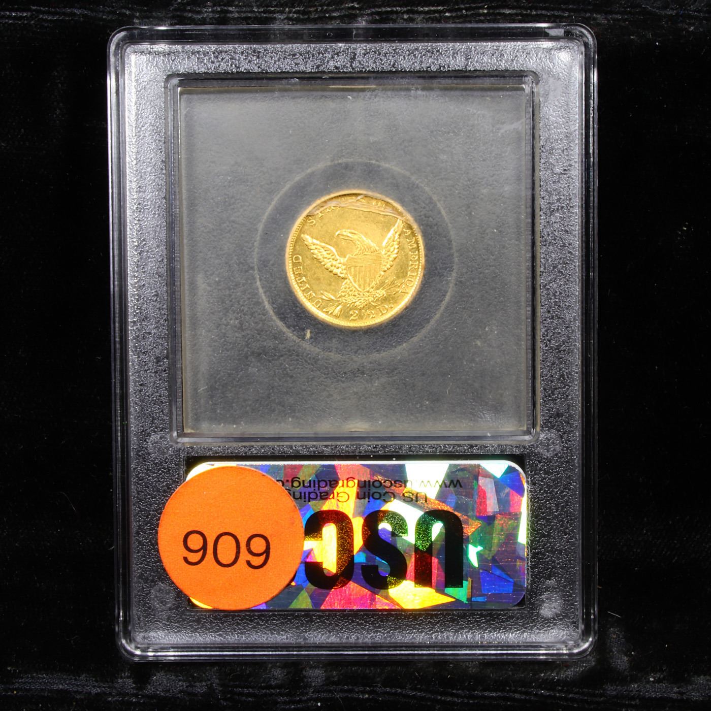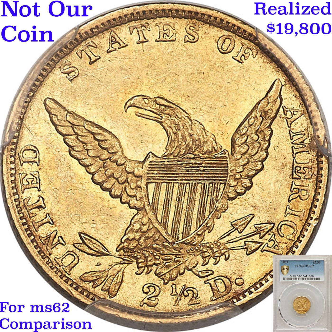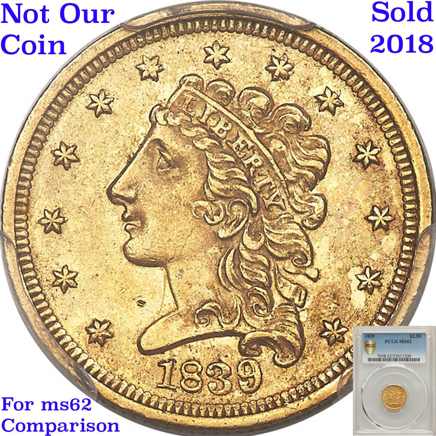 ***Auction Highlight*** 1839-p HM-1 R-4 TOP POP! Gold Classic Head Quarter Eagle $2 1/2 Graded Select Unc By USCG. 1839-p $2 ½ Classic Head Gold Quarter Eagle, HM-1 Variety. The 1839 is the rarest Philadelphia issue in the Classic Head quarter eagle series, and it is actually scarcer than a couple of the branch mint issues. Fewer than 100 coins survive in all grades, and only eight are Uncirculated. This MS62 coin displays an unusually sharp central strike with trivial softness on the left-hand star centers. Light chatter in the fields limits the grade. Tied for Finest Known. We have included another ms62 for your comparison. A Corey's Pick, Bid to Win, Don't let it get Away, you might not find its equal Coin. I give this coin my highest recommendation