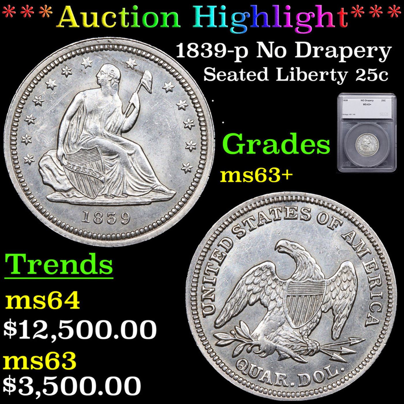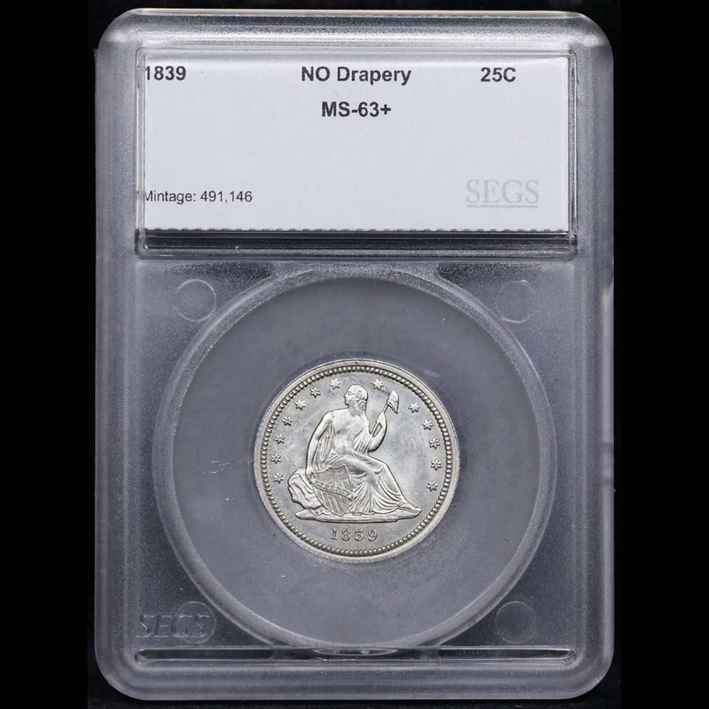 ***Auction Highlight*** 1839-p No Drapery Seated Liberty Quarter 25c Graded ms63+ BY SEGS. A Key Date's Pick, Bid to Win, Don't let it get Away Coin