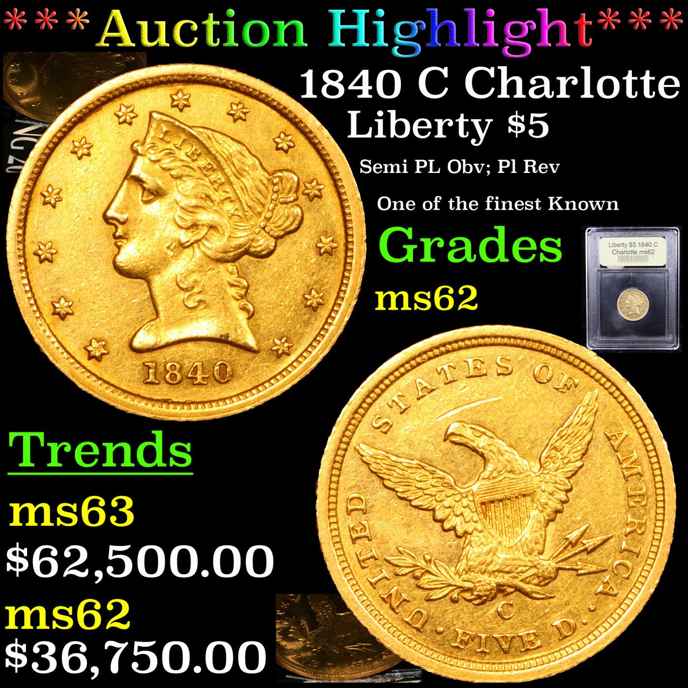 ***Auction Highlight*** 1840 C Charlotte Gold Liberty Half Eagle $5 Graded Select Unc By USCG. The vibrant sunshine-yellow patina of this piece is adorned by subtle notions of olive and amber hues in select areas. a satiny complexion that flirts with prooflike reflectivity on the Obverse and is Fully Prooflike on the reverse. The strike is satisfying for the issue, with just a trifle softness to Liberty's curls and the eagle's neck but proud definition elsewhere. Intense scrutiny with a glass reveals nothing in the way of major distractions. Several minute marks are scattered over each side. A truly attractive and satisfying jewel. 1840 marked the introduction of Christian Gobrecht's Liberty design type to the quarter eagle series, ensuring that examples struck at each of the four operating mints that year would eventually see perpetual demand from collectors. The Charlotte Mint, opened just two years prior in 1838, struck 12,822 quarter eagles, rivaling the 18,859 examples struck by the central mint in Philadelphia that year. The 1840-C issue saw extensive regional circulation and very few examples remain for collectors today. Of an extant population of perhaps 150 pieces total, is it though that less than ten survive in Mint State, stressing the significance and immense desirability of the present offering. A Corey's Pick, Bid to Win, Don't let it get Away, you might not find its equal Coin. I give this coin my highest recommendation