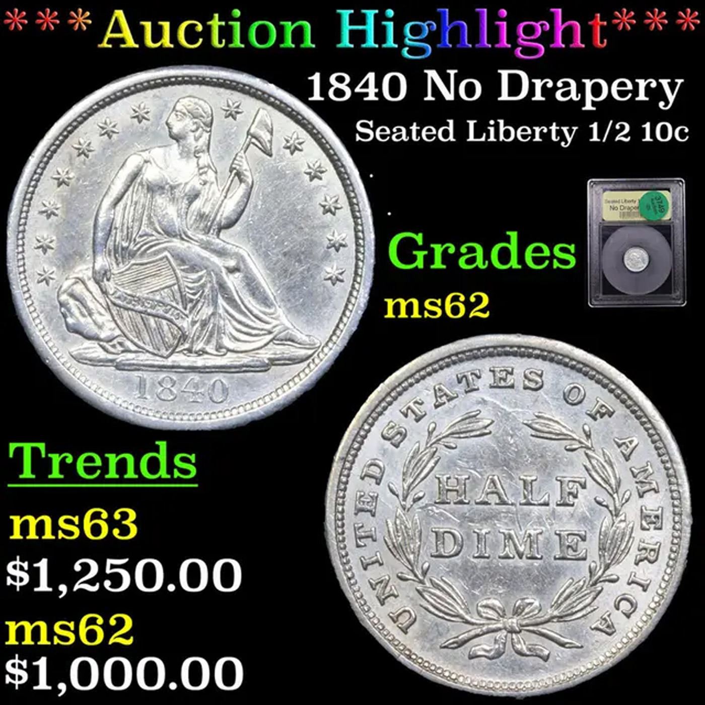 ***Auction Highlight*** 1840 No Drapery Seated Liberty Half Dime 1/2 10c Graded Select Unc BY USCG.