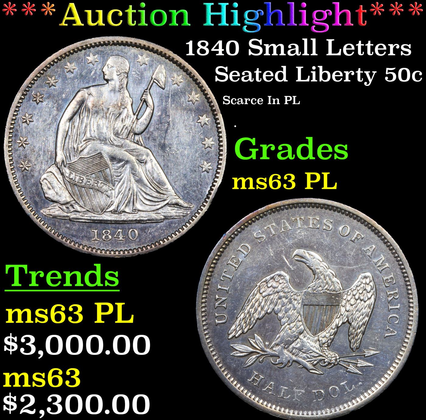 ***Auction Highlight*** 1840 Small Letters Seated Half Dollar 50c Graded Select Unc PL BY USCG. A Key Date's Pick, Bid to Win Coin