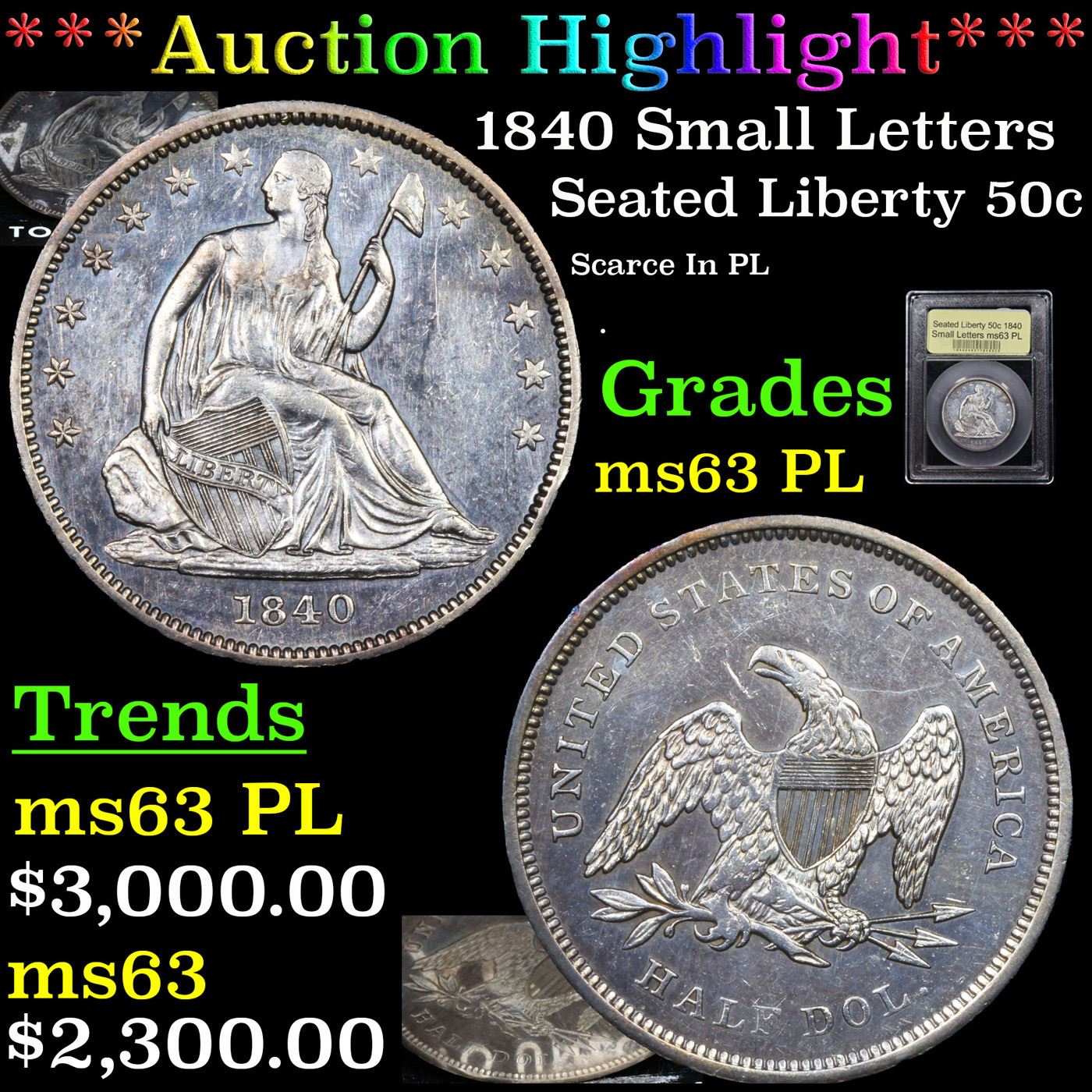 ***Auction Highlight*** 1840 Small Letters Seated Half Dollar 50c Graded Select Unc PL BY USCG. A Key Date's Pick, Bid to Win Coin