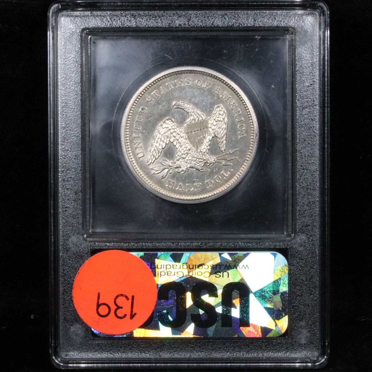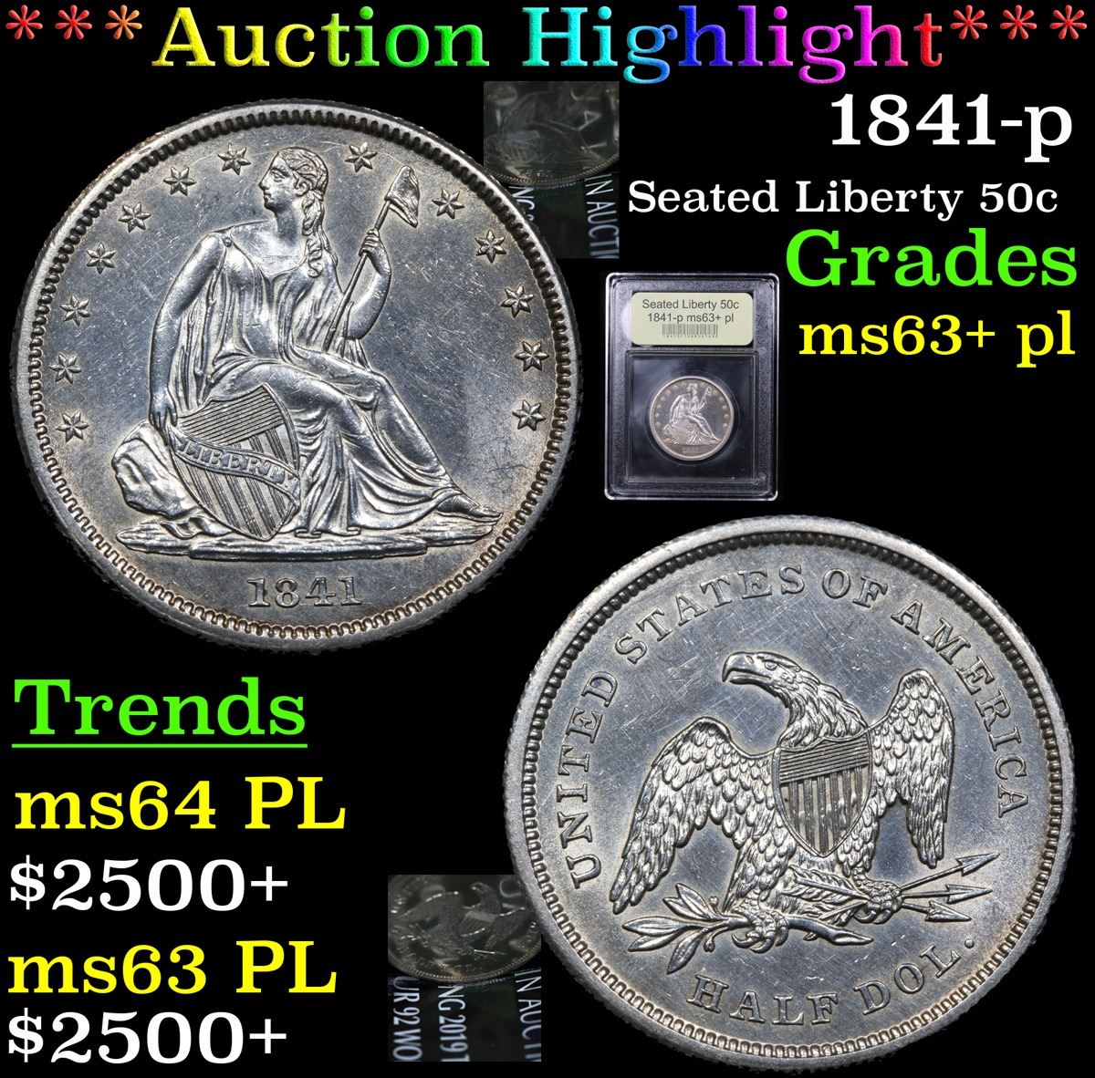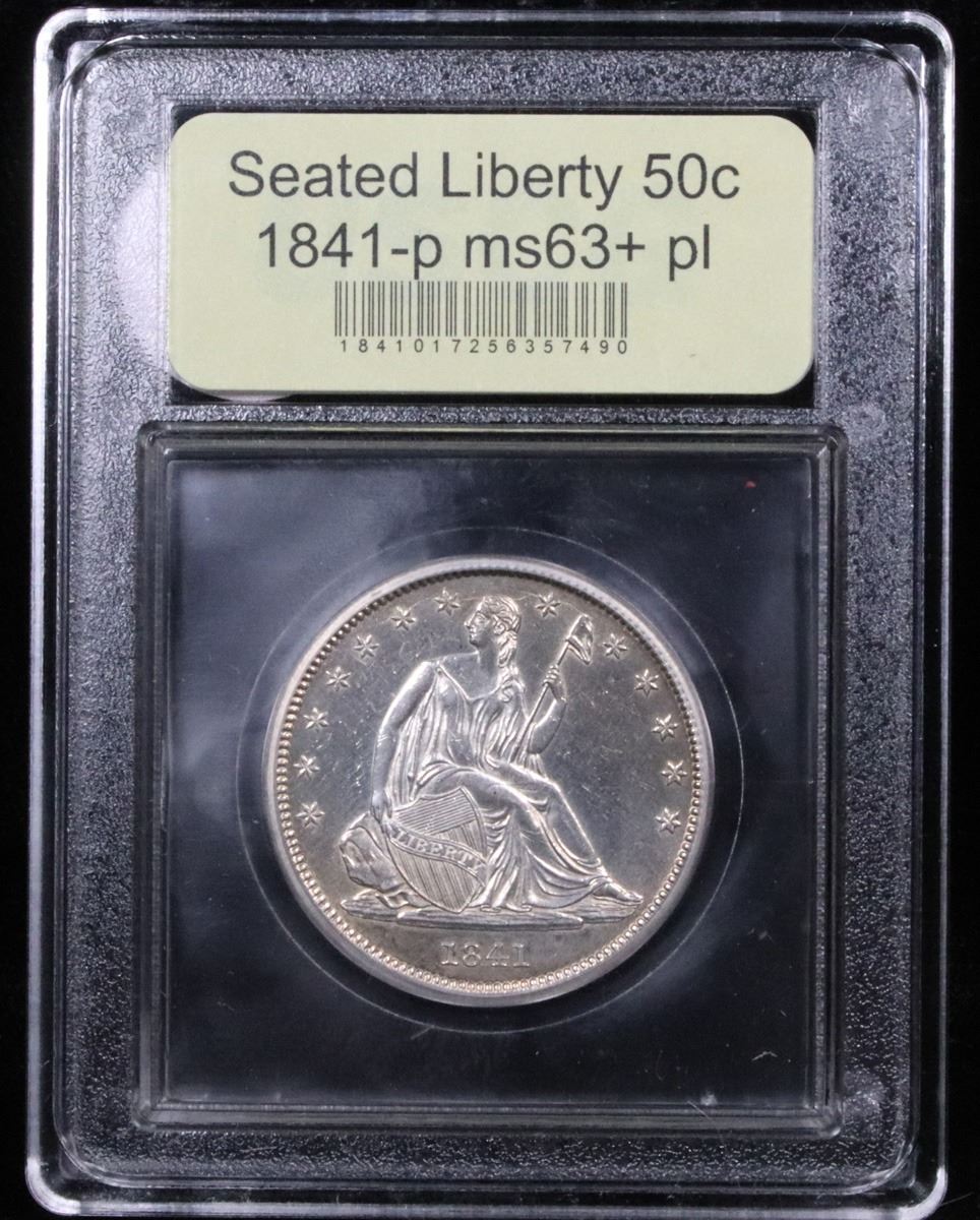***Auction Highlight*** 1841-p . . Seated Half Dollar 50c Graded Select Unc+ PL By USCG. Exceptionally Rare Date. Outstanding example. As of today none have ever been graded by NGC or PCGS as PL, But both services have only recently acknowledged that they have been ignoring PL type coins and have only recently advised that they will begin to designate any type that is PL as PL. We have estimated the trends for this superb Proof Like example as $16,000 in ms64PL and $6500 in ms63 PL. In not PL Trends are ms 64 at $6000 and ms63 at $3500.