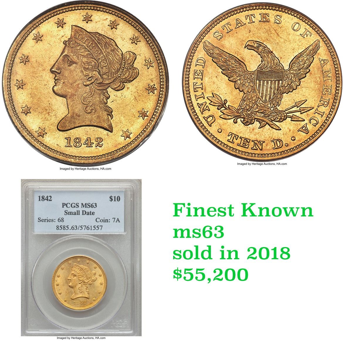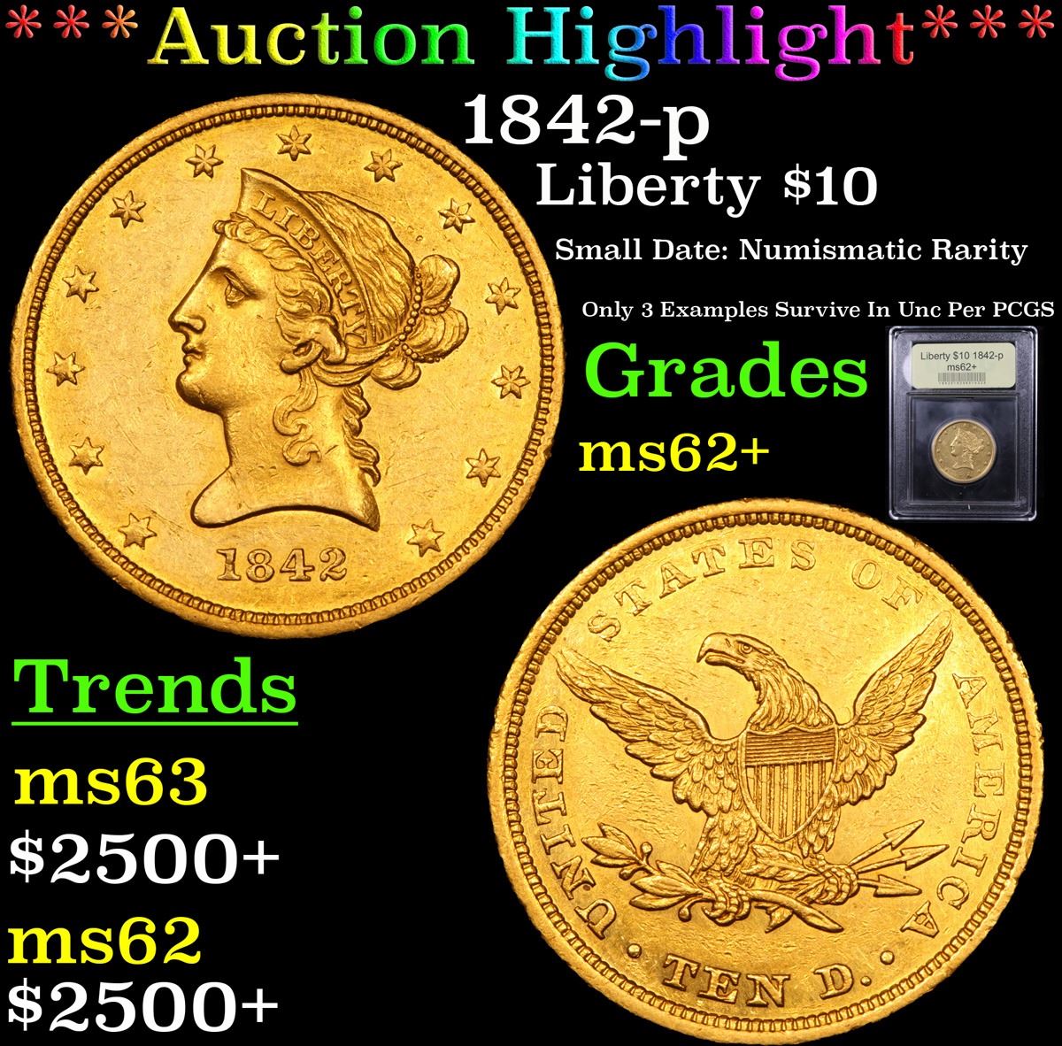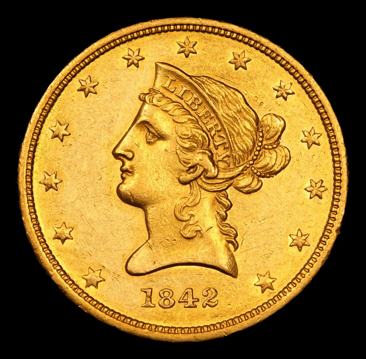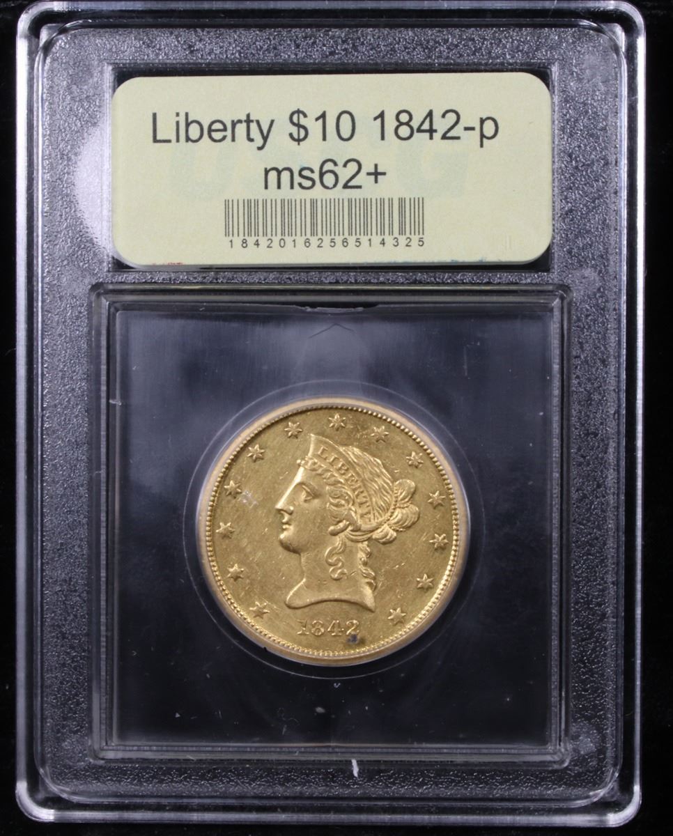 ***Auction Highlight*** 1842-p Gold Liberty Eagle $10 Graded Select Unc By USCG. Up for auction is a numismatic rarity. You are looking at 25% of the surviving uncirculated population of the 1842-p $10 gold Eagle. Per PCGS only 3 examples survive in uncirculated condition and none higher than a singular ms63. Per David Akers of PCGS : “ The 1842 Small Date is rare in any condition and, when available, the typical specimen grades VF or EF and is well struck, often with proof like or partially proof like surfaces. Almost Uncirculated examples are extremely rare and I have never personally examined a strictly uncirculated specimen.” The example at hand does in fact have semi Proof like surfaces, wonderful detail and a very nice strike. It is the sole 2nd finest example known! WOW! Trends are ms62 $27,500, ms63 $70,000. - I have included a photo of the finest known, the sole ms63, that sold in 2018 for $55,200. I wish you good luck in obtaining this numismatic rarity. A Corey's Pick, Bid to Win, Don't let it get Away, you might not find its equal Coin. I give this coin my highest recommendation