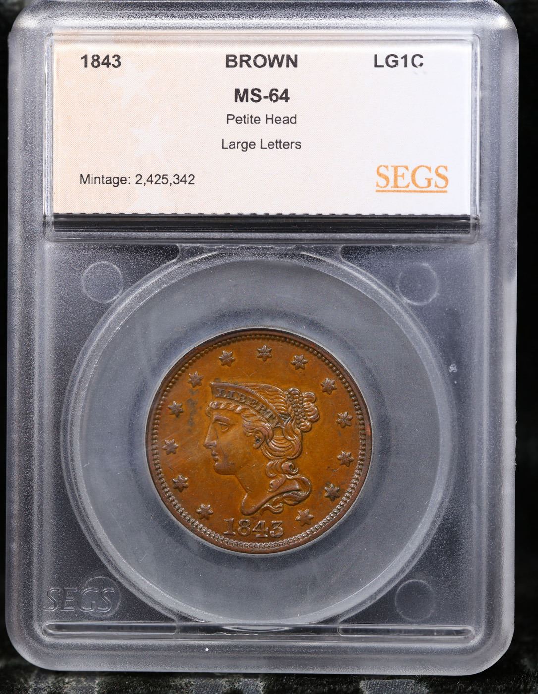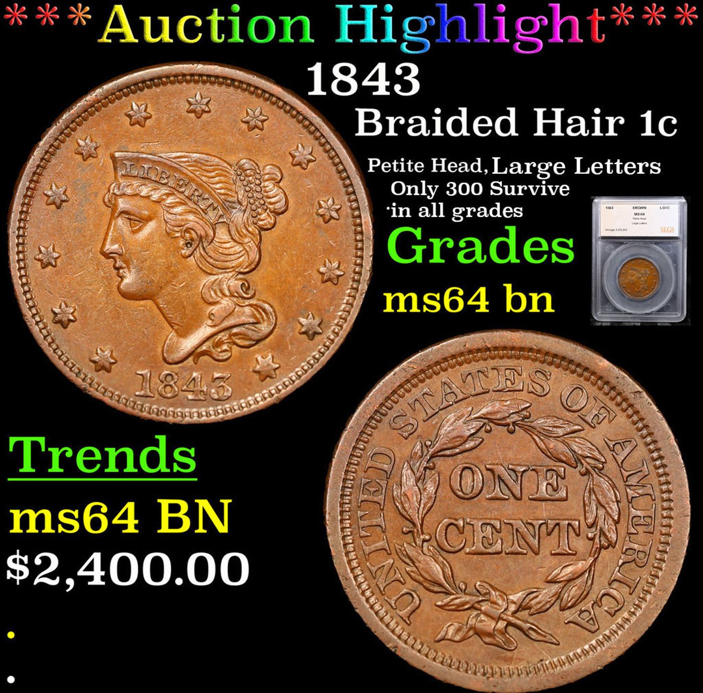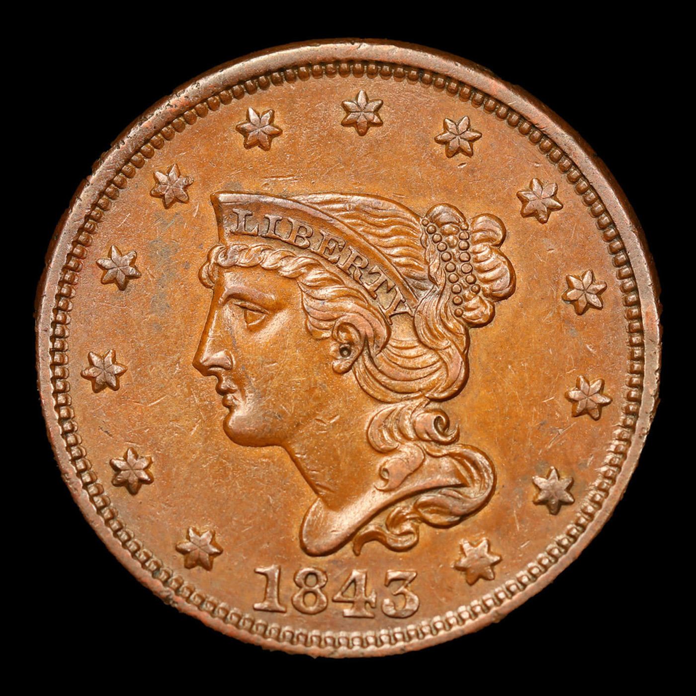 ***Auction Highlight*** 1843 Braided Hair Large Cent 1c Graded Choice Unc BN by SEGS.