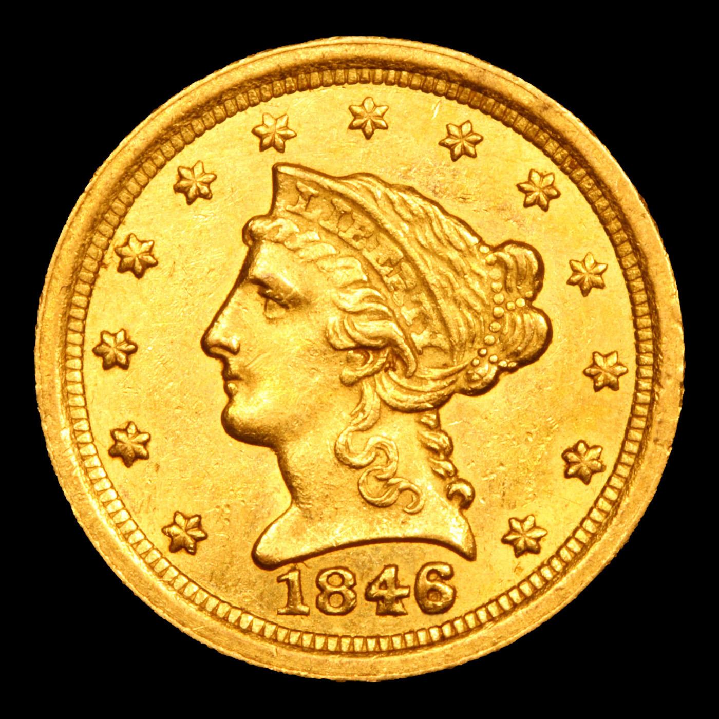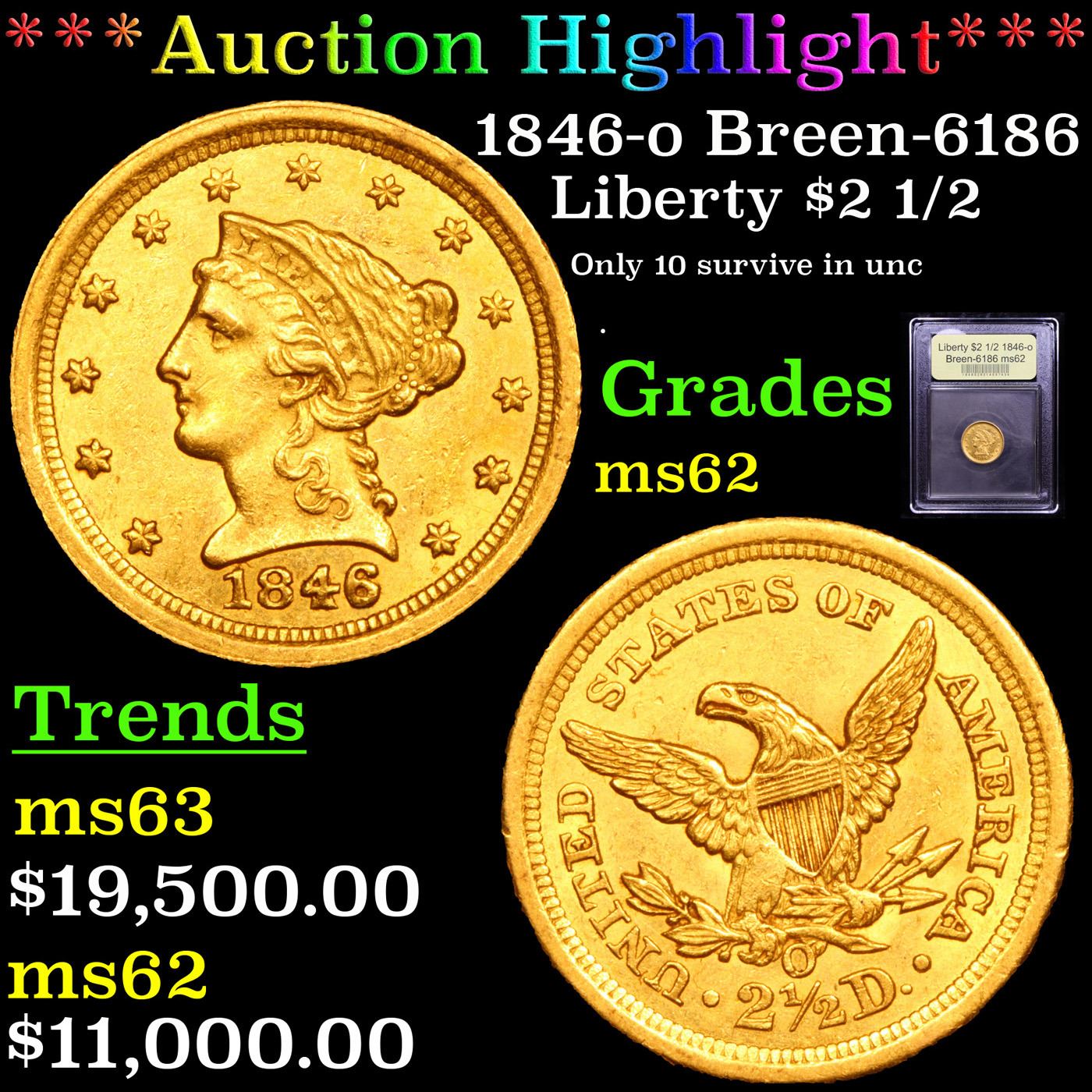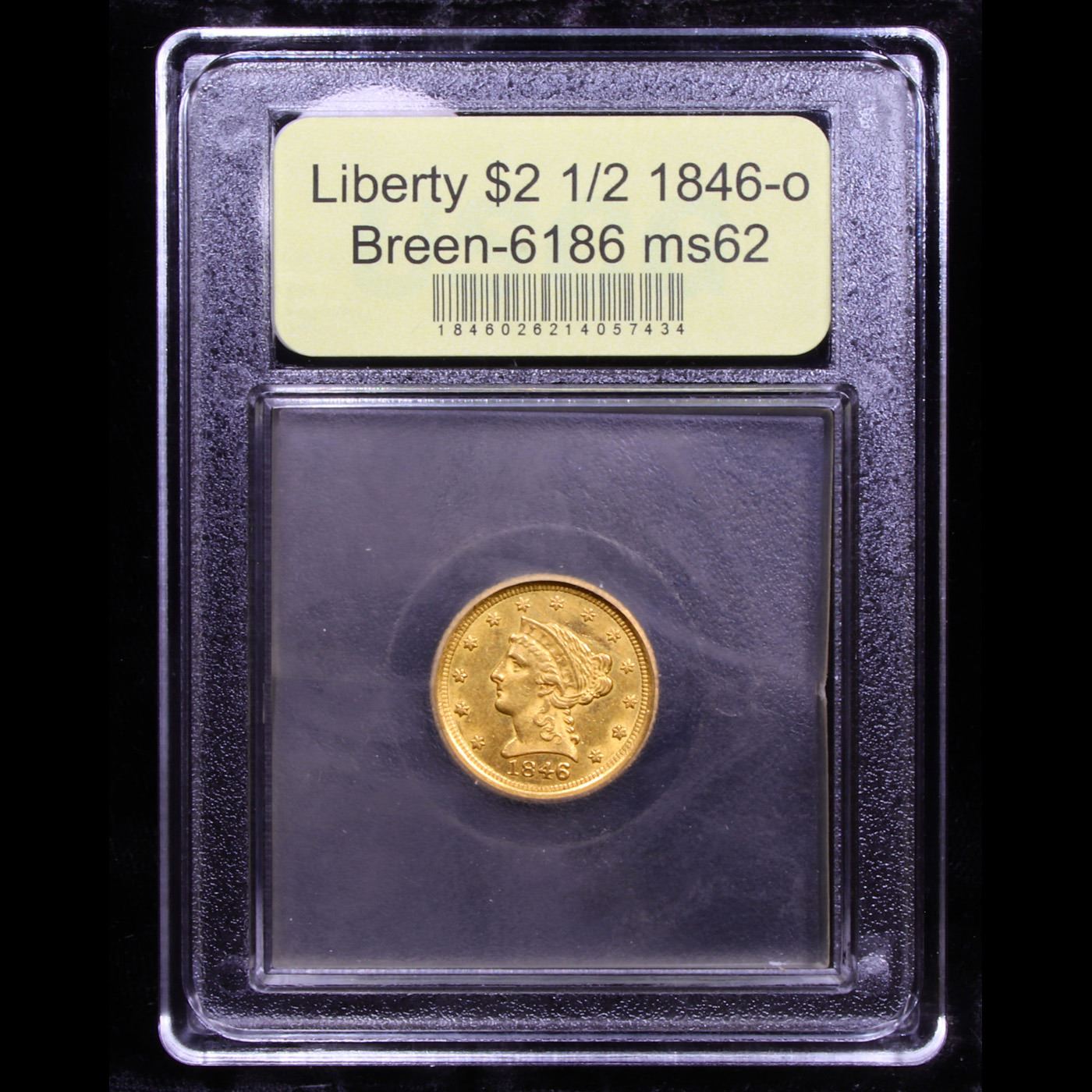 ***Auction Highlight*** 1846-o Breen-6186 Gold Liberty Quarter Eagle $2 1/2 Graded Select Unc By USCG. This appears to be the Breen-6186, so-called overdate, that shows traces of what appears to be a 4 beneath the 6 in the date. It is given little credence as a real overdate because no Quarter Eagles were struck in New Orleans during 1844. Akers acknowledges the issue as extremely rare in Mint State. Only a handful of the 62,000 coins minted have escaped circulation, and of these, Akers claims only ten are in mint state. The example at hand is a bright and pleasing example with its smooth, creamy surfaces and bright luster. Slight weakness is noted at the center of the reverse, a characteristic of this issue. Also the reverse has some minor and unnoticeable with the naked eye, hairlines, while not distracting it is the grade-limiting factor. An underrated and undervalued issue.