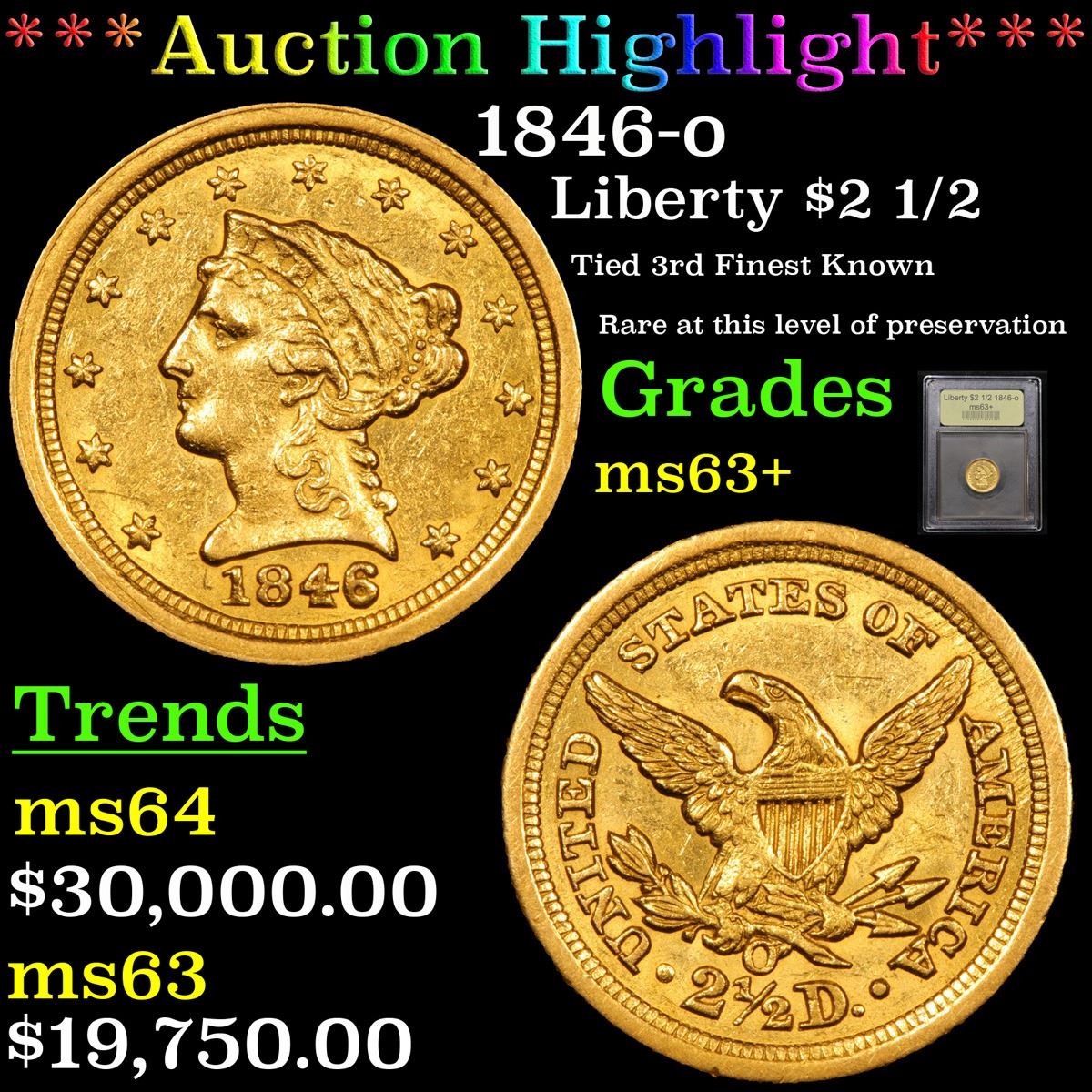 ***Auction Highlight*** 1846-o Gold Liberty Quarter Eagle $2 1/2 Graded Select+ Unc By USCG. The mintage of 62,000 pieces for the 1846-O quarter eagle belies its true scarcity. Only 150 to 175 examples are known today in all grades, of which a mere nine to 12 are Mint State. The finest known is an MS66 from the Pittman Collection. The bright yellow-gold surfaces of this magnificent choice example display resplendent mint luster, along with a hint of semi proof likeness in the fields. The strike is notably soft in the central areas of each side, a characteristic of nearly all 1846-O quarter eagles. A few light marks are insignificant. This is a noteworthy attribute because the 1846-O is among the most difficult quarter eagles to locate with clean surfaces. Tied for 3rd Finest Known! A Corey's Pick, Bid to Win, Don't let it get Away, you might not find its equal Coin. I give this coin my highest recommendation