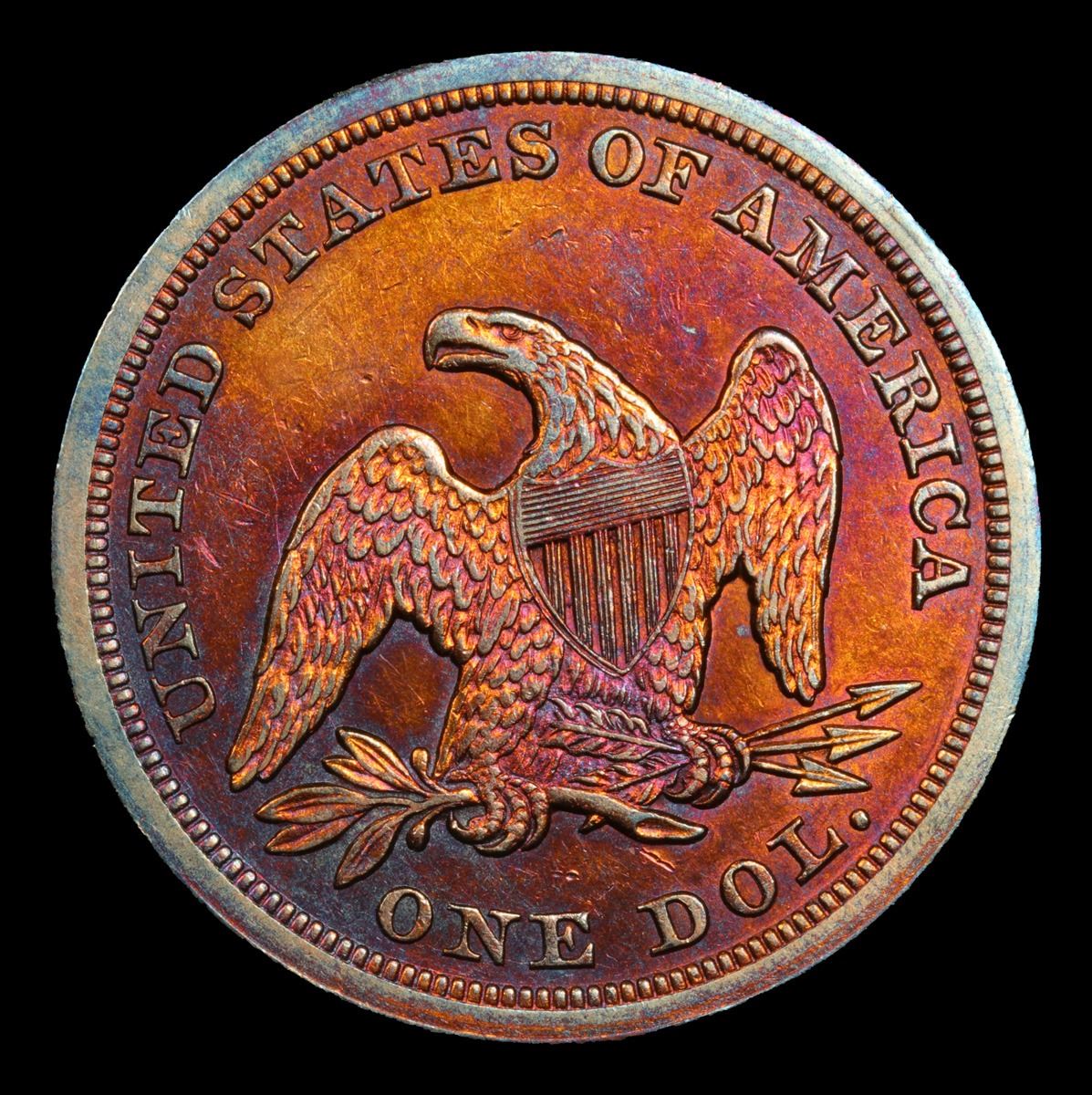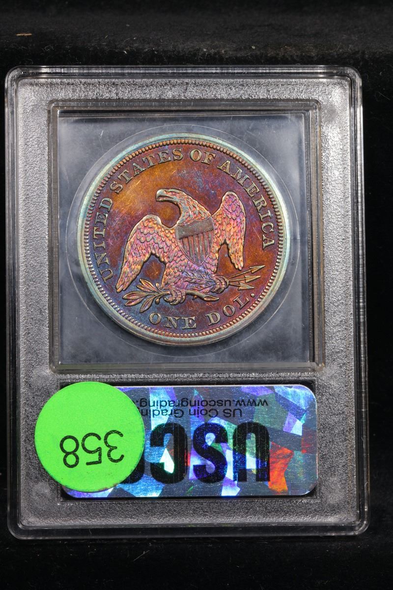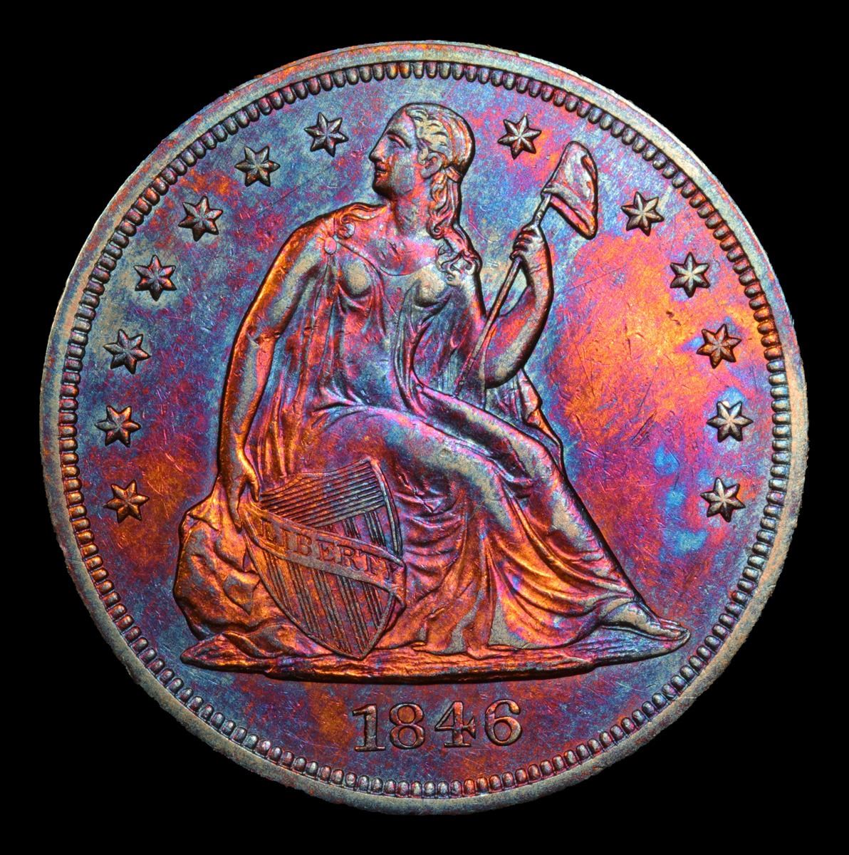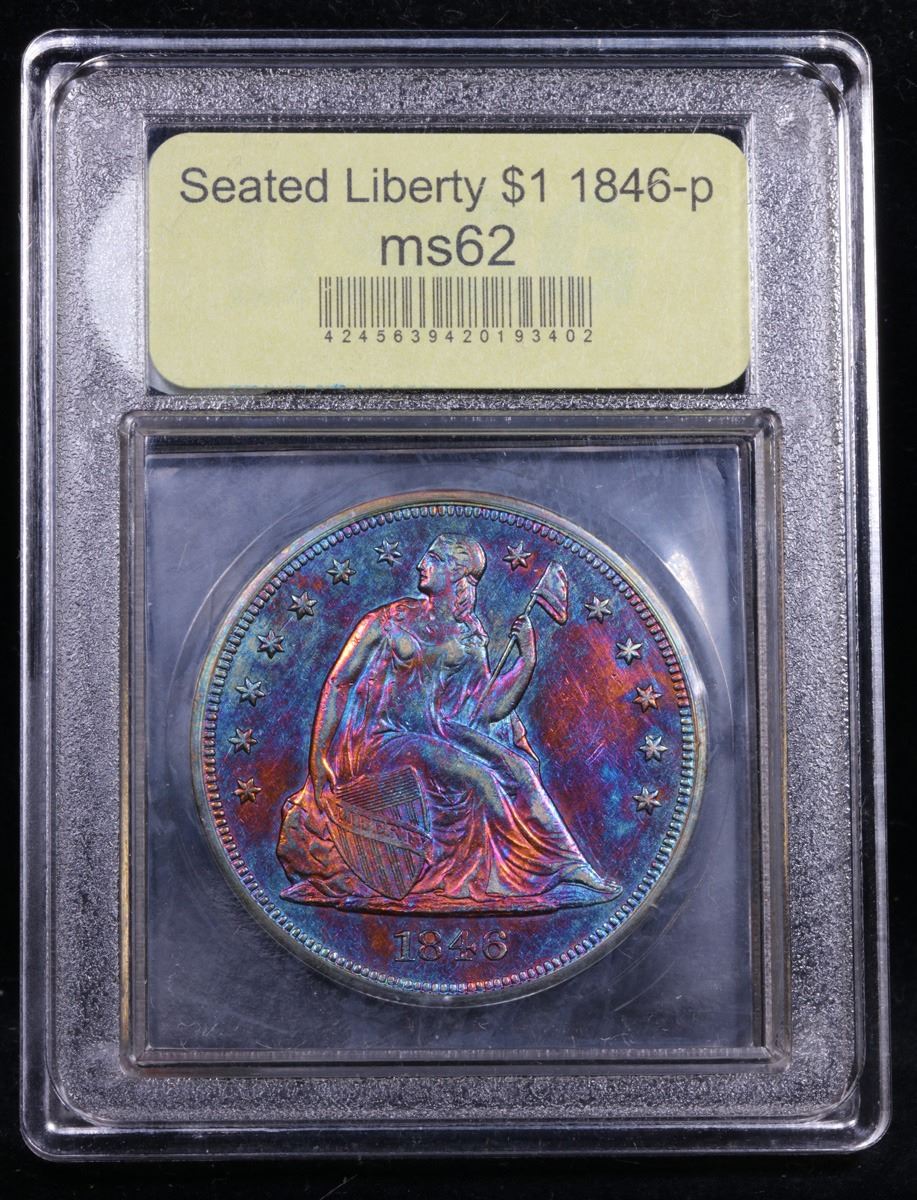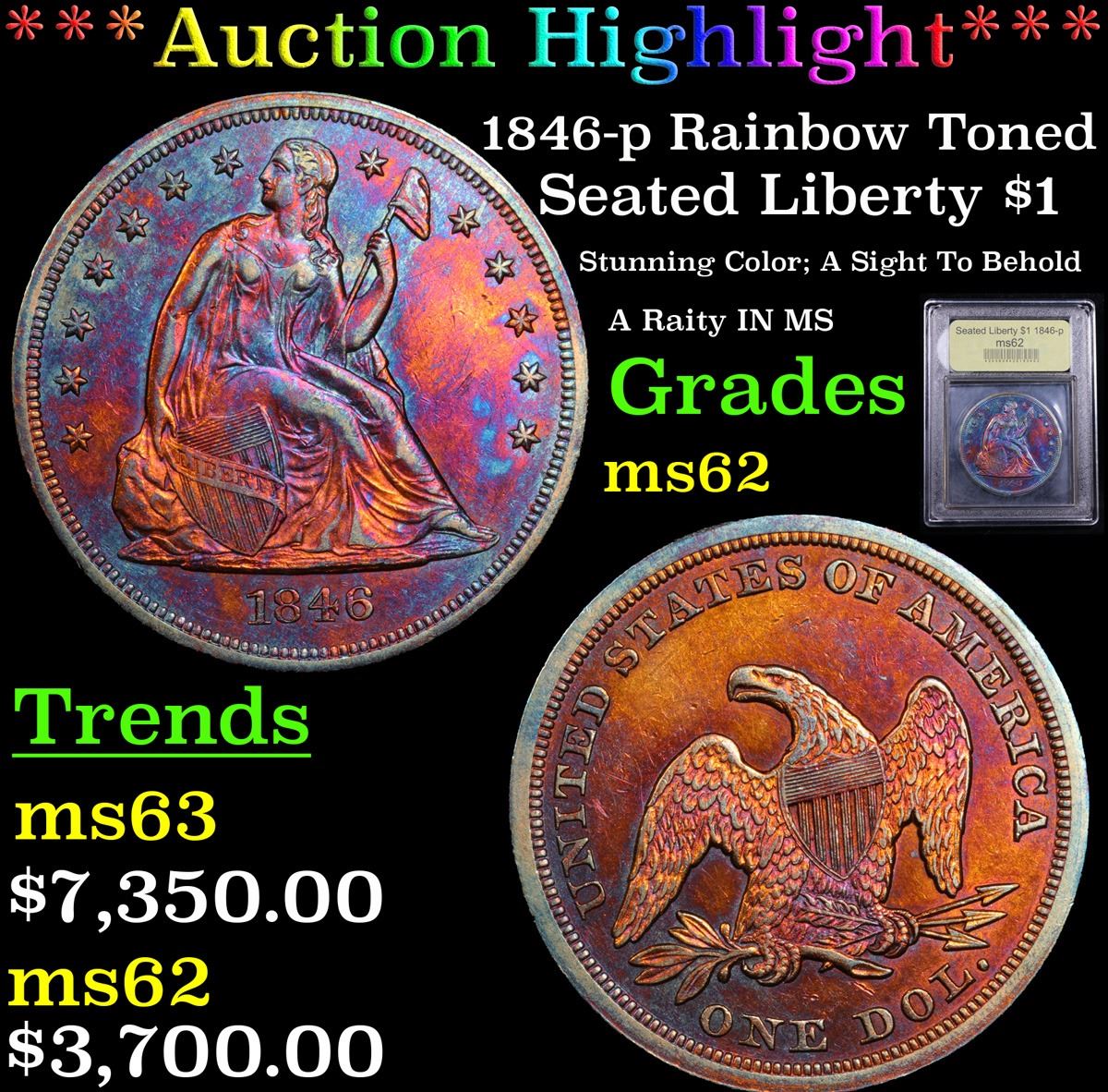 ***Auction Highlight*** 1846-p Rainbow Toned Seated Liberty Dollar $1 Graded Select Unc By USCG. Stunning color highlights this terrific Seated Dollar. Orange, reds and blues dominate the obverse while Burnt orange that almost looks alight dominates the stunning reverse. A sight to behold. The 1846 silver dollar is frequently found in circulated grades, but its rarity in Mint State has been known for decades. Bruce Amspacher wrote in the July-August 1982 Coin Dealer Newsletter monthly that a nice Uncirculated coin turned up at the rate of one coin every five to 10 years. The present example offers thorougoing eye appeal and with a strike that is quite sharp, save for the high points of the eagle's wings, but is essentially full elsewhere. There are few marks of any consequence noted. Trends are ms62 $3700 and ms63 $7,350 A Corey's Pick, Bid to Win, Don't let it get Away, you might not find its equal Coin