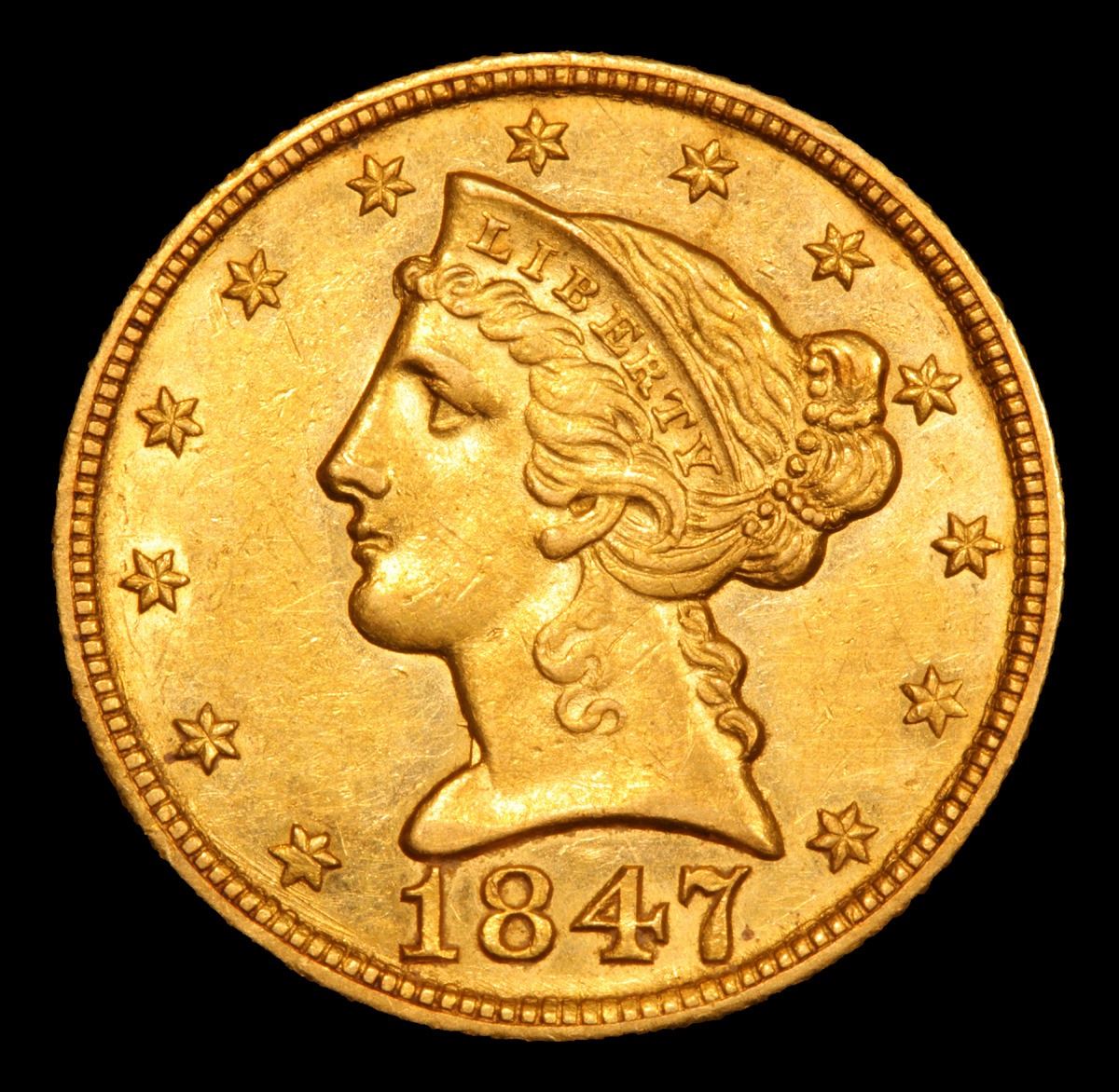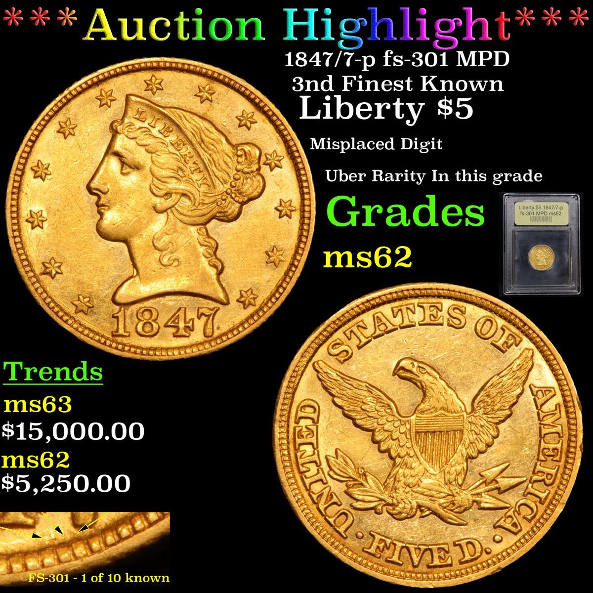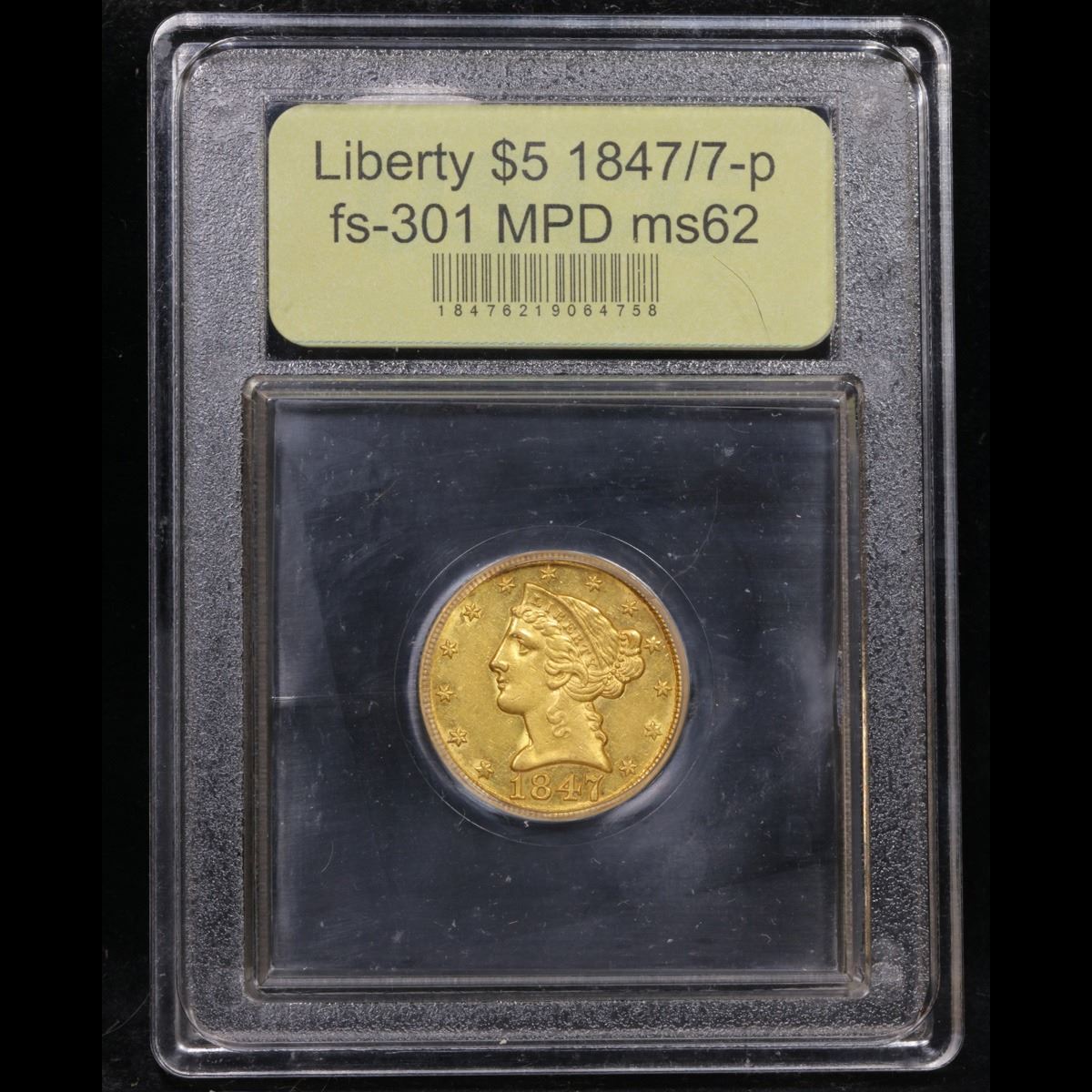 ***Auction Highlight*** 1847/7-p fs-301 MPD 3nd Finest Known Gold Liberty $5 Graded Select Unc By USCG. Up for Auction is an ultra rare and highly sought 1847/7 fs-301. It is a rare MPD (misplaced Digit) rarity with a separate line in the Red book. To quote Ron Guth of PCGS “A Misplaced Date (MPD) occurs when the die sinker accidentally places the date way out of position. This is different from a repunched date, where a slight misalignment occurs between one or more punches of the date logotype. A Misplaced Date often occurs when the date logotype is dropped accidentally onto the die. In the case of the 1847 Half Eagle, the one listed in the GUIDEBOOK, is known as FS-301 (formerly FS-303). On the FS-301, the top of a 7 can be seen nestled in the denticles below the final 4 and 7 of the date. As of September 2011, PCGS had certified ten examples of the 1847/7 MPD (FS-301), the finest of which is a single PCGS MS-63 This example is the 4th finest known. One ms65 and 1 ms64 at NGC and one ms63 at both NGC and PCGS. I believe that ours is actually 3rd finest as I believe both the ms64 & ms65 at NGC are resubmits. Trends are ms62 $5,250 and ms63 $15,000. A Corey's Pick, Bid to Win, Don't let it get Away, you might not find its equal Coin. I give this coin my highest recommendation