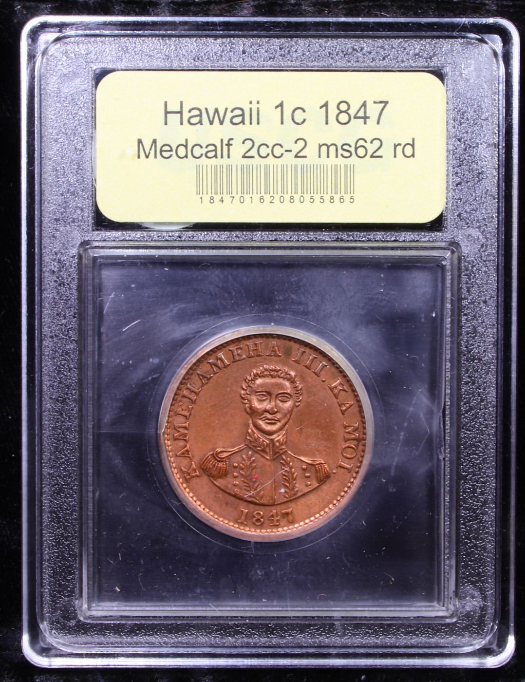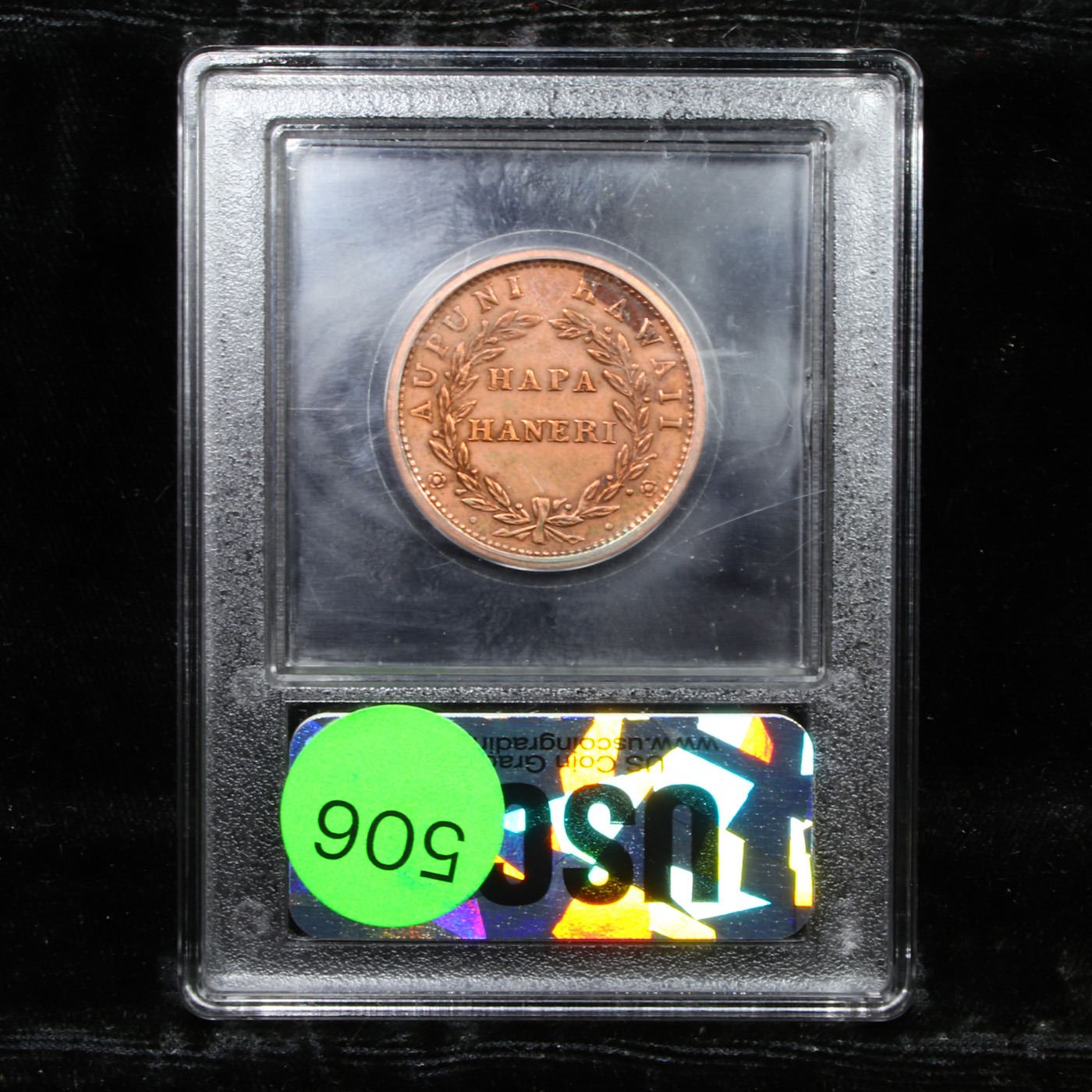 ***Auction Highlight*** 1847 Medcalf 2cc-2 Hawaii 1c Graded Select Unc RD By USCG. Crosslet 4, 7x8 berries. A well struck and coruscating cent with ample mint red throughout. Somewhat Proof like fields. No marks are readily apparent. Carbon by the HAW limit the grade. The 1847 Hawaii cents were struck by the Attleboro, Massachusetts firm of H.M. & E.I. Richards. They bore the blundered legend HAPA HANERI in place of the proper HAPA HANELE. A Corey's Pick, Bid to Win, Don't let it get Away, you might not find its equal Coin