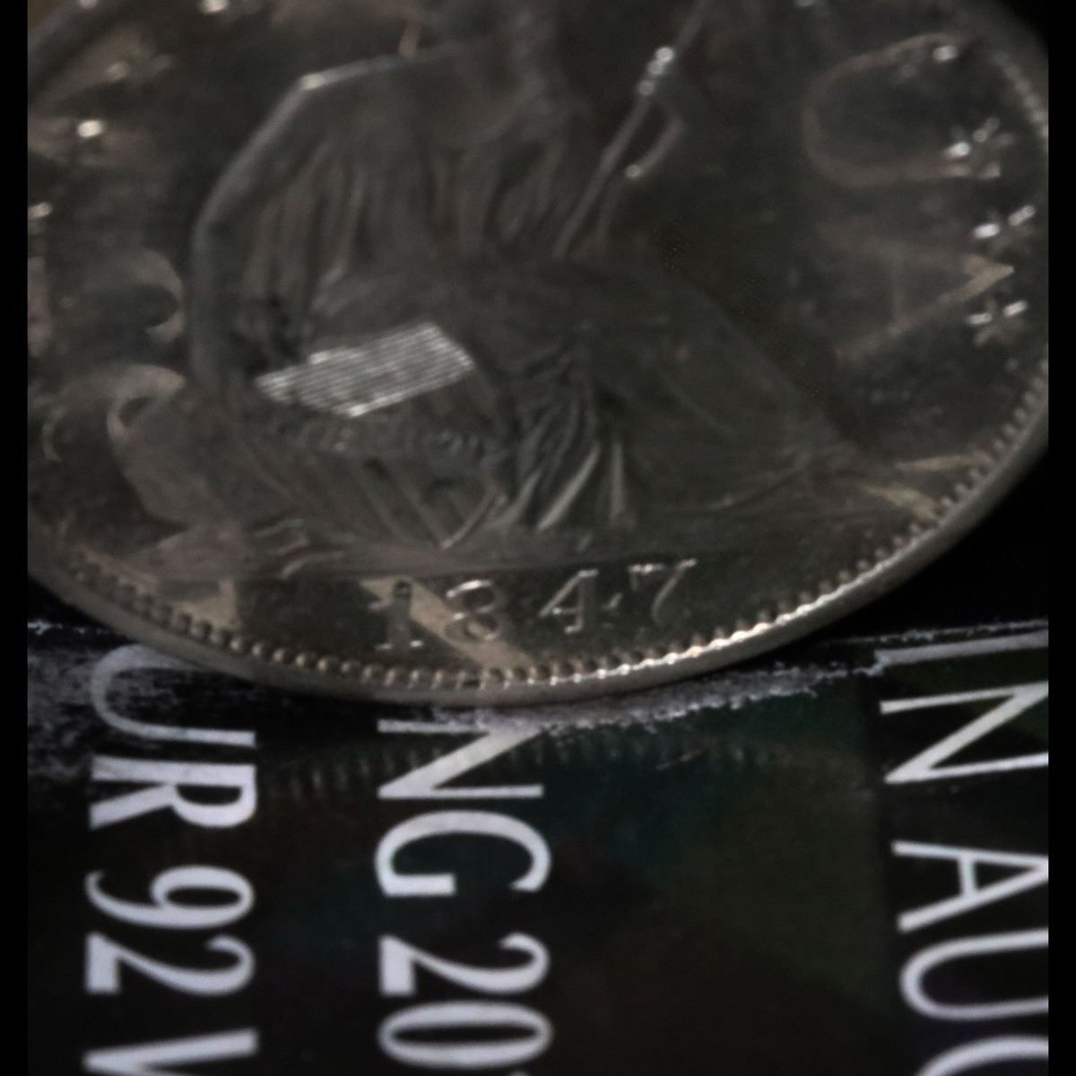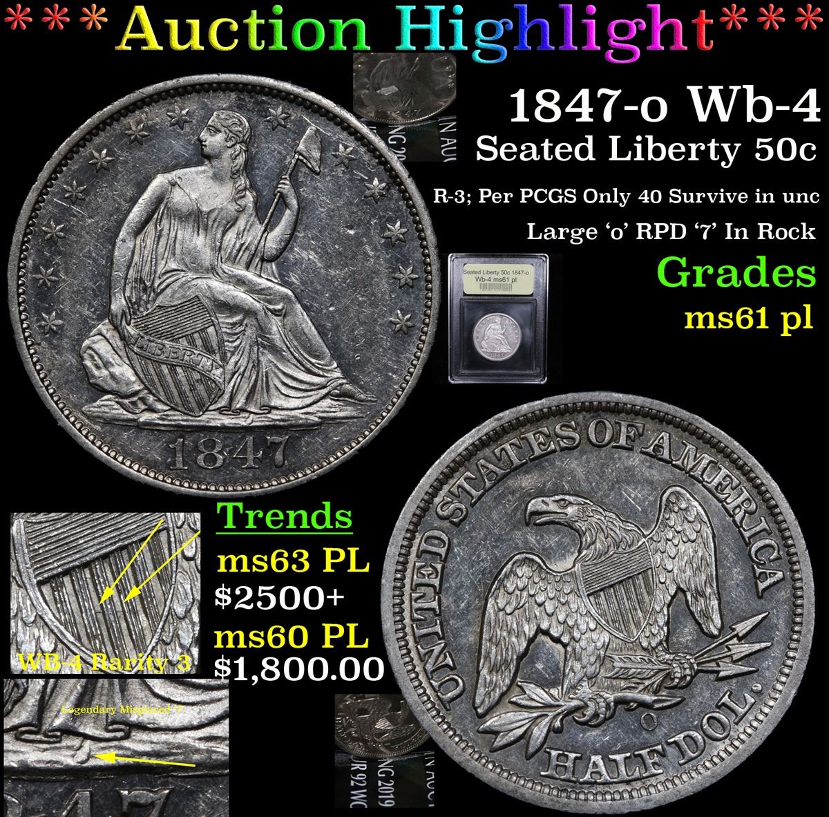 ***Auction Highlight*** 1847-o Wb-4 Seated Half Dollar 50c Graded Unc+ PL By USCG. Up for auction is an ultra rare 1847-o Liberty Seated Half in Proof Like. Per PCGS the 47-o has only 40 known surviving pieces in uncirculated condition. This example is the WB-4, which has the Repunched Date and the Large O, additionally it has what for years was called a misplaced 7 in the Rock that Miss Liberty sits on, but Bill Bugert disagrees, and thinks its a die like and not a 7. A Corey's Pick, Bid to Win, Don't let it get Away, you might not find its equal Coin. I give this coin my highest recommendation