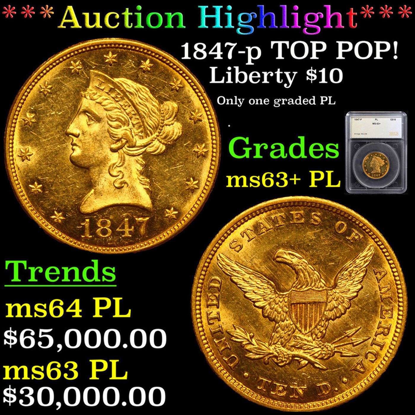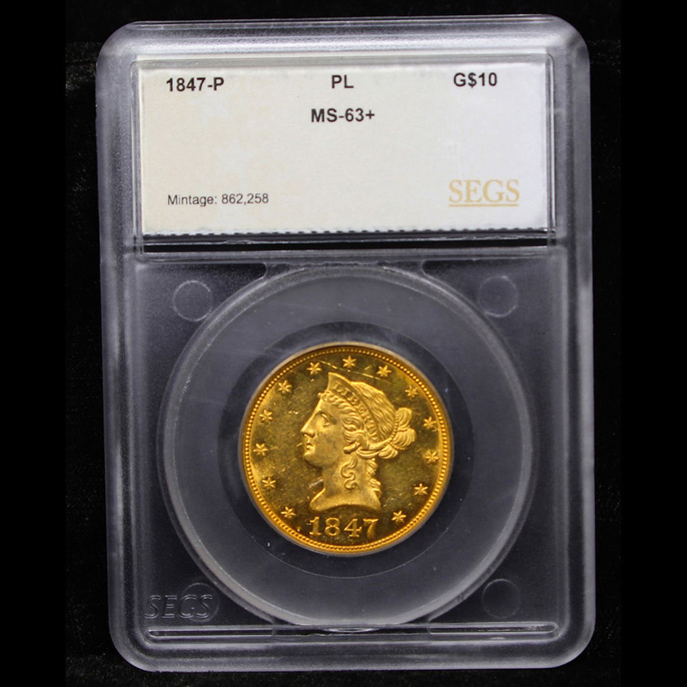 ***Auction Highlight*** 1847-p TOP POP! Gold Liberty Eagle 10 Graded ms63+ PL By SEGS. HIGHLIGHT OF THE AUCTION – Only 1847 $10 ever graded PL. WOW! Also it is within 1 half point of the finest known in not PL. A truly exceptional example from the early No Motto Liberty Head eagle series, this attractive coin displays vivid golden-orange patina. The finish is bright and satiny and the fields are fully-reflective. Fully struck with a remarkably smooth appearance, this premium quality coin would make an outstanding addition to an advanced gold type or date set. A quick study of the Population Reports shows a great concentration of coins in the EF-40 to AU-50 range, however, in Mint State it is a formidable condition rarity. One of the finest, most attractive examples that we have ever handled, and we recommend the strongest bids for this beautiful and conditionally rare coin. A Corey's Pick, Bid to Win, Don't let it get Away, you might not find its equal Coin. I give this coin my highest recommendation