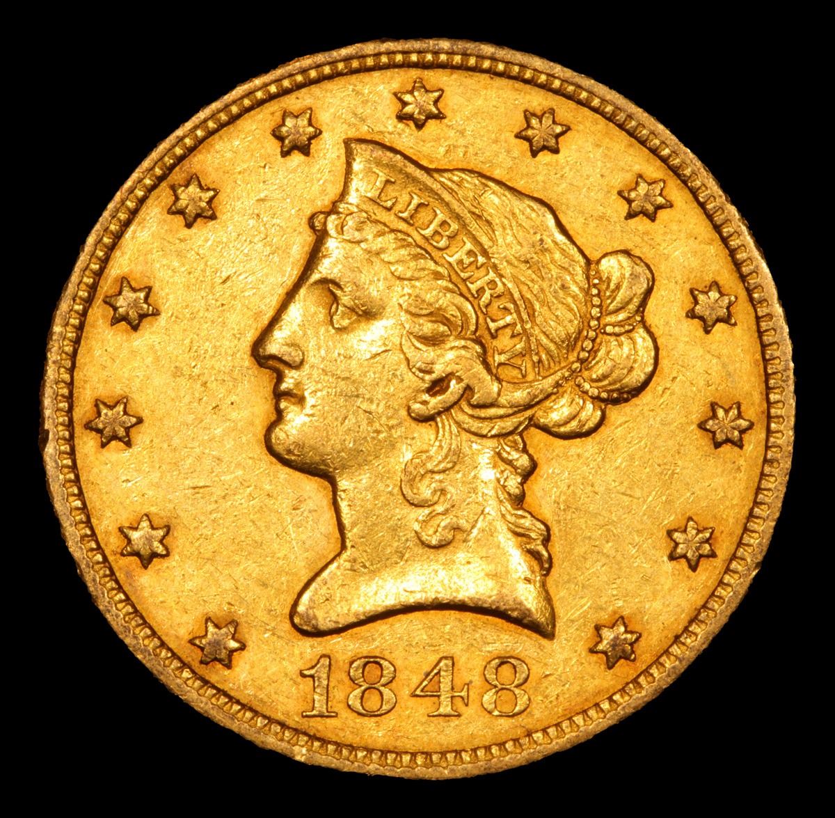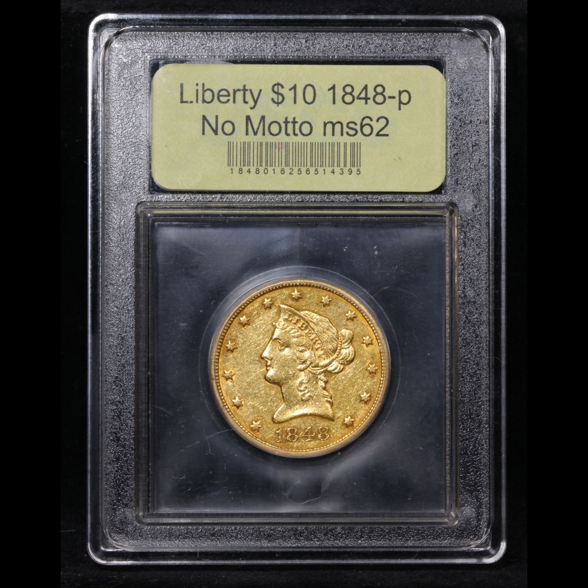 ***Auction Highlight*** 1848-p No Motto Gold Liberty Eagle $10 Graded Select Unc By USCG. Tied for 8th Finest Known. The condition rarity of the No Motto eagle type can be well illustrated by the 1848. This issue has a comparatively high mintage of 145,484 pieces but the survival rate is well under 1%, and it is likely that as few as 400-500 examples exist in total. This date is seriously undervalued in properly graded AU58, and it is rare in Uncirculated with fewer than a dozen pieces currently known. This Yellow gold example exhibits nice luster and average contact arks for the grade. A true Rarity. The No Motto $10 is Rare in every date in Mint State. A Corey's Pick, Bid to Win, Don't let it get Away, you might not find its equal Coin. I give this coin my highest recommendation