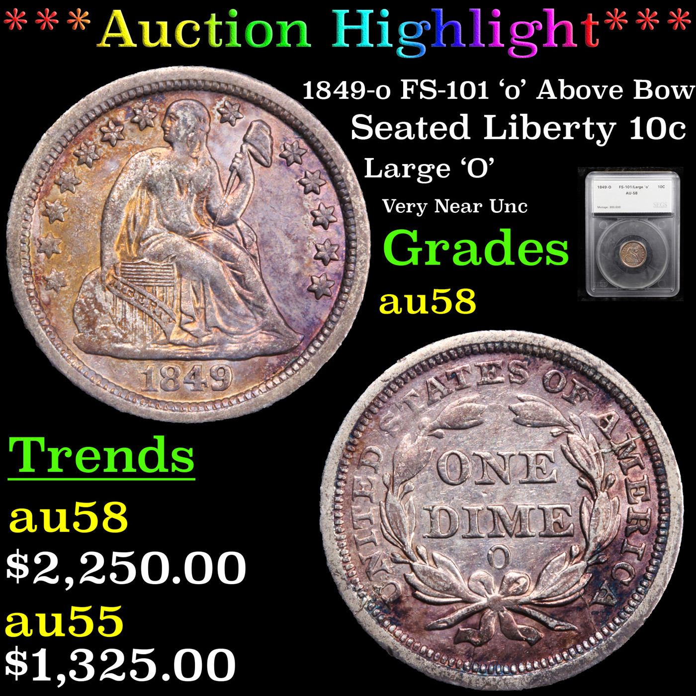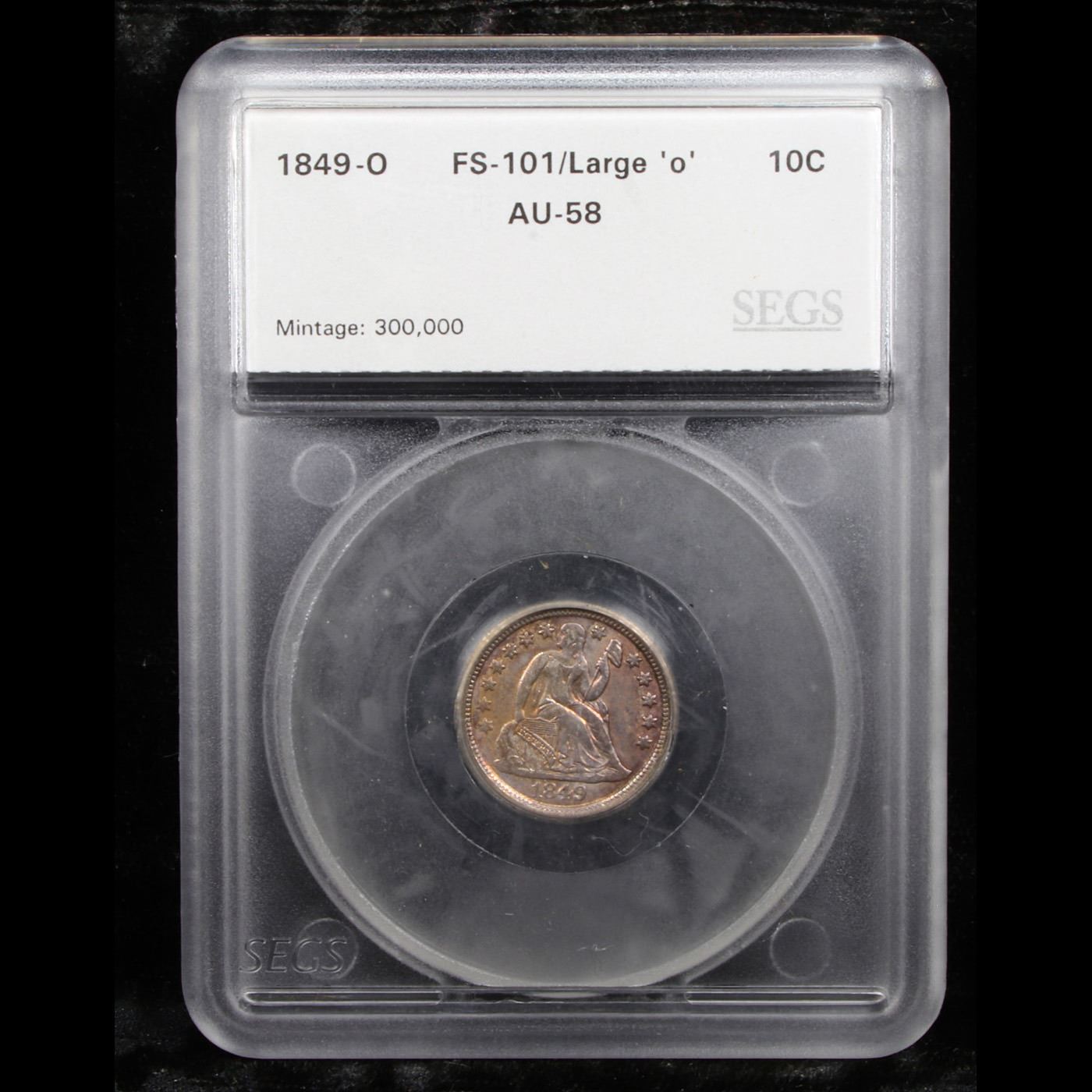***Auction Highlight*** 1849-o FS-101 'o' Above Bow Seated Liberty Dime 10c Graded au58 By SeGS. A Corey's Pick, Bid to Win, Don't let it get Away Coin