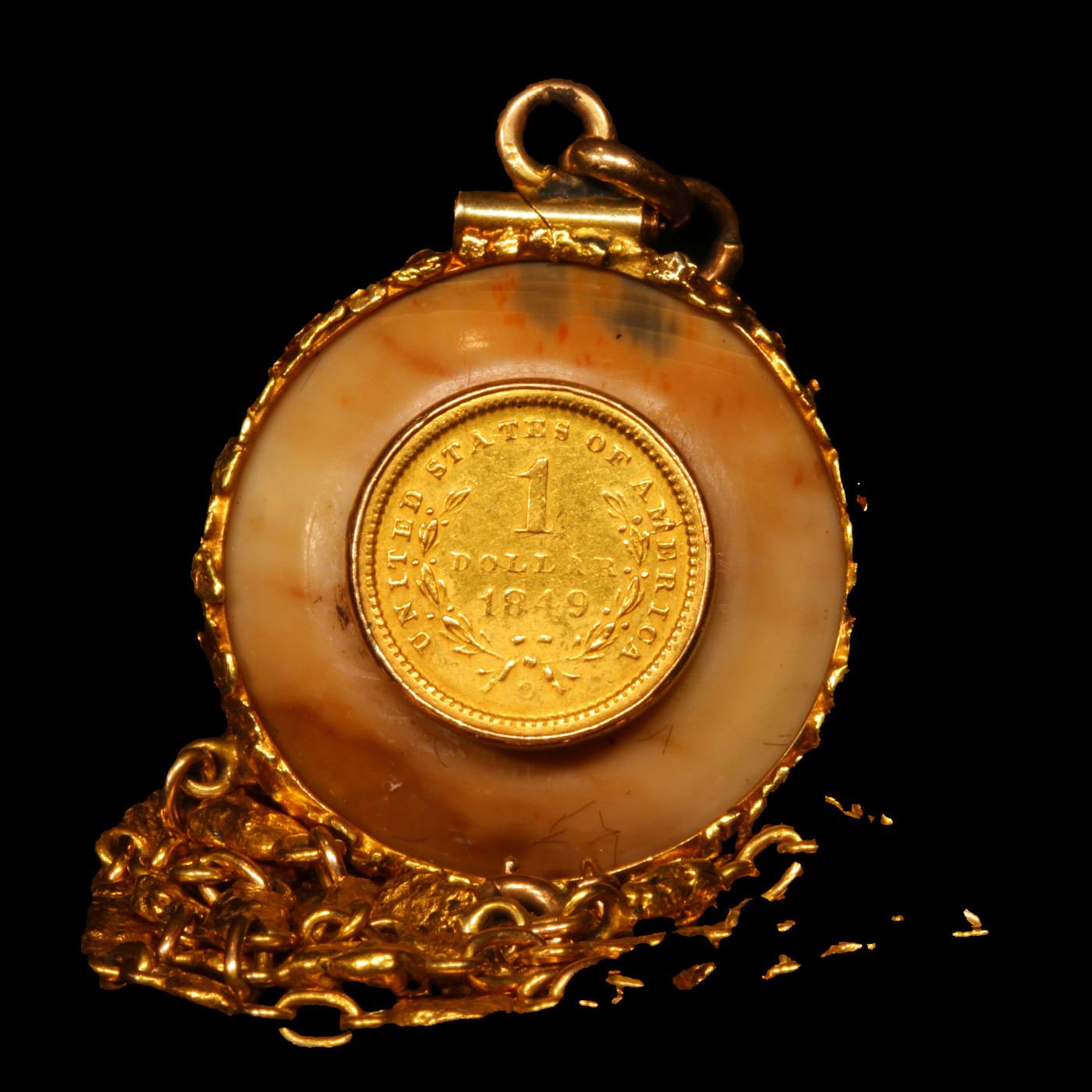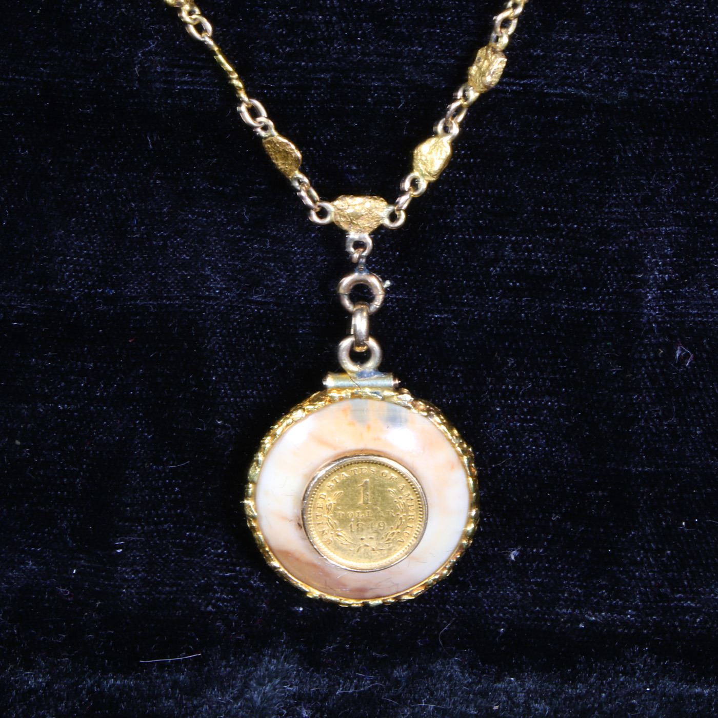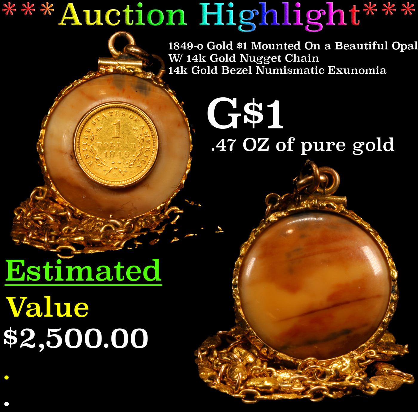 ***Auction Highlight*** 1849-o Gold $1 Mounted On a Beautiful Opal W/ 14k Gold Nugget Chain & 14k Gold Bezel Numismatic Exunomia Grades.