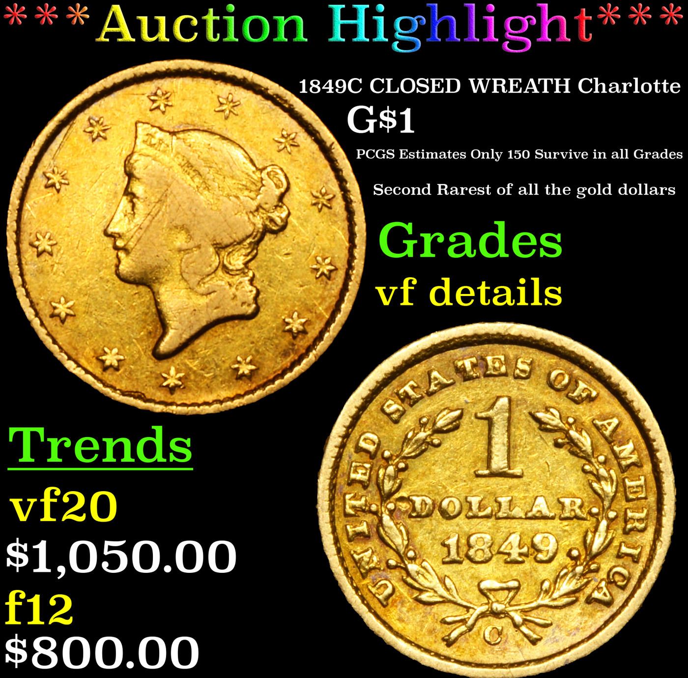 ***Auction Highlight*** 1849C CLOSED WREATH Charlotte Gold Dollar $1 Graded vf details BY USCG.