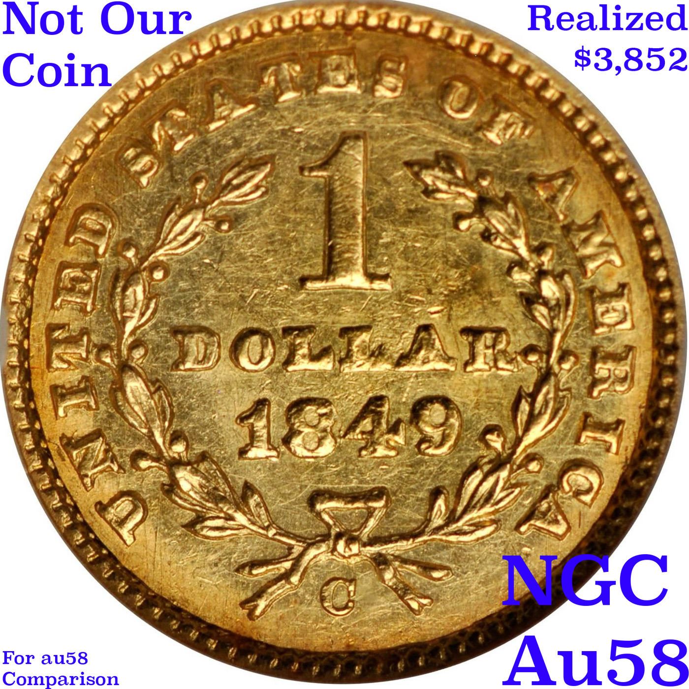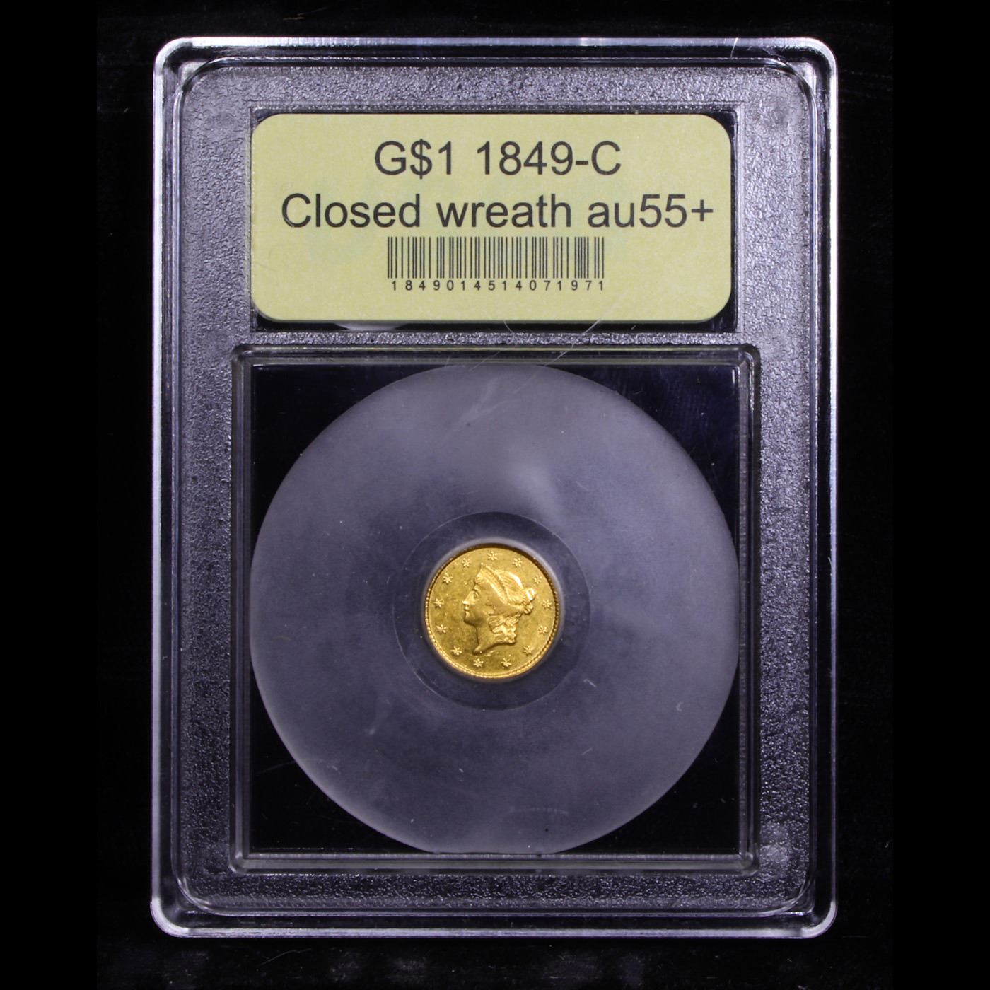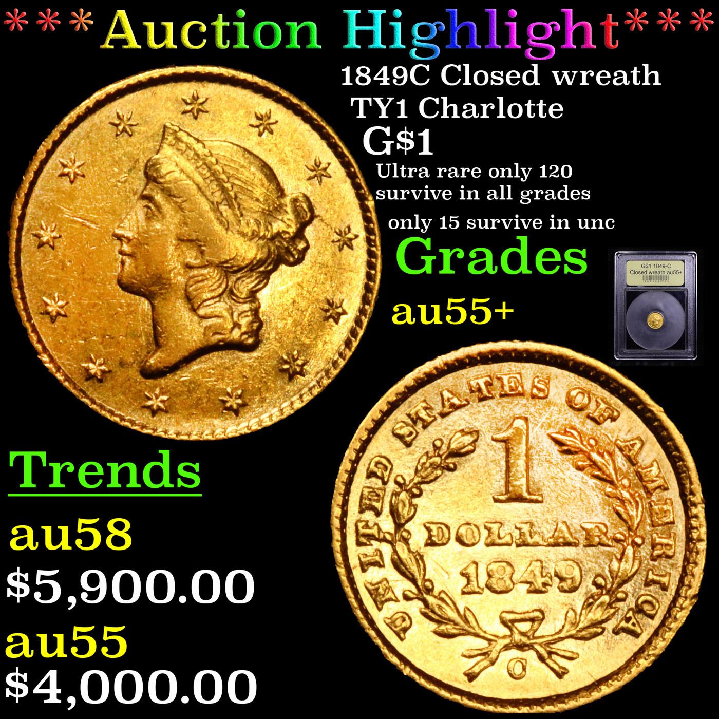 ***Auction Highlight*** 1849C Closed wreath TY1 Charlotte Gold Dollar $1 Graded Select au+ By USCG.        Variety 2-B. One variety is known to exist. The 1849-C Closed Wreath is the more available of the two '49-C Wreath varieties, but is still very scarce in its own right, especially in the AU55 and finer levels of preservation. This Choice AU specimen displays rich apricot-gold color with hints of underlying green, and is better struck than most seen. Minor circulation marks are visible on both sides. I have included 2 examples for your comparison, an au55 and an au58. A Corey's Pick, Bid to Win, Don't let it get Away, you might not find its equal Coin