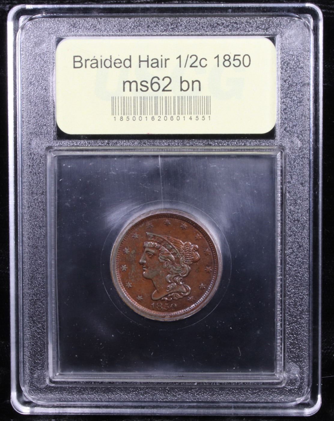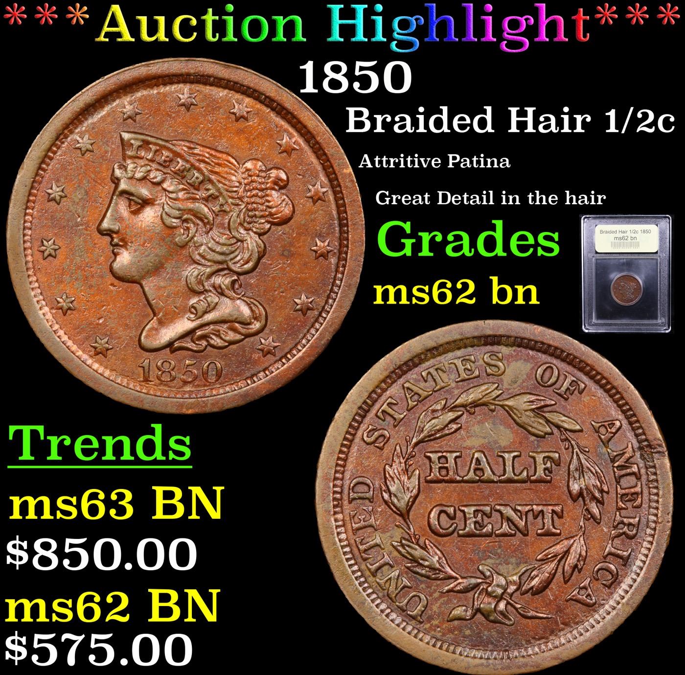 ***Auction Highlight*** 1850 Braided Hair Half Cent 1/2c Graded Select Unc BN By USCG. Per Ron Guth of PCGS : The Braided Hair half cents boast some of the lowest mintages of any U.S. coin types and are among the best values, as well. Every date in this type boasts a low mintage. By way of comparison, the mintage of the any Braided hair Half Cent is almost a fraction of the mintage of the 1909-S VDB Lincoln Cent (a far more valuable coin), making this an excellent value.