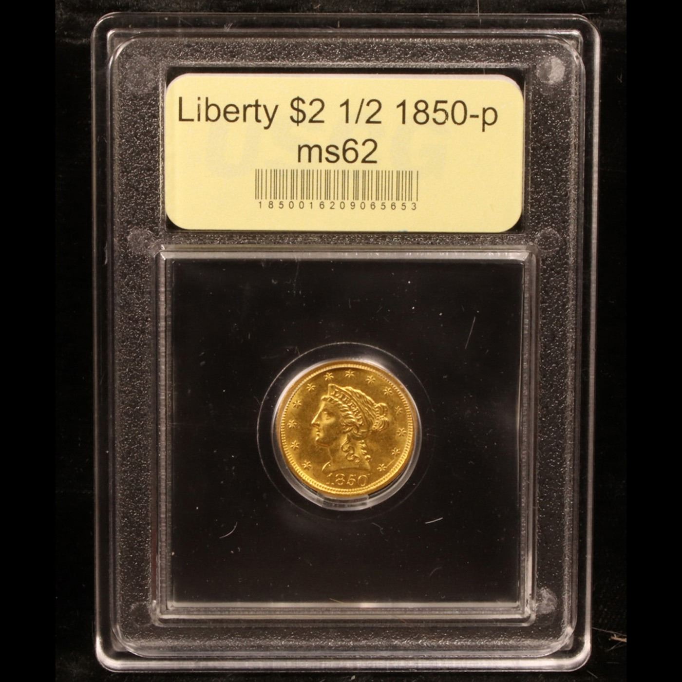 ***Auction Highlight*** 1850-p Gold Liberty Quarter Eagle $2 1/2 Graded Select Unc By USCG. The pale golden-wheat surfaces of this 1850 quarter eagle are enhanced by a sharp strike and satiny mint luster. With the discovery of gold in quantity in California the previous year, enough bullion began reaching the Philadelphia Mint for a generous mintage of 252,923 quarter eagles in 1850. This total set the record for the denomination up to that point in time, although it was soon dwarfed by the delivery of 1,372,748 pieces in 1851 as the Gold Rush continued. The 1850 is typically offered in VF, EF and AU grades. Few examples were spared circulation, and the issue is scarce to rare at all levels of Mint State preservation. A Corey's Pick, Bid to Win, Don't let it get Away Coin