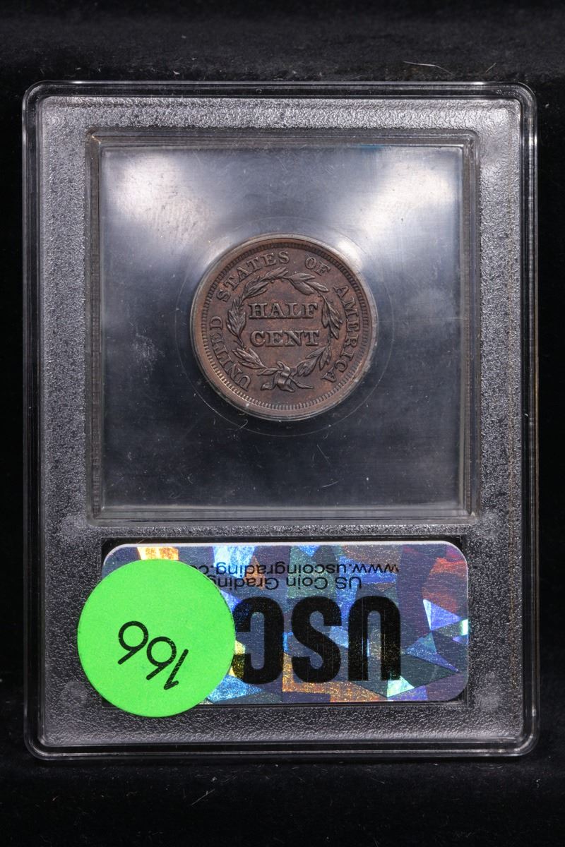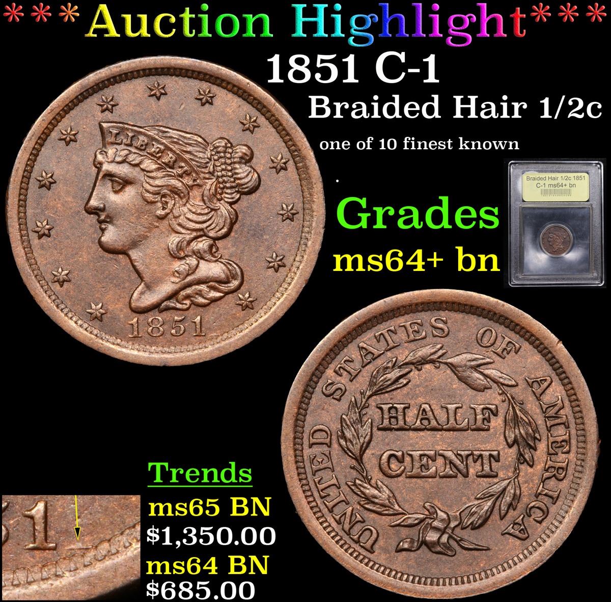 ***Auction Highlight*** 1851 C-1 Braided Hair Half Cent 1/2c Graded Choice+ Unc BN By USCG. 0 1851 1/2 C MS64+ Brown. C-1. The base of an extra 1 is visible to the right of the date. Fewer than 400 Mint State Brown examples exist, of which this Premium near Gem is one of the 10 finest known. Light to medium brown semi-glossy surfaces are imbued with whispers of light green, crimson, and violet. All of the design elements are exceptionally well defined, including the curl over Liberty's shoulder, which is often poorly struck on this issue. The surfaces are immaculately preserved, exhibiting no significant contact marks or unsightly spots. A simply wonderful coin that is sure to generate spirited bidding.
