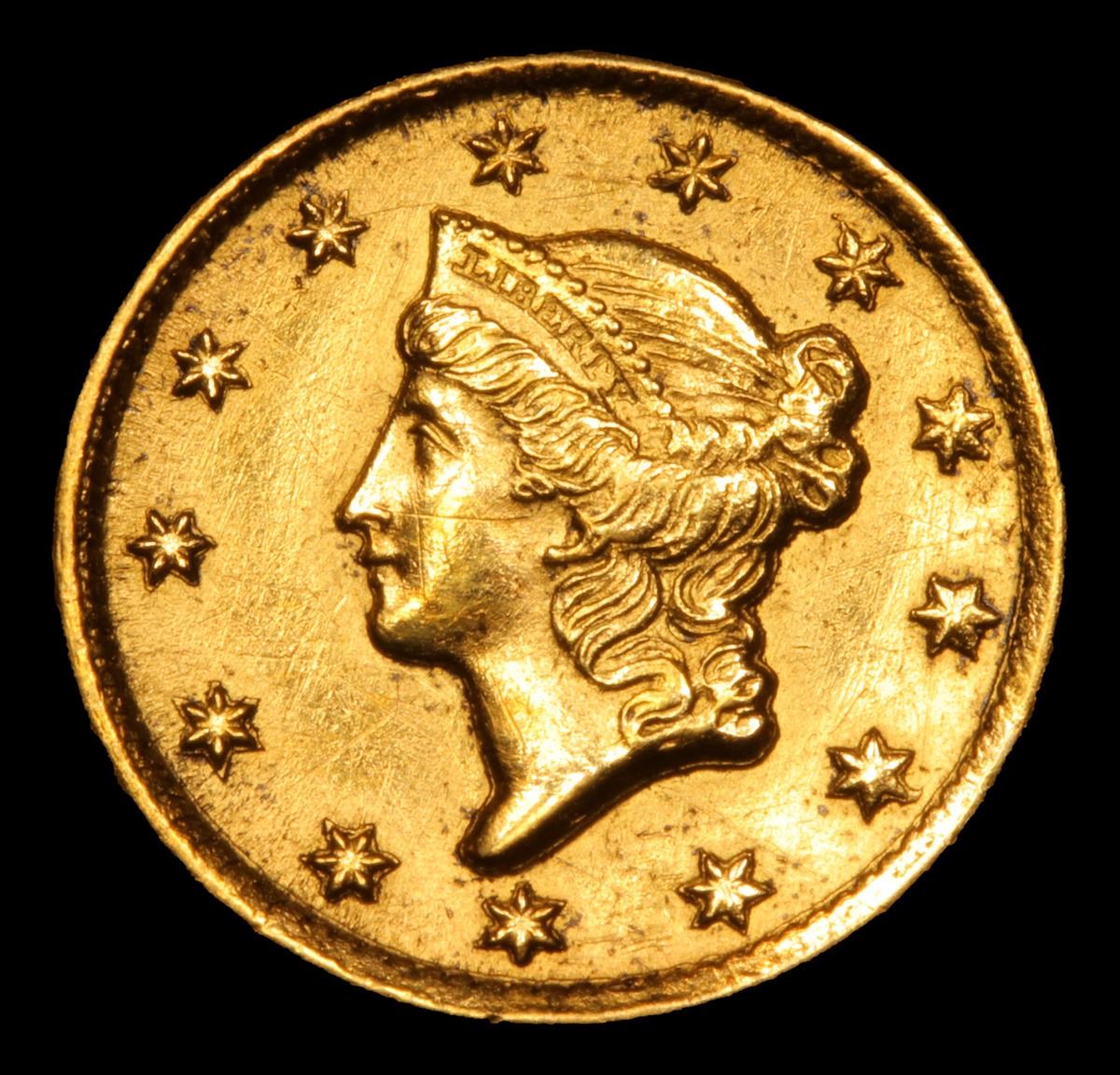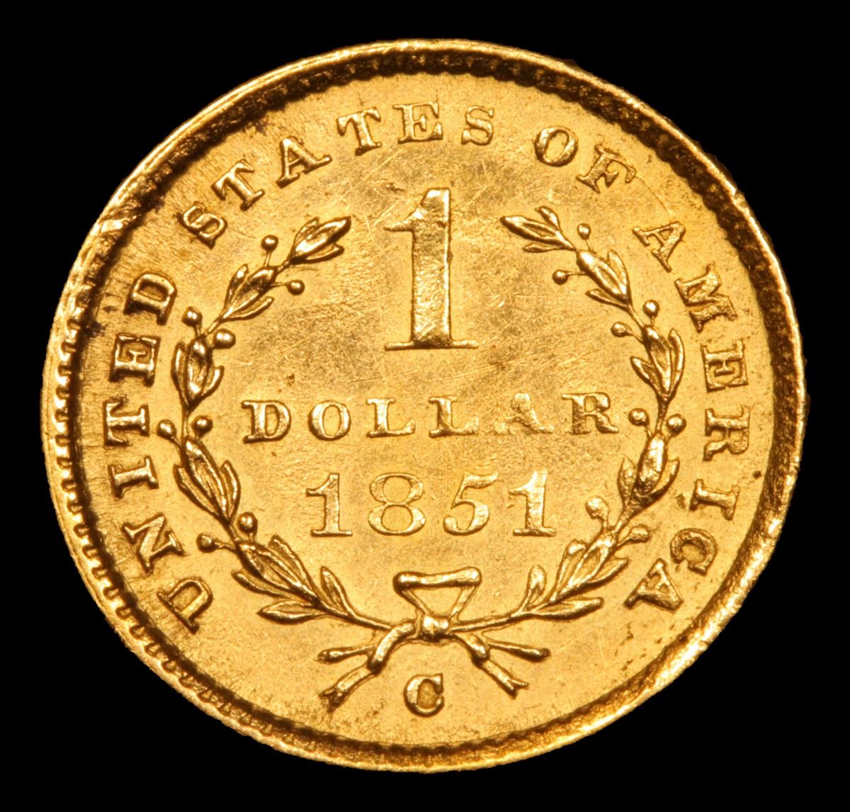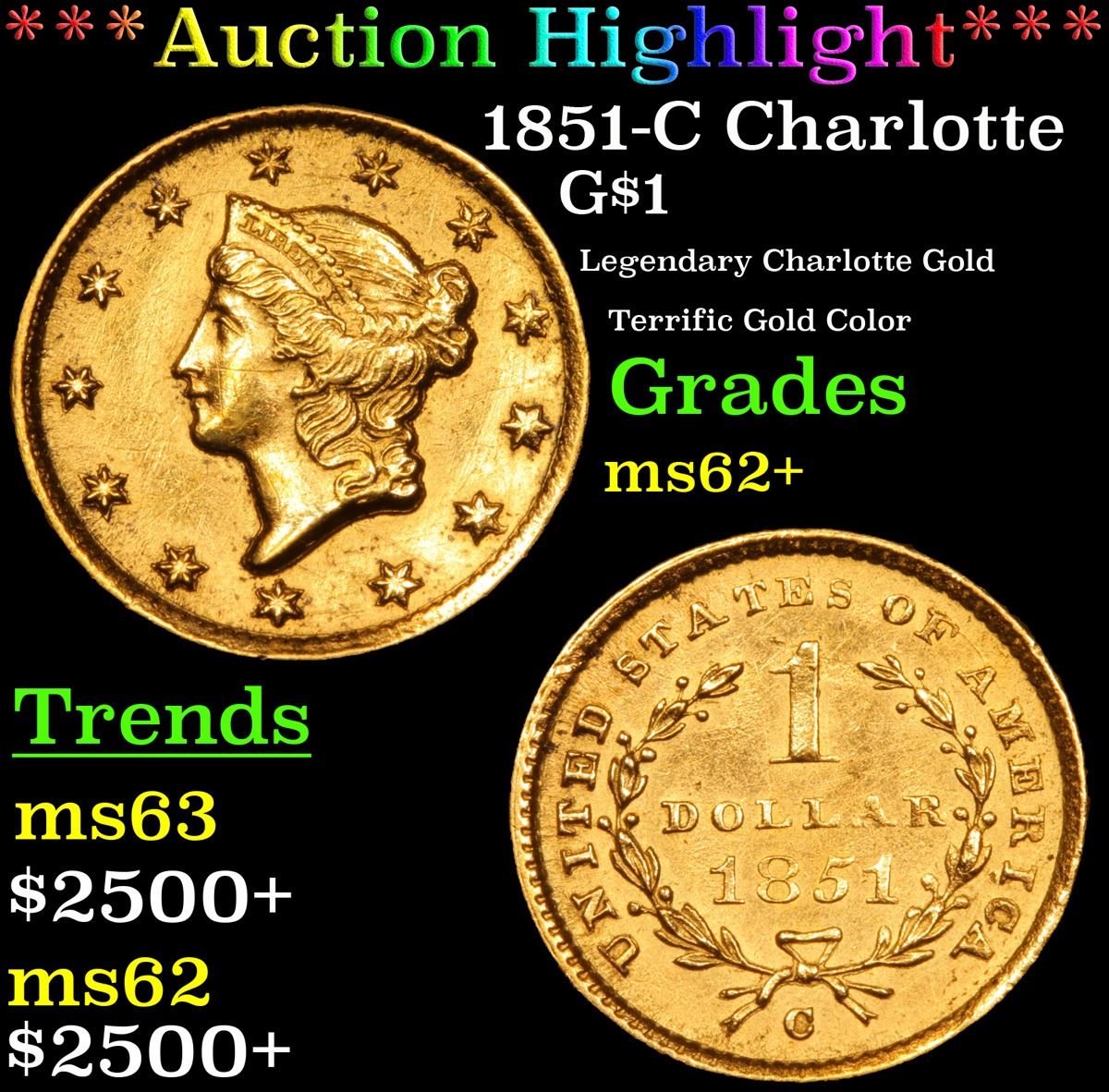 ***Auction Highlight*** 1851-C Charlotte Gold Dollar $1 Graded Select Unc BY USCG. Up for Auction is a Gold Dollar struck in 1851, in that legendary Charlotte Mint. Nice bright surfaces, terrific yellow gold color. It is the Variety 1, which can be determined by noting the 1 in the date centered under the o in dollar, and the die break through the of and Am. A terrific addition to your collection. A Corey's Pick, Bid to Win Coin
