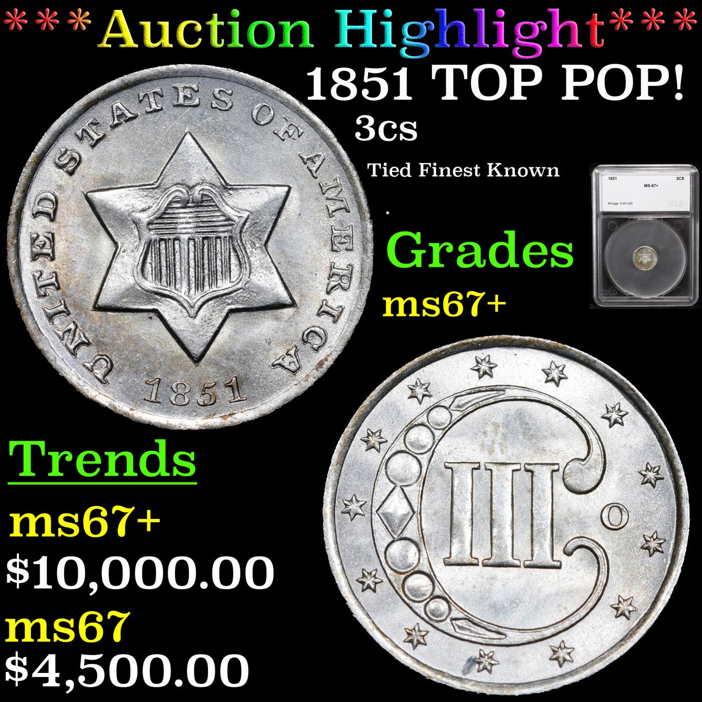 ***Auction Highlight*** 1851 TOP POP! Three Cent Silver 3cs Graded ms67+ By SEGS. A Corey's Pick, Bid to Win, Don't let it get Away, you might not find its equal Coin. I give this coin my highest recommendation