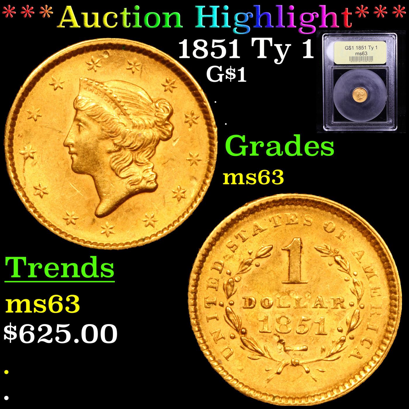 ***Auction Highlight*** 1851 Ty 1 Gold Dollar $1 Graded Select Unc By USCG.