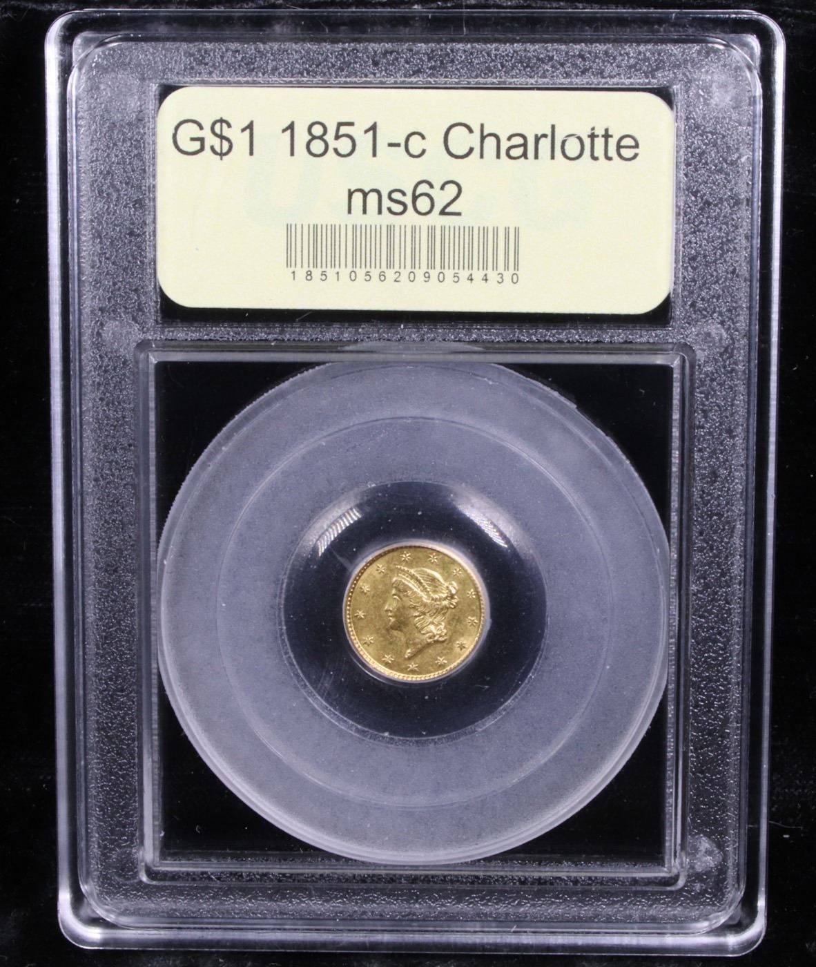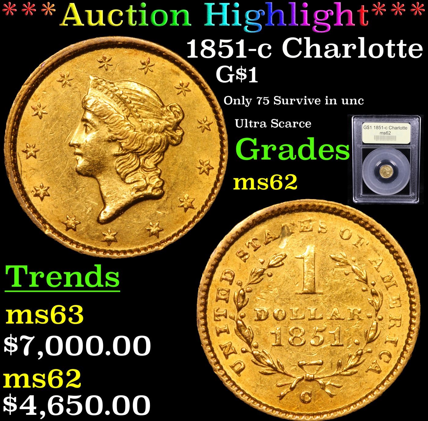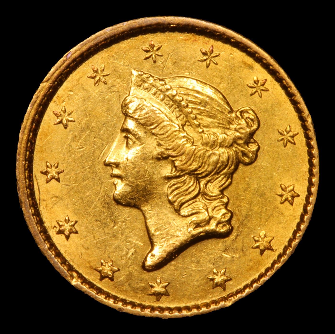 ***Auction Highlight*** 1851-c Charlotte Gold Dollar $1 Graded Select Unc By USCG. This lovely uncirculated example has blended olive and orange-gold patina to satiny surfaces. Equally well preserved, both sides are overall smooth but for one stray mark on the reverse.. A bold to sharp strike with strong luster for this important Charlotte Mint condition rarity. The gold coins produced at the short-lived Charlotte Mint have been in constant demand by numismatists and scholars alike for generations.. As with many issues of the Charlotte Mint, quality can vary with bold strikes being uncommon, and many examples today are found impaired or heavily worn. PCGS estimates a mere 75 uncirculated examples have survived the ravages of time. A delight for any specialist of Charlotte gold. A Corey's Pick, Bid to Win, Don't let it get Away, you might not find its equal Coin. I give this coin my highest recommendation