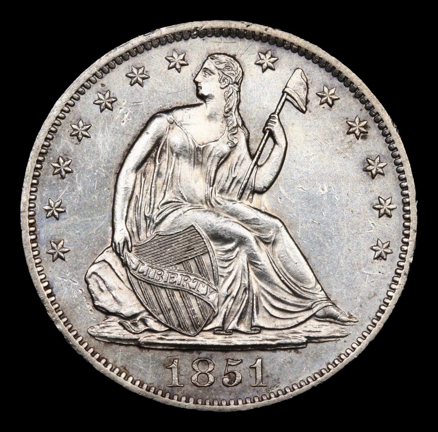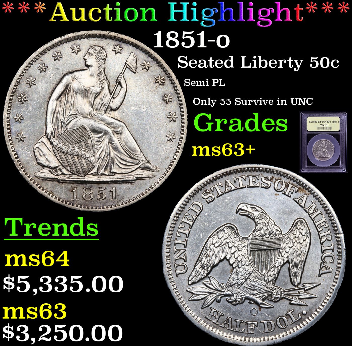 ***Auction Highlight*** 1851-o Seated Half Dollar 50c Graded Select+ Unc By USCG. Sharply struck throughout, with shimmering mint luster and virtually untoned silver-grey color across both sides. The nicely preserved surfaces are free of distractions