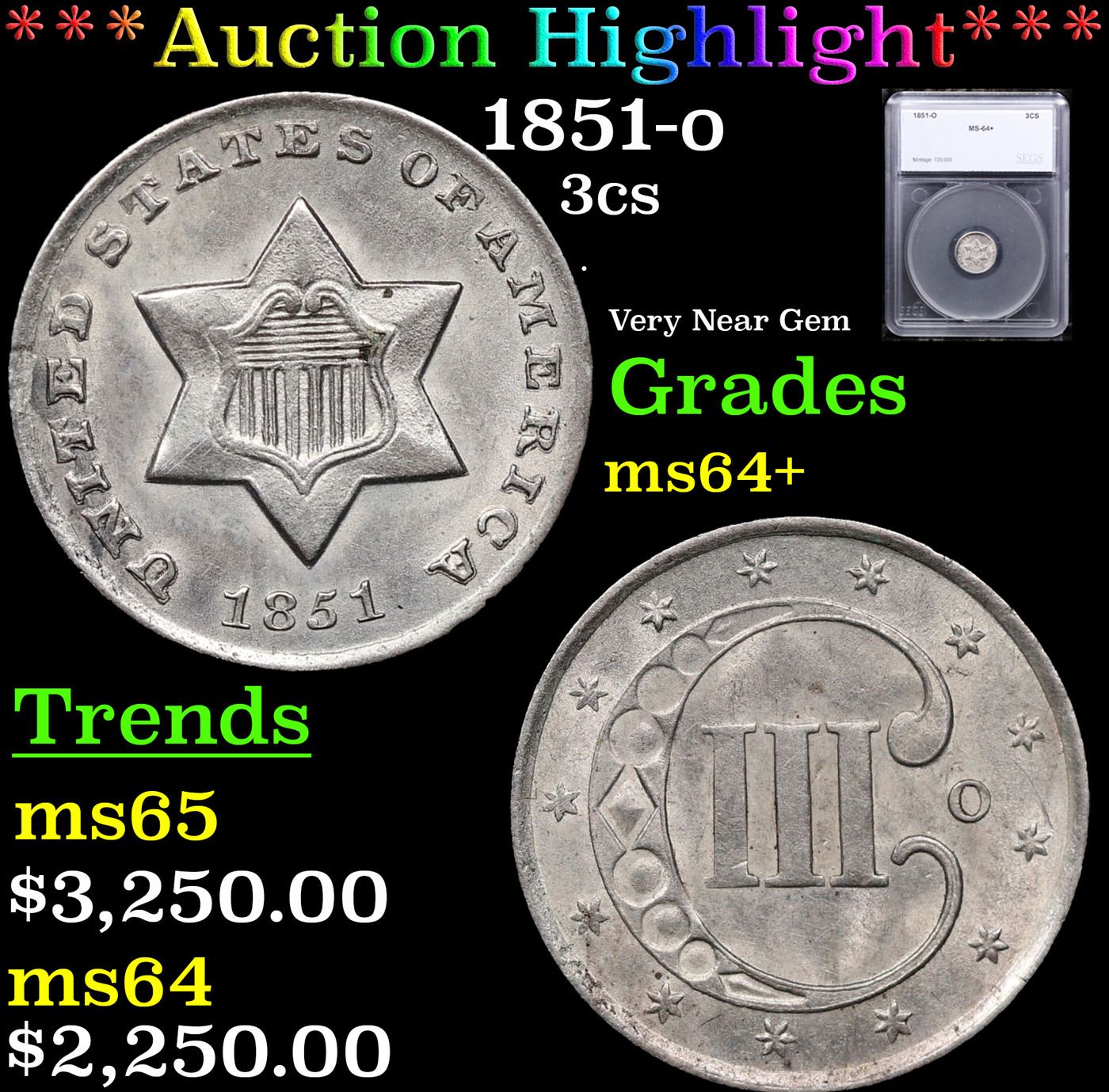 ***Auction Highlight*** 1851-o Three Cent Silver 3cs Graded ms64+ By SEGS.