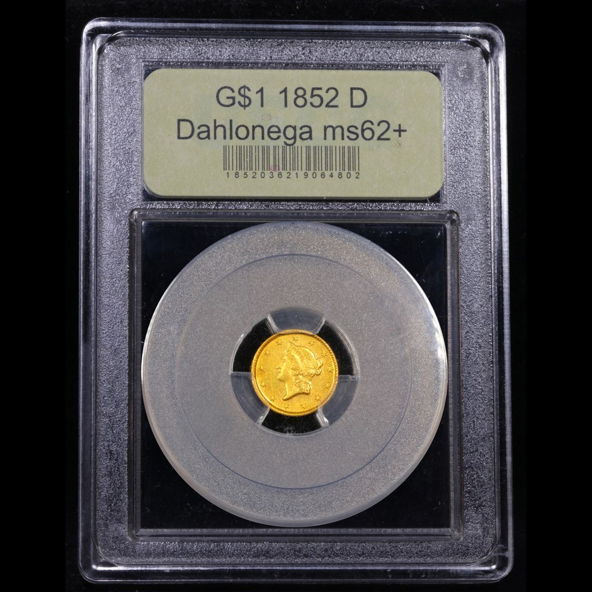 ***Auction Highlight*** 1852 D Dahlonega Gold Dollar $1 Graded Select Unc By USCG. Up for Auction is a Numismatic Rarity. A 1852-d Dahlonega $1 Gold. It Holds the Lone Spot at 2nd Finest Known behind the Elisburg Example. And in my opinion, it is superior to that legendary pedigree. I have included a picture of the lone ms63 as well as two ms62 examples for your comparison, Variety 4-F. The only variety of the year. Struck from strongly clashed and lapped dies, as on all known examples. The diagnostic die scratch on the reverse past the second A in AMERICA is plainly visible. This is one of the best struck 1852-D gold dollars known. In spite of the fact that the dies had severely clashed, the details seen in the center of both obverse and reverse are extremely sharp, with full, individually defined curls on the head of Liberty, complete radial lines on the stars, and a sharp date.. The surfaces show no readily distinguishable abrasions, just a host of clash marks and roughness in the die as made. There are multiple clash marks in the left obverse field, but this coin appears to have been struck from a reasonably early die state. The luster is frosty and far above average for the issue. Most 1852-D gold dollars are worn to the point that little natural luster remains, and the higher grade examples that exist usually have a dull, grainy texture. On this piece, there are splashes of intense orange-gold color in center of the obverse and around the stars; the reverse shows deeper and somewhat more even color that is a bit darker in hue near the 1 in the denomination. The 1852-D has about 100 pieces known, with perhaps seven to nine of these grading Uncirculated. Nearly all of these survivors are in the MS60 to MS61 range A Corey's Pick, Bid to Win, Don't let it get Away, you might not find its equal Coin. I give this coin my highest recommendation