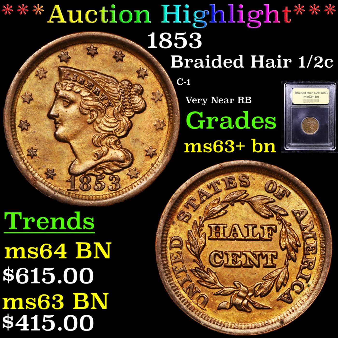 ***Auction Highlight*** 1853 Braided Hair Half Cent 1/2c Graded Select+ Unc BN By USCG. Per Ron Guth of PCGS : The Braided Hair half cents boast some of the lowest mintages of any U.S. coin types and are among the best values, as well. Every date in this type boasts a low mintage. By way of comparison, the mintage of the any Braided hair Half Cent is almost a fraction of the mintage of the 1909-S VDB Lincoln Cent (a far more valuable coin), making this an excellent value. A Corey's Pick, Bid to Win Coin
