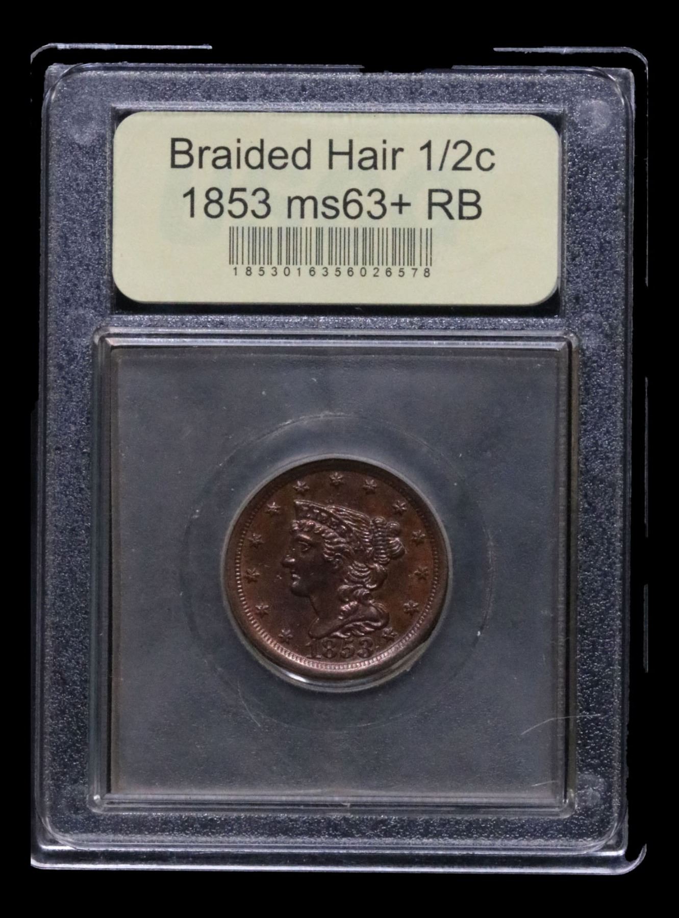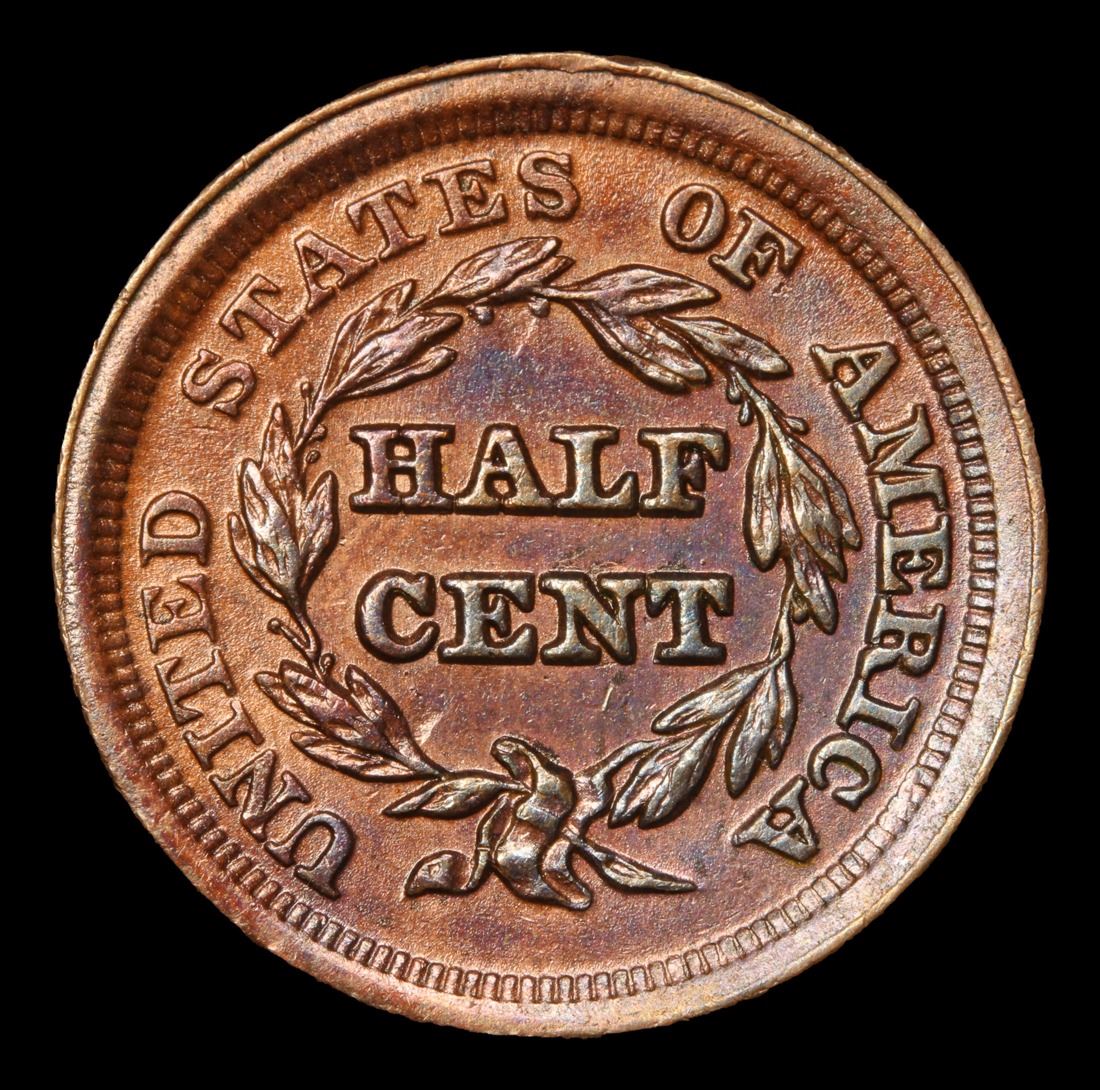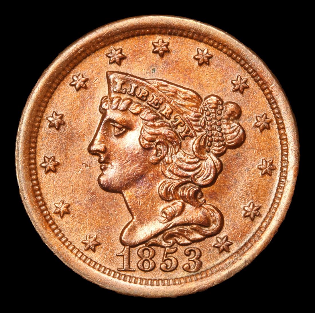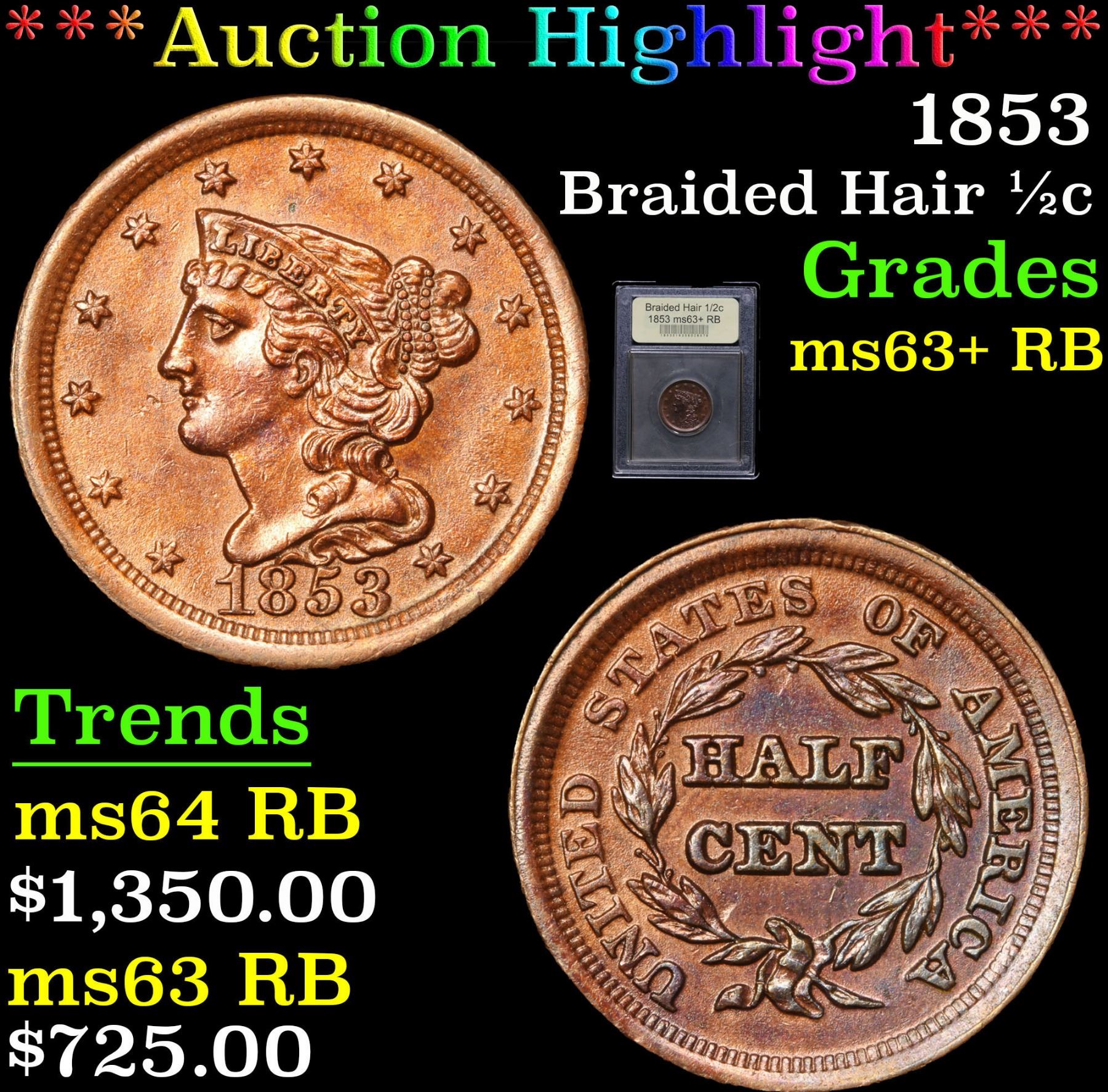 ***Auction Highlight*** 1853 Braided Hair Half Cent 1/2c Graded Select+ Unc RB By USCG. Per Ron Guth of PCGS : The Braided Hair half cents boast some of the lowest mintages of any U.S. coin types and are among the best values, as well. Every date in this type boasts a low mintage. By way of comparison, the mintage of the any Braided hair Half Cent is almost a fraction of the mintage of the 1909-S VDB Lincoln Cent (a far more valuable coin), making this an excellent value. A Corey's Pick, Bid to Win, Don't let it get Away, you might not find its equal Coin
