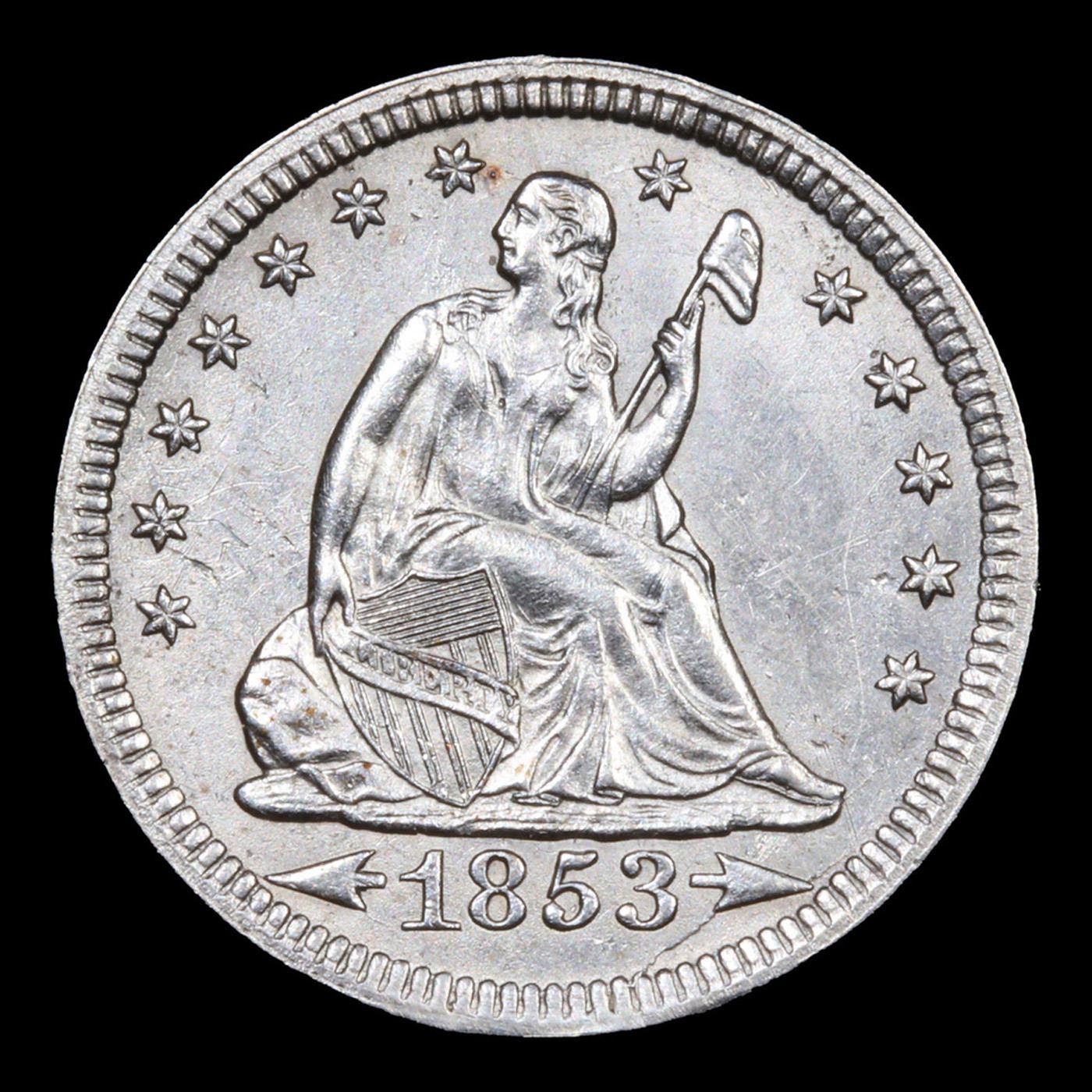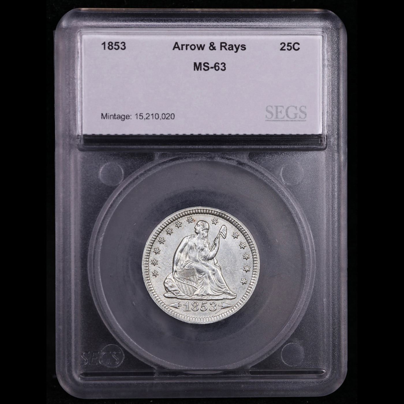 ***Auction Highlight*** 1853 arrow & rays Seated Liberty Quarter 25c Graded ms63 By SEGS. A Key Date's Pick, Bid to Win, Don't let it get Away Coin