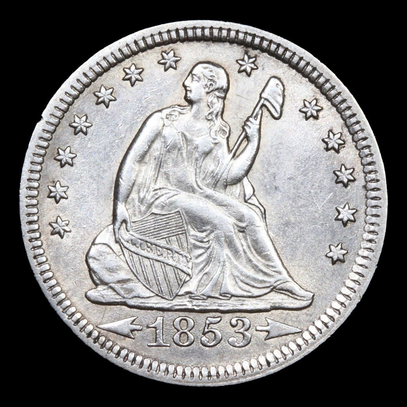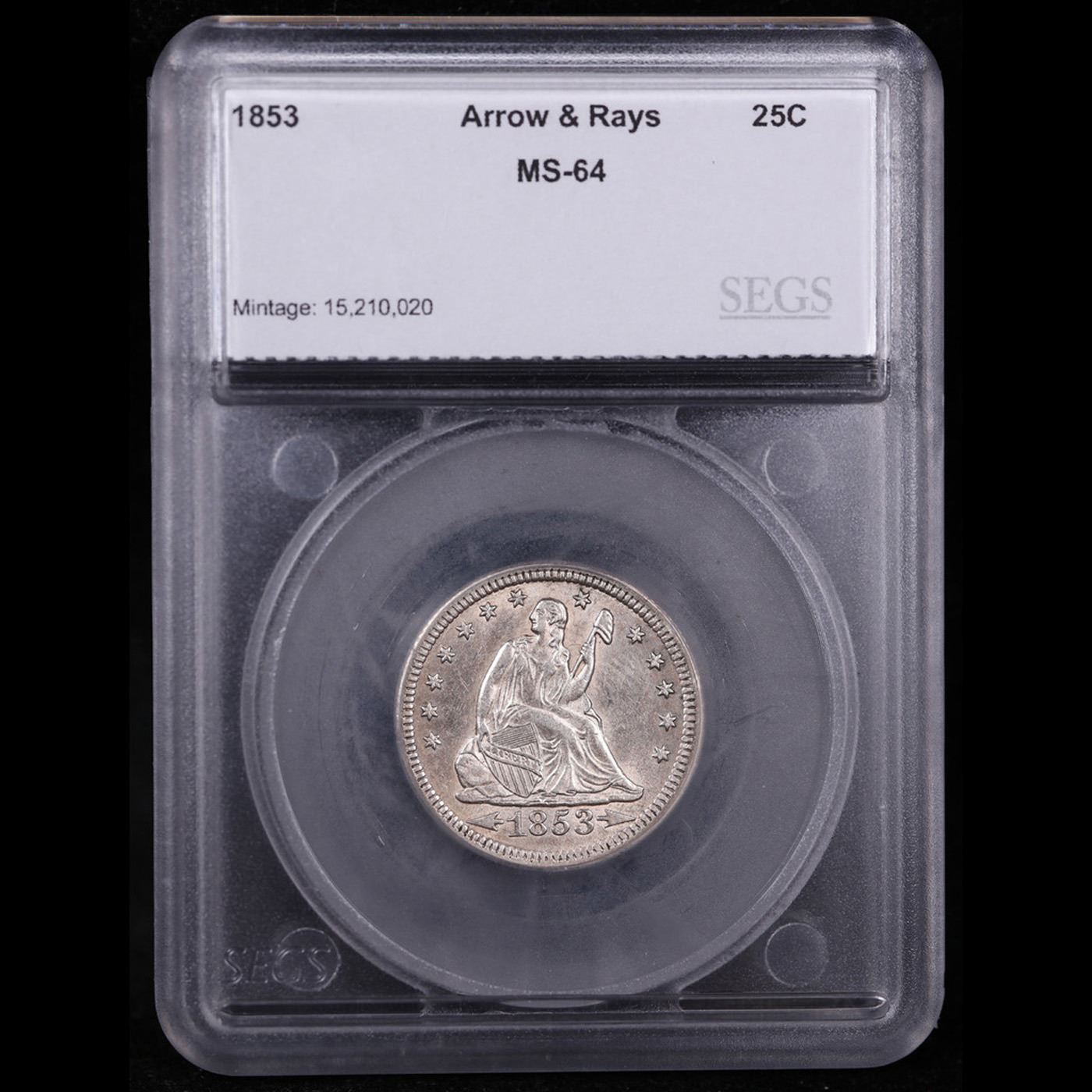 ***Auction Highlight*** 1853 arrow & rays Seated Liberty Quarter 25c Graded ms64 By SEGS. A Key Date's Pick, Bid to Win, Don't let it get Away, you might not find its equal Coin
