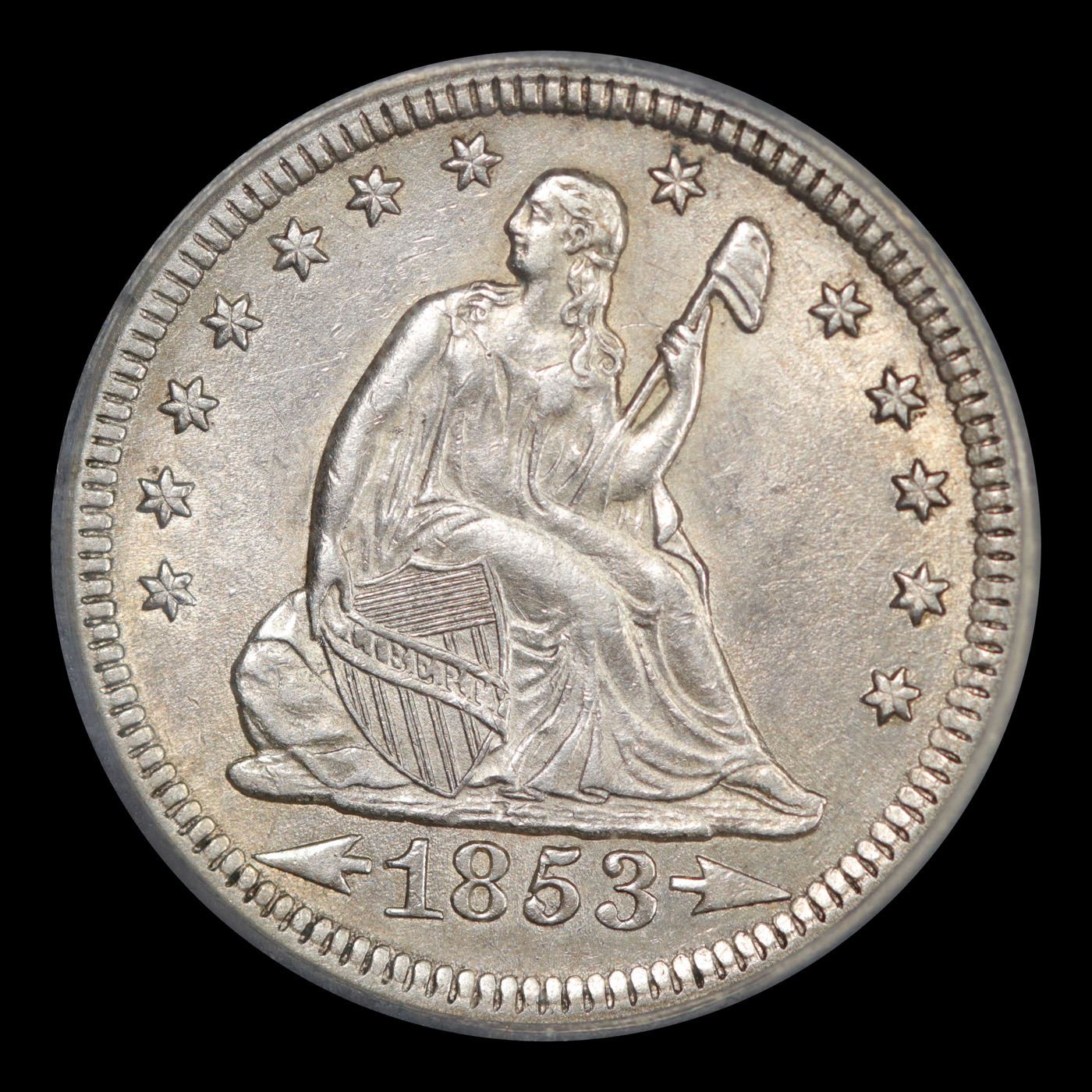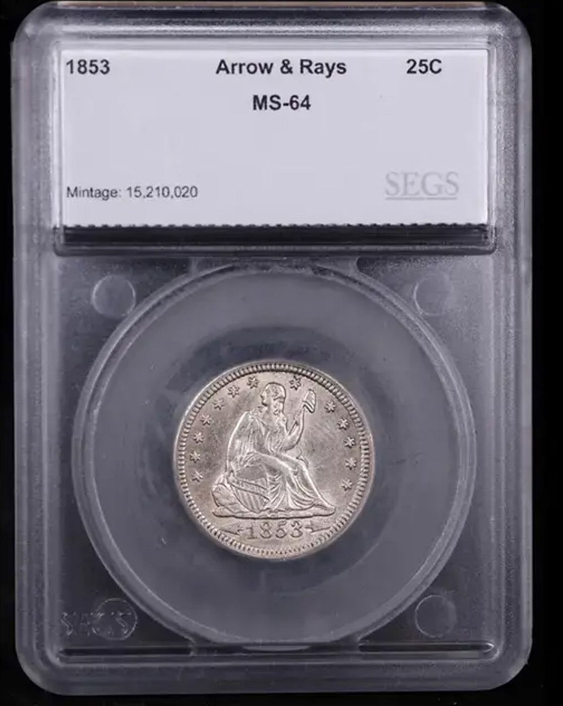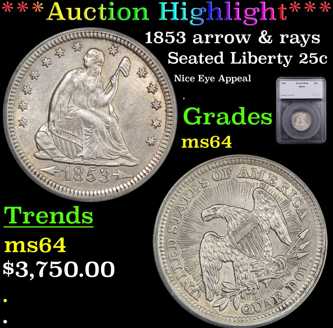 ***Auction Highlight*** 1853 arrow & rays Seated Liberty Quarter 25c Graded ms64 By SEGS. A Key Date's Pick, Bid to Win, Don't let it get Away, you might not find its equal Coin