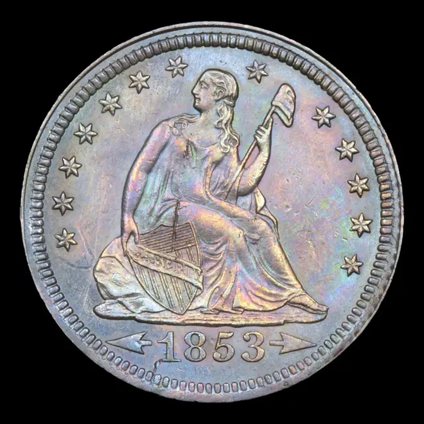 ***Auction Highlight*** 1853 arrow & rays Seated Liberty Quarter Rainbow Toned 25c Graded Select+ Un