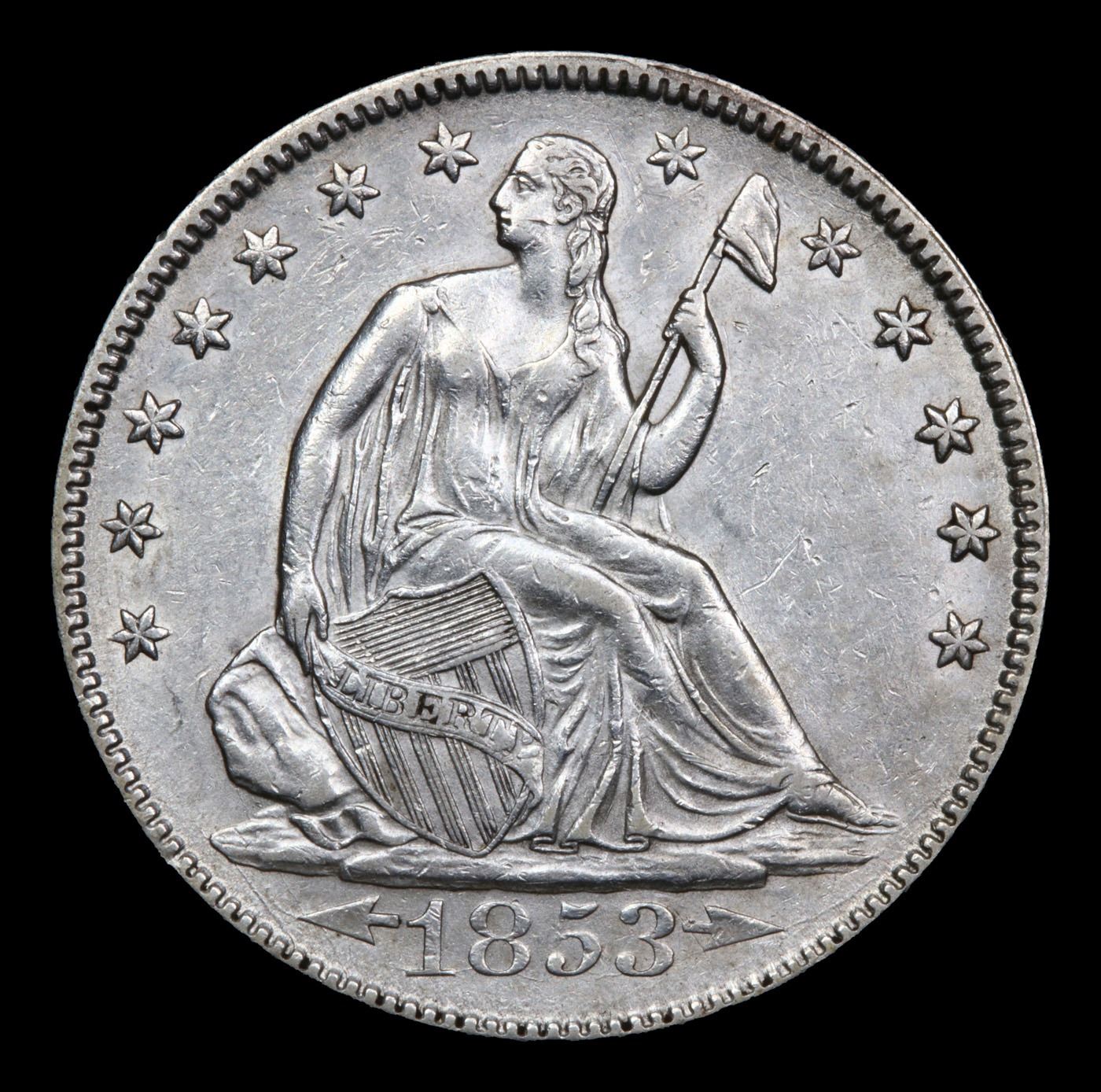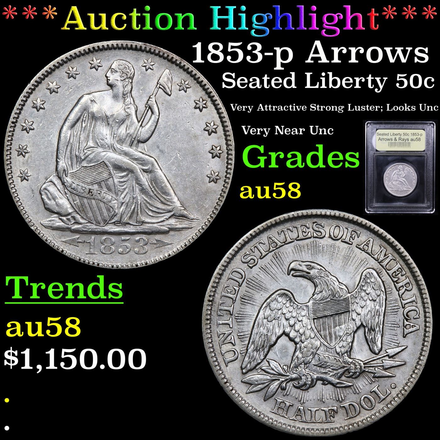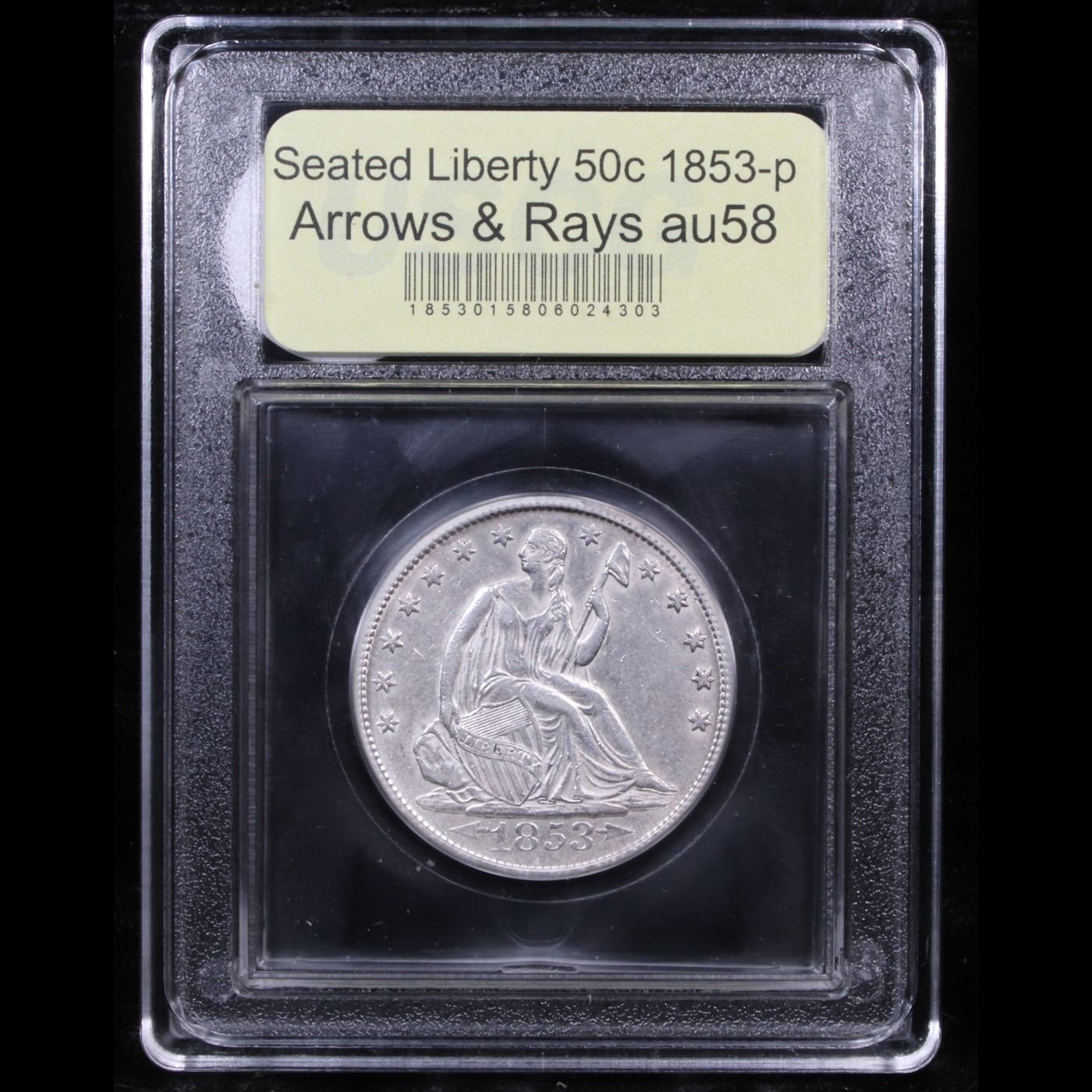 ***Auction Highlight*** 1853-p Arrows & Rays Seated Half Dollar 50c Graded Choice AU/BU Slider By US