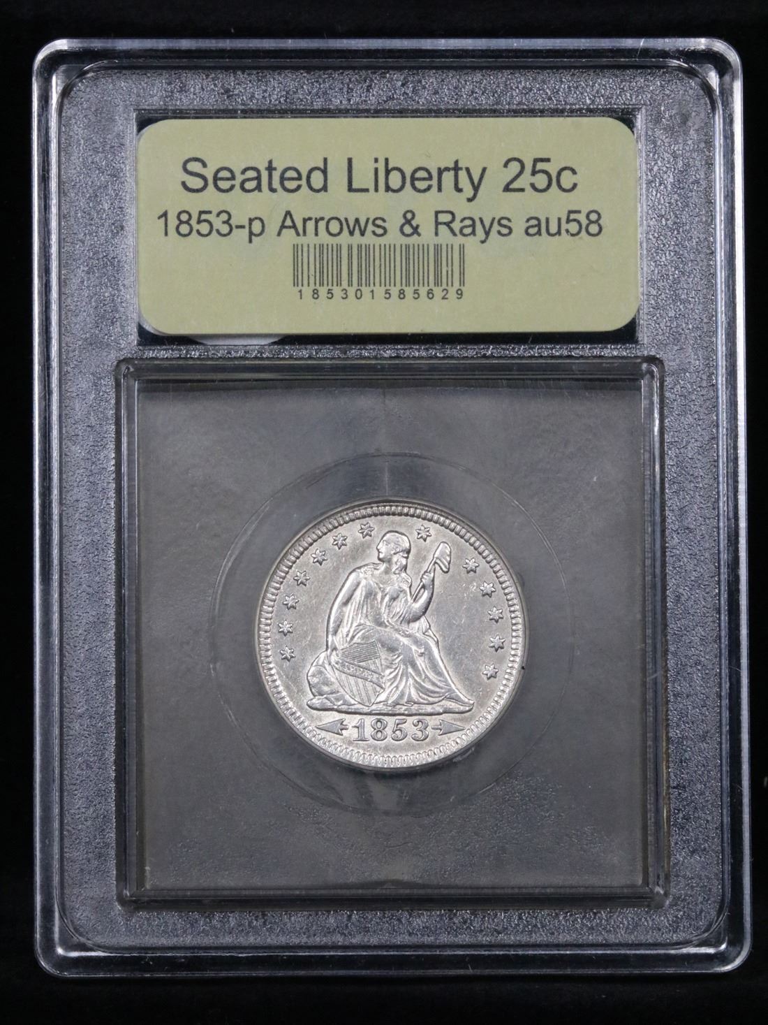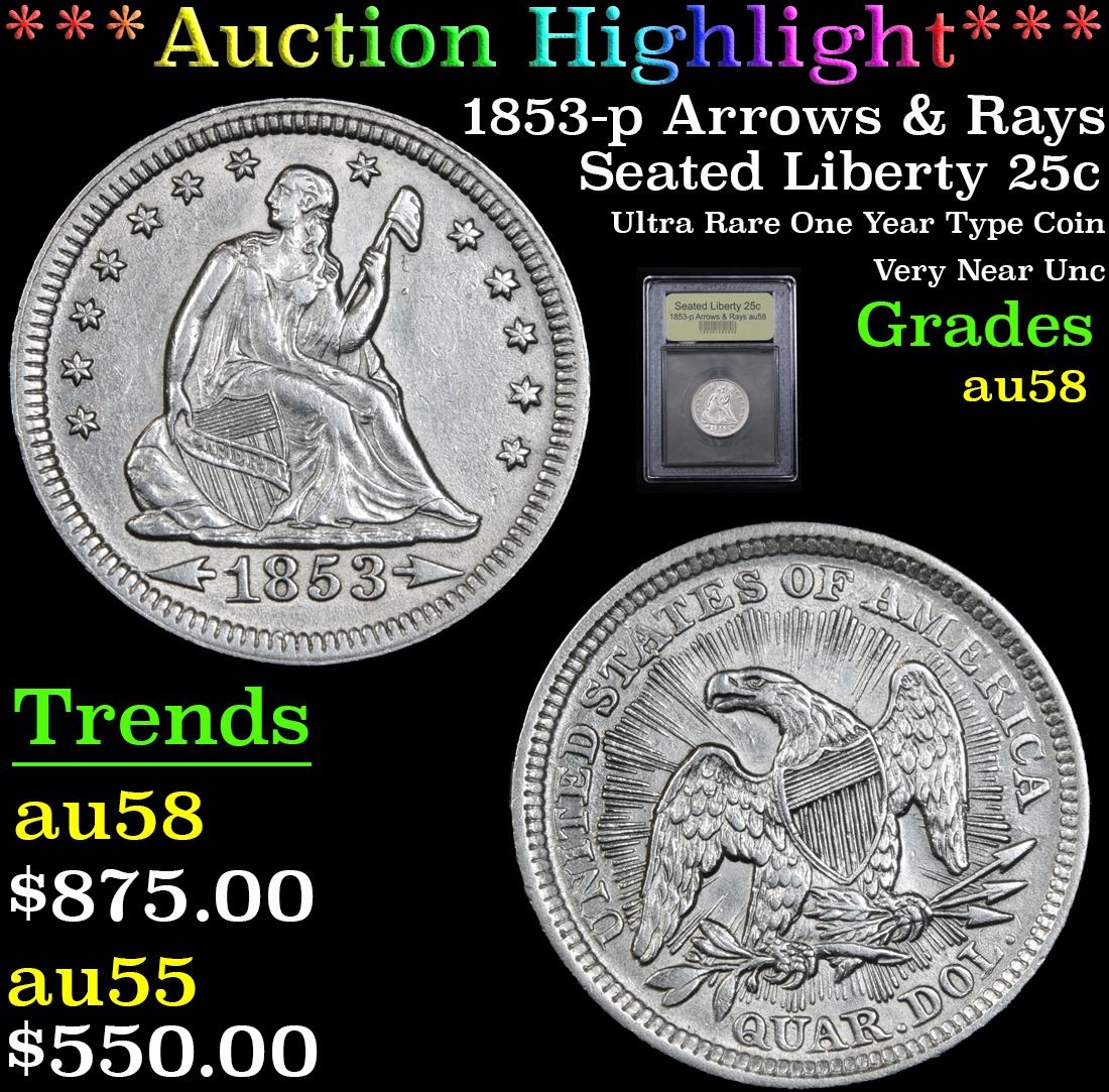 *Auction Highlight* 1853-p Arrows & Rays Ultra Rare One Year Type Coin Very Near Unc Seated Liberty 25c 25c Graded Choice AU/BU Slider By USCG. A Corey's Pick, Bid to Win Coin