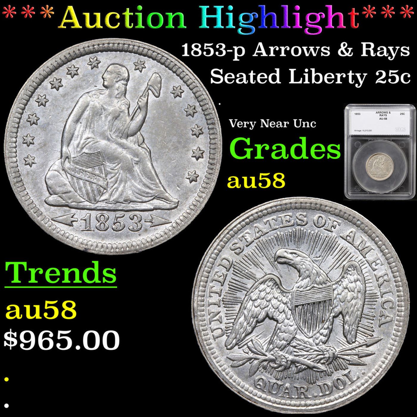 ***Auction Highlight*** 1853-p Arrows & Rays Seated Liberty Quarter 25c Graded au58 By SEGS.