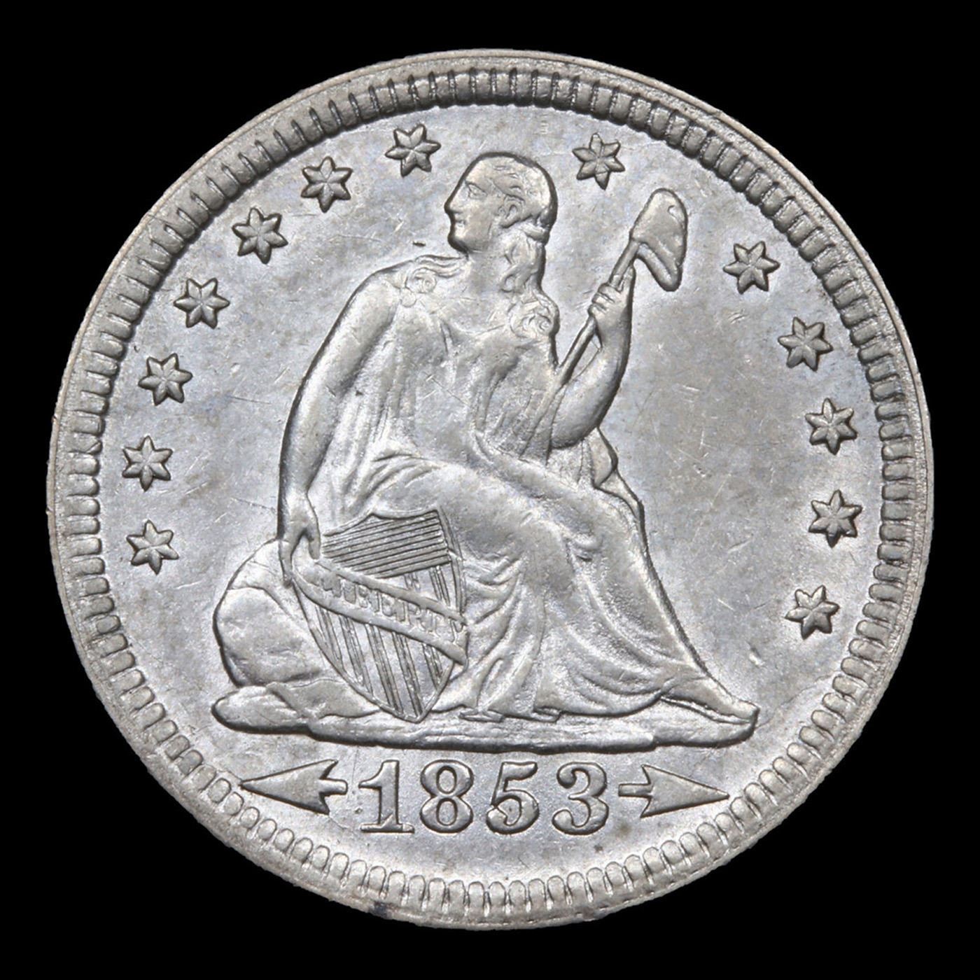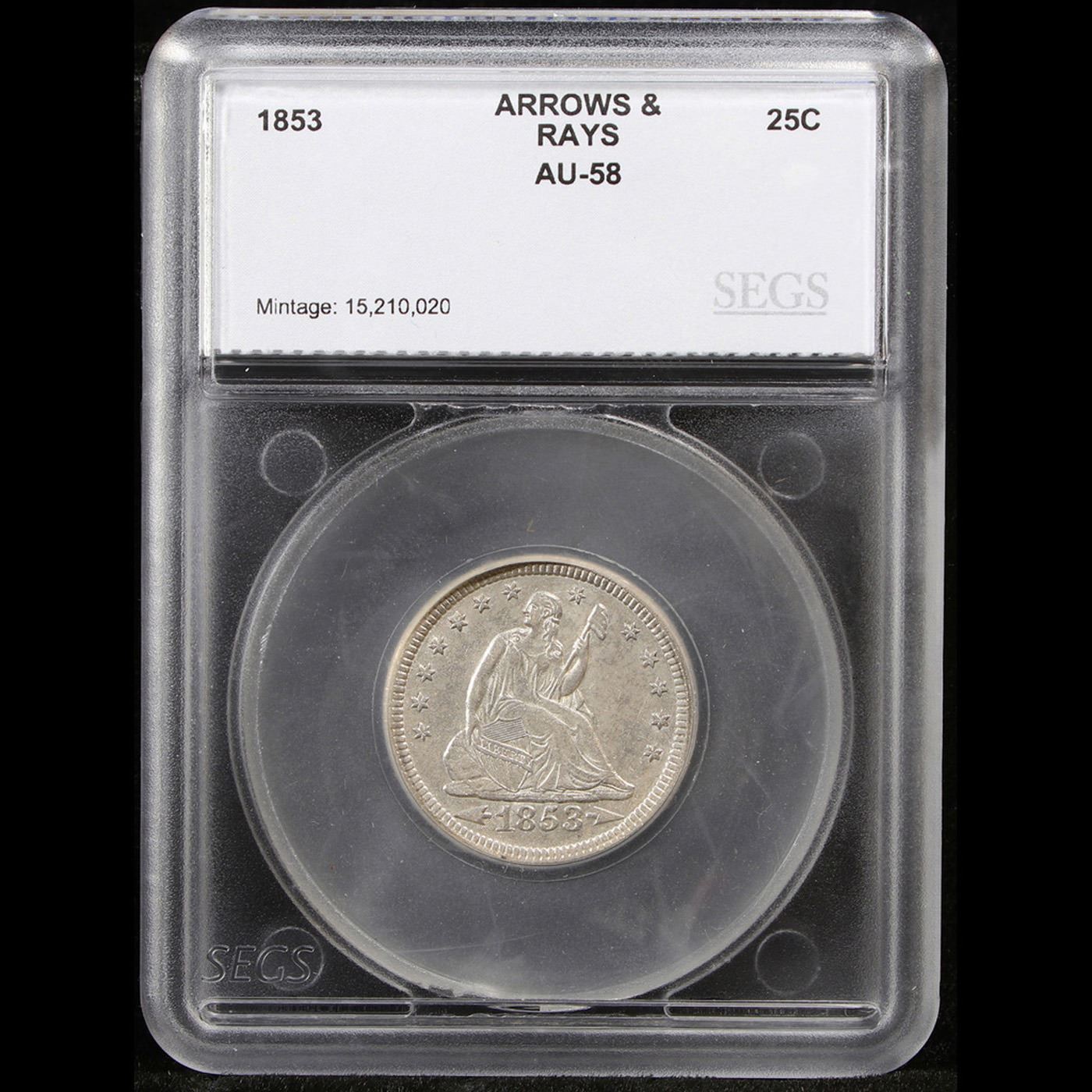 ***Auction Highlight*** 1853-p Arrows & Rays Seated Liberty Quarter 25c Graded au58 By SEGS (fc)