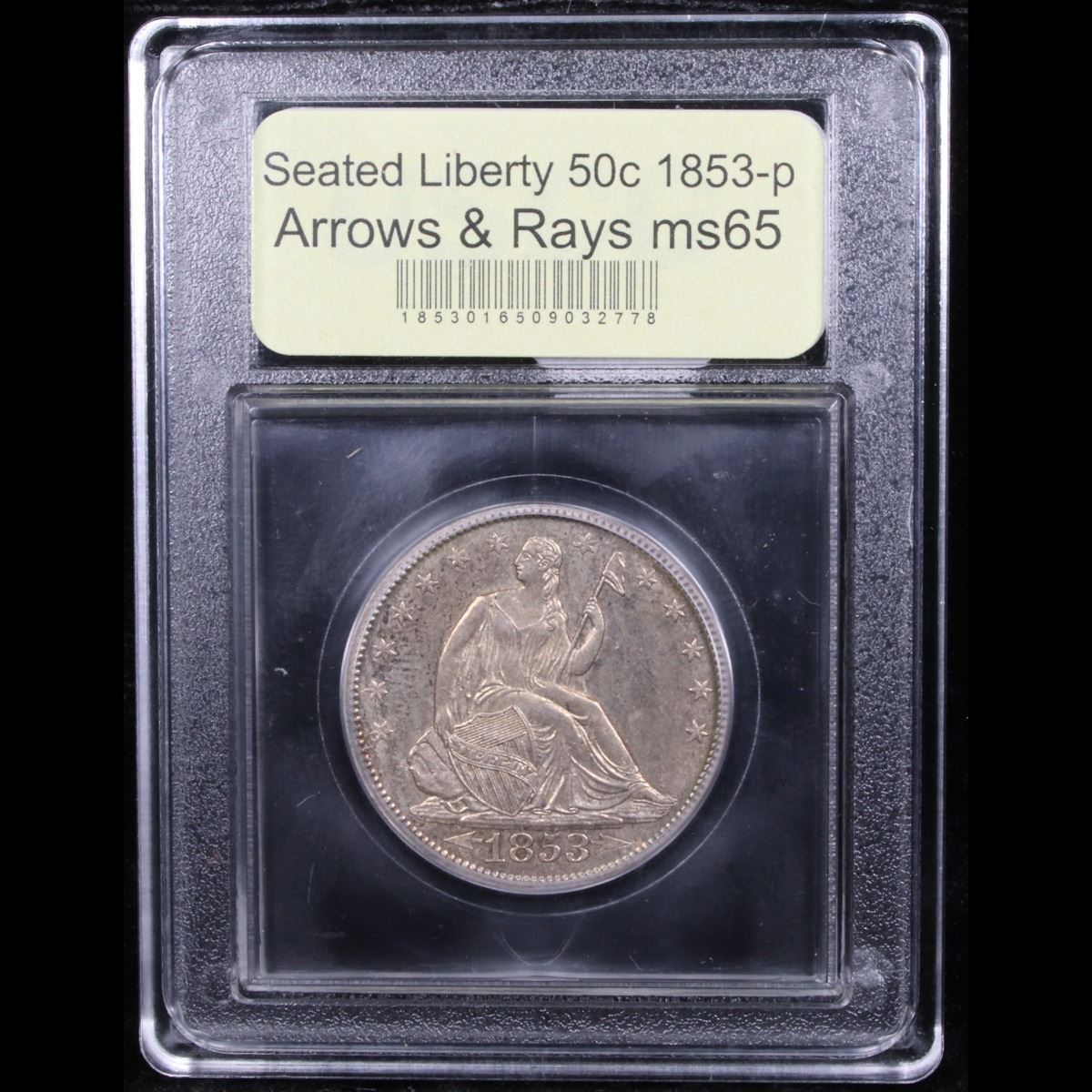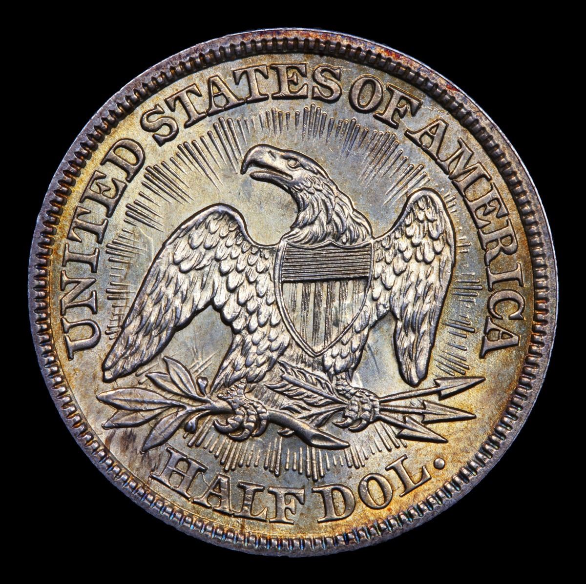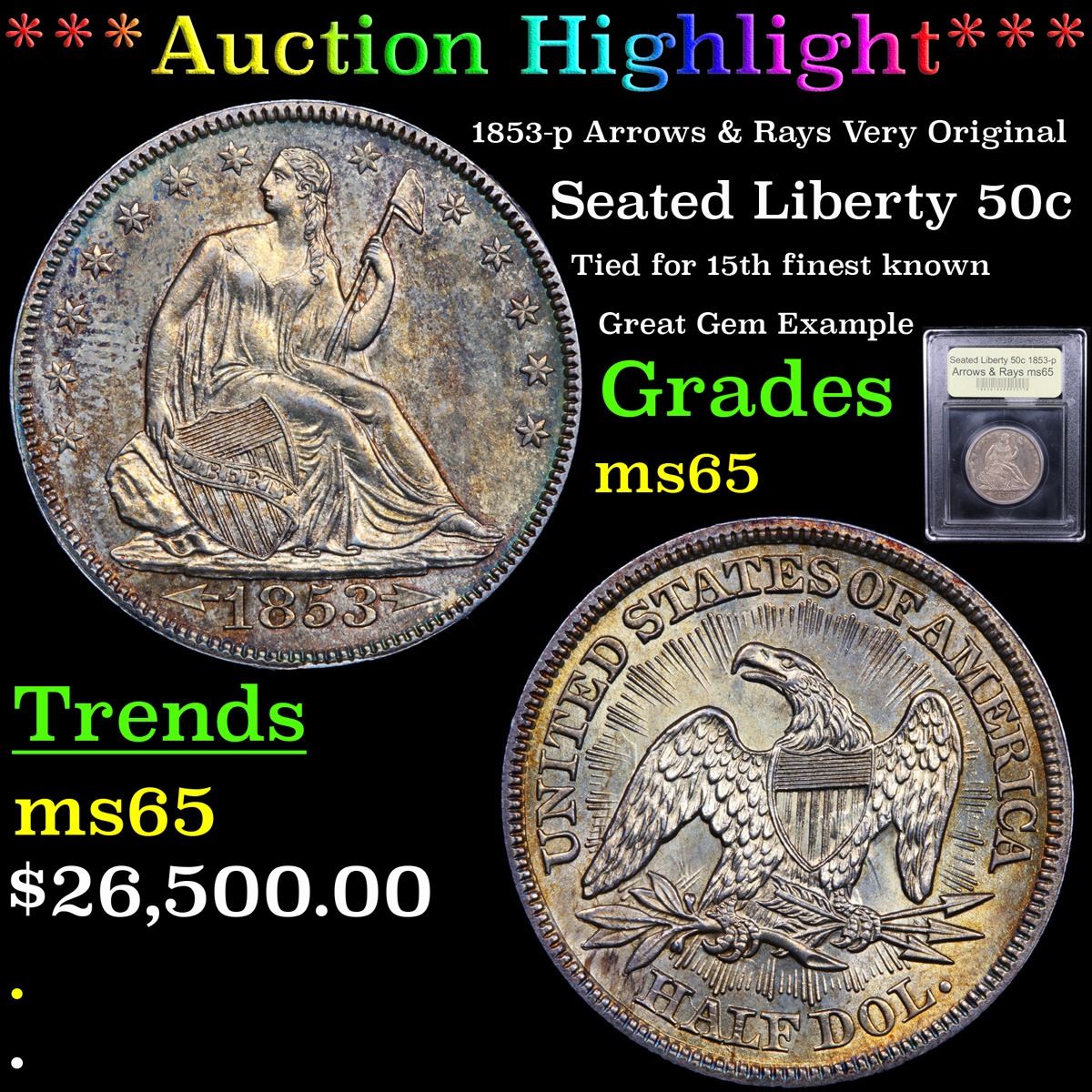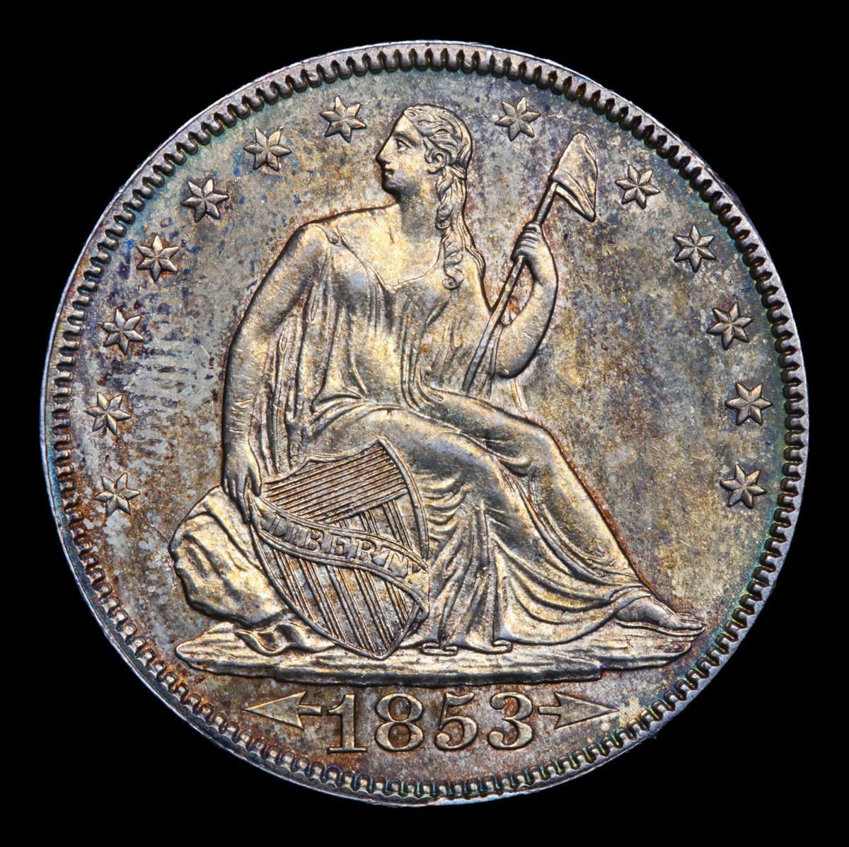 ***Auction Highlight*** 1853-p Arrows & Rays Very Original Seated Half Dollar 50c Graded GEM Unc By USCG. Much has been written in the past about the alleged rarity of the Arrows and Rays Seated half dollar type in Mint State, only some of which is true. Both the 1853 and 1853-O certainly command a premium in the numismatic market -- a situation that we feel is justified because the type collector needs to acquire an example of one of those two issues in order to complete their set. Most collectors gravitate toward the 1853-P because the 1853-O is much, much scarcer in circulated grades and genuinely rare in Mint State. The 1853 Philadelphia, however, is not rare in Mint State, only borderline scarce, and examples are offered frequently enough that the average collector should be able to acquire one within any given year of numismatic trading. There is one area in which the 1853 Arrows and Rays half is genuinely rare, however, and that is in properly graded, fully original Gem Mint State. So many Uncirculated examples (in all grades) that pass through our hands have been dipped or otherwise "conserved," making it extremely difficult to locate a fresh, original piece. This is just such a coin, the surfaces veiled in beautiful silver-orange patina that probably points to years of storage in a paper envelope. The color brightens markedly at direct angles, bringing vivid pinkish-apricot iridescence into view. Satiny luster remains as vibrant as the day the coin was struck, and the surfaces have survived the passage of time without acquiring any grade limiting abrasions. A PQ offering for the quality conscious type collector or advanced Seated half dollar specialist. A Corey's Pick, Bid to Win, Don't let it get Away, you might not find its equal Coin. I give this coin my highest recommendation
