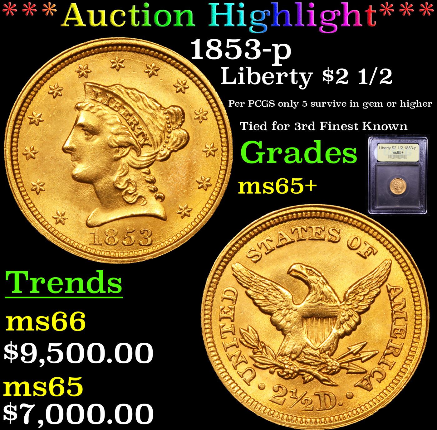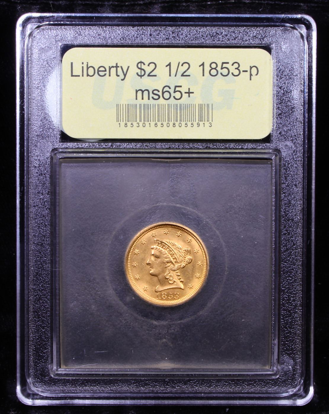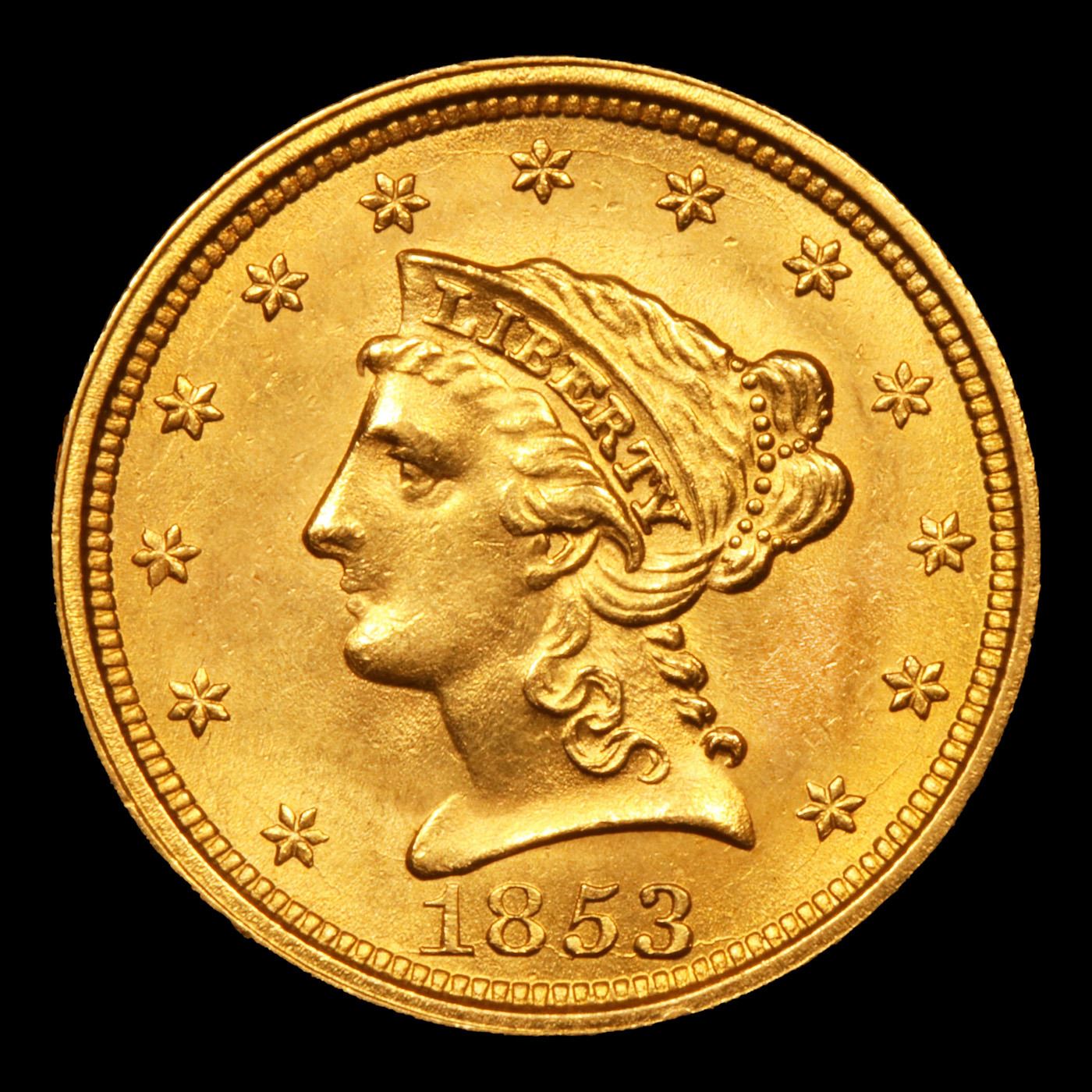 ***Auction Highlight*** 1853-p Gold Liberty Quarter Eagle $2 1/2 Graded GEM+ Unc By USCG. 0 Up for Auction is a SUPERB Gem Plus Example, Tied for 3rd Finest Known. Here is a remarkably well preserved example of an early date Liberty Head quarter eagle issue. Indeed, the surfaces are close to pristine with an overall smooth appearance. Lovely mint luster, vivid golden-rose patina, and bold to sharp striking detail all add to the appeal of this Gem quarter eagle. Full Detail in the Star centers on the Obverse. The Center Reverse Weakness was due to heavy Die Polishing which is seen on virtually all Late Die state examples. The 1853 is scarce in Choice Mint State, and Gems are rare for a pre-Civil War era Liberty Head gold issue. This is a significant condition rarity that would do equally well in an advanced type set or specialized gold cabinet.