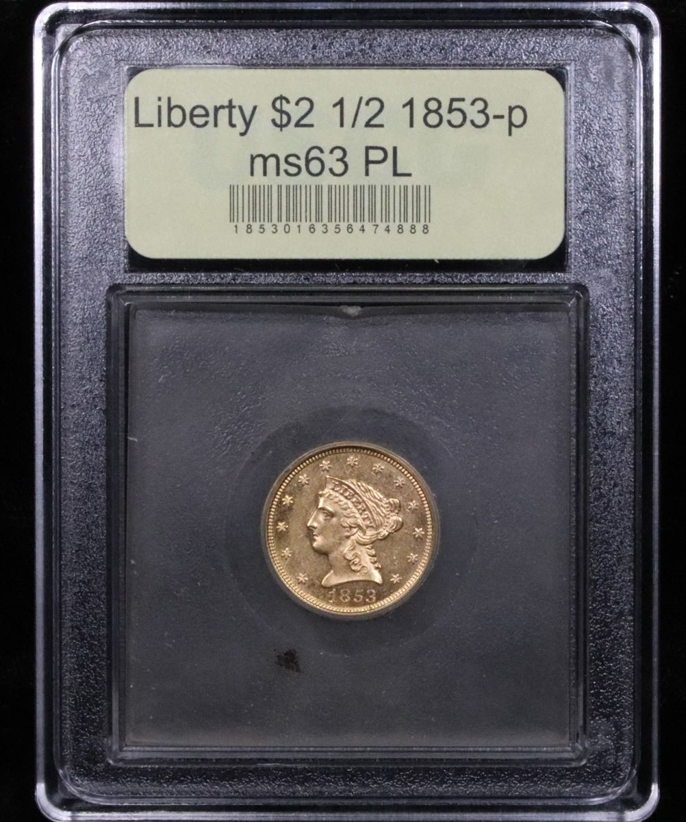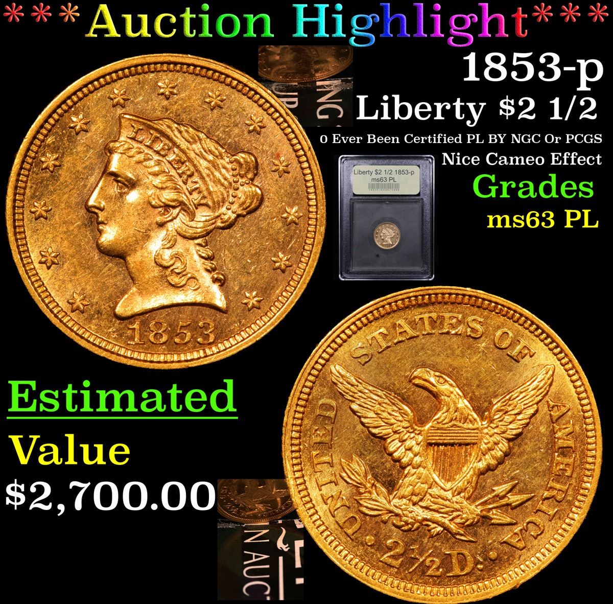 ***Auction Highlight*** 1853-p 0 Ever Been Certified PL BY NGC Or PCGS Nice Cameo Effect Gold Liberty Quarter Eagle $2 1/2 Graded Select Unc PL By USCG. Up for auction is an Ultra Rare Proof Like 1853 $2 ½ Gold Liberty. The example has reflective fields, as can be seen in the photos, as well as a nice cameo effect. To date zero have been certified as Proof Like by either NGC or PCGS. I have reviewed all of the listed uncirculated examples which have come up for auction over the past 20 years and none I have seen has been Proof Like, and only one was Semi Proof Like ms61. Ultra Rare coin in PL A Corey's Pick, Bid to Win, Don't let it get Away, you might not find its equal Coin. I give this coin my highest recommendation