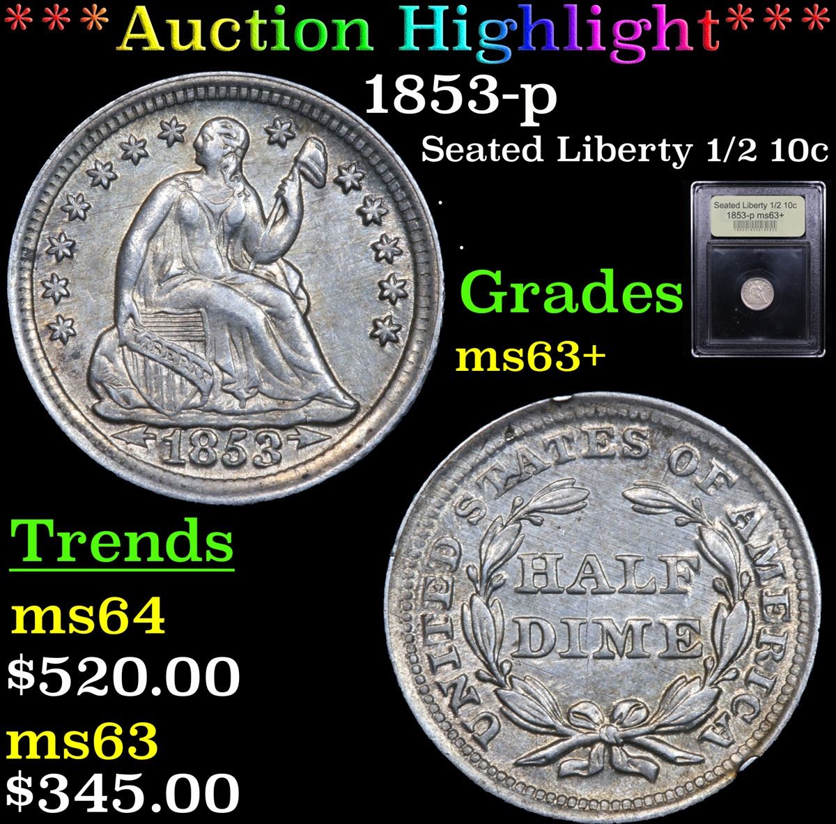 ***Auction Highlight*** 1853-p . . Seated Liberty Half Dime 1/2 10c Graded Select+ Unc By USCG. 0