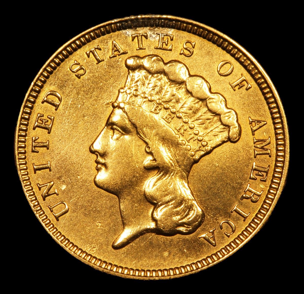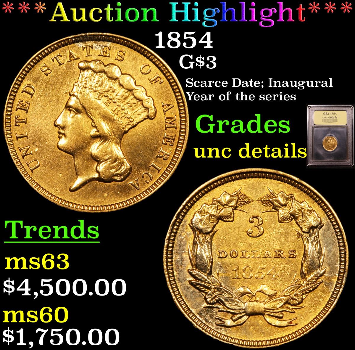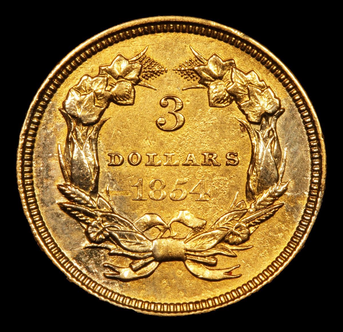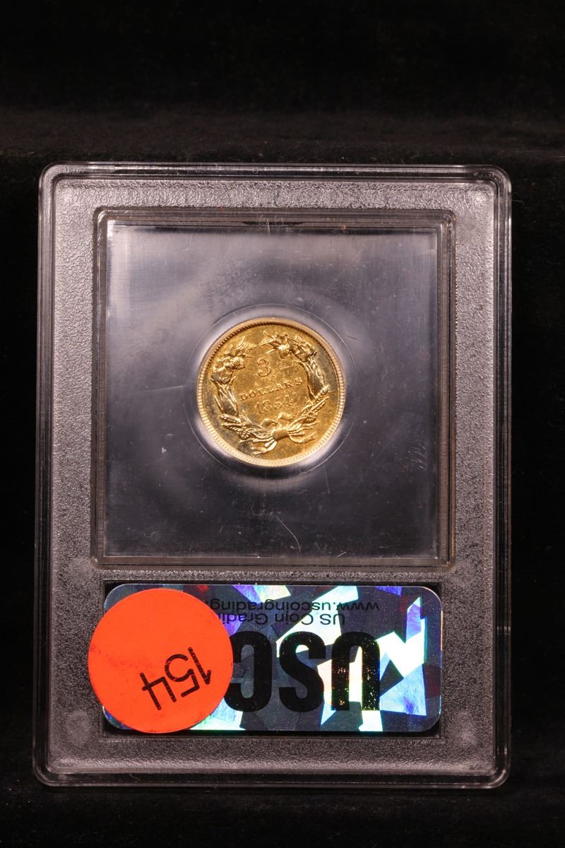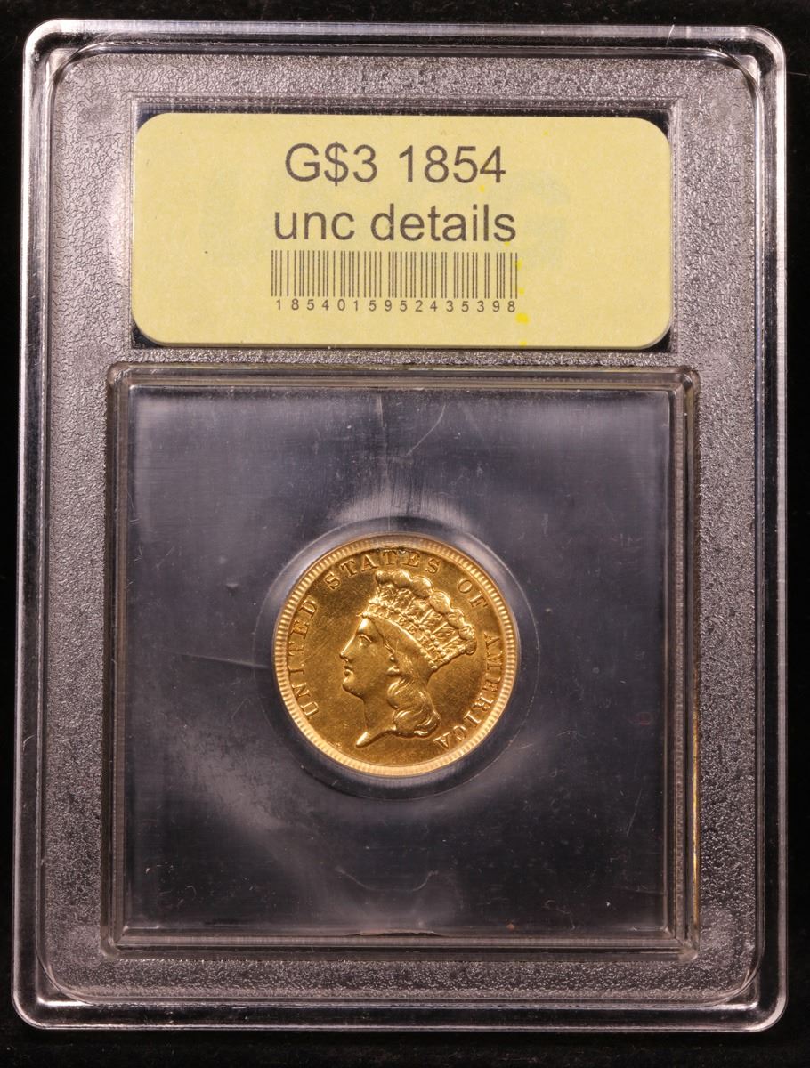 ***Auction Highlight*** 1854 Three Dollar Gold .$3 Graded Unc Details By USCG. Up for Auction is a scarce 1854 $3 Gold Princess. This is the Inaugural year of the series and actually it is a distinctly different type from subsequent years because the word DOLLARS on the reverse is much smaller (about half the size) than on issues from 1855 to 1889.