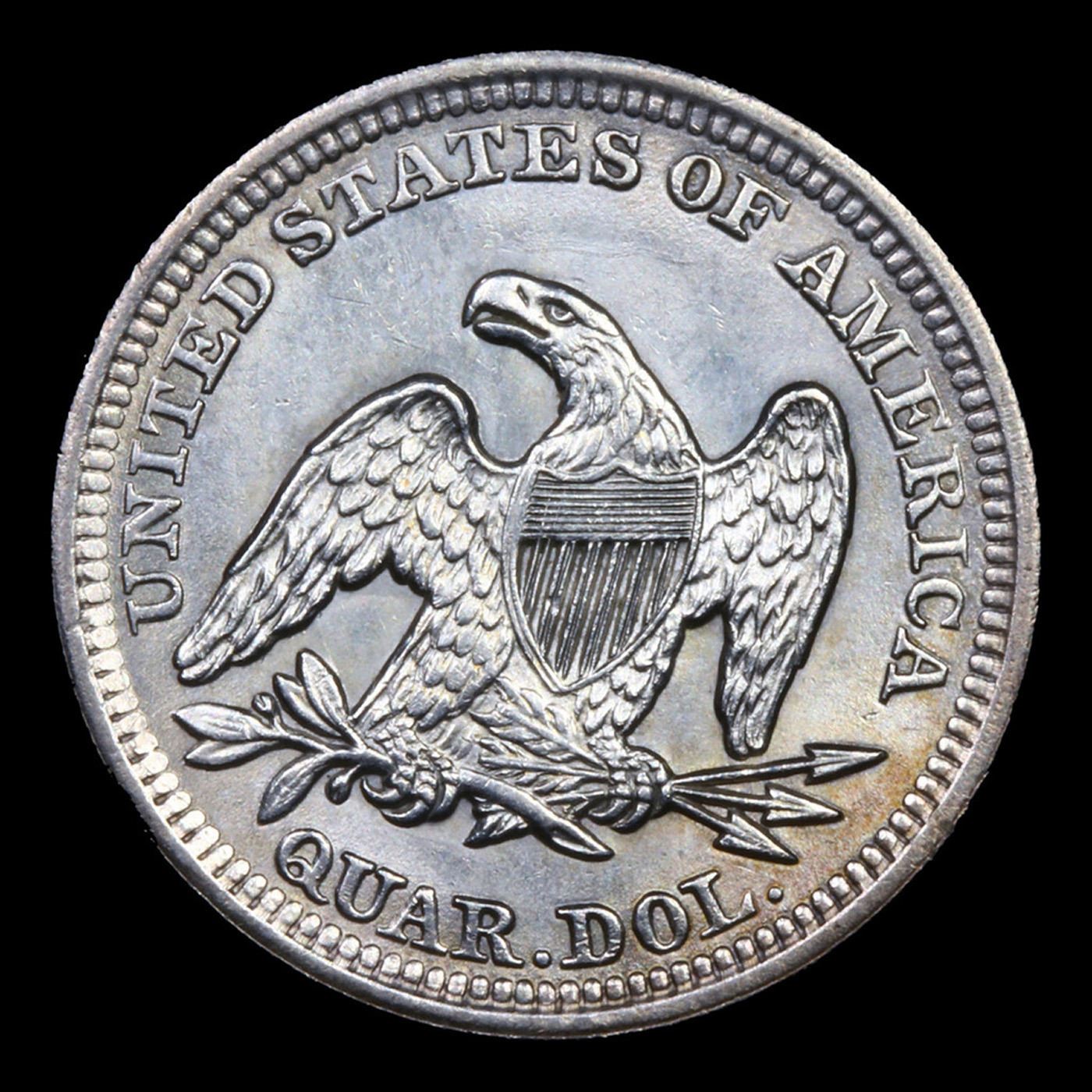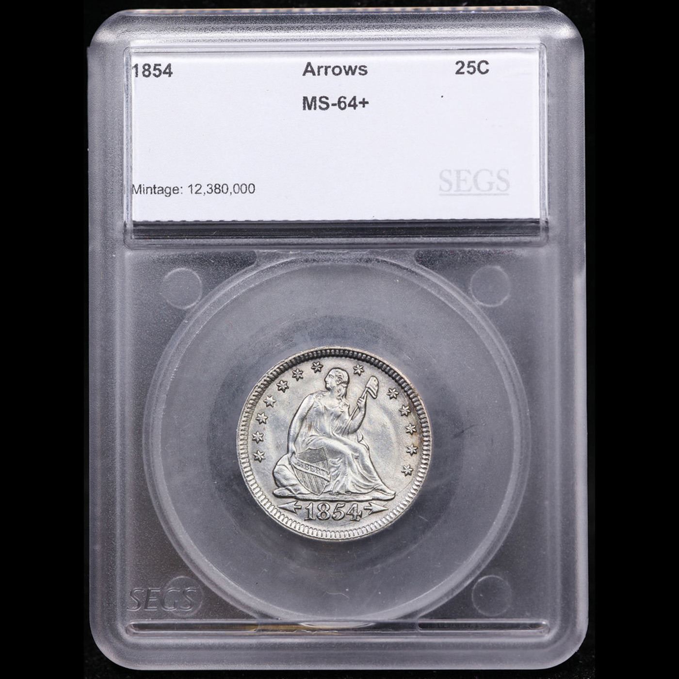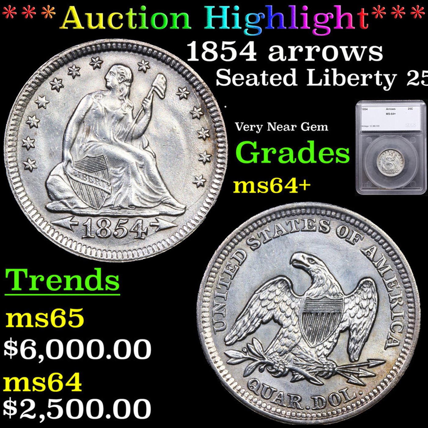 ***Auction Highlight*** 1854 arrows Seated Liberty Quarter 25c Graded ms64+ By SEGS. A Key Date's Pick, Bid to Win, Don't let it get Away Coin