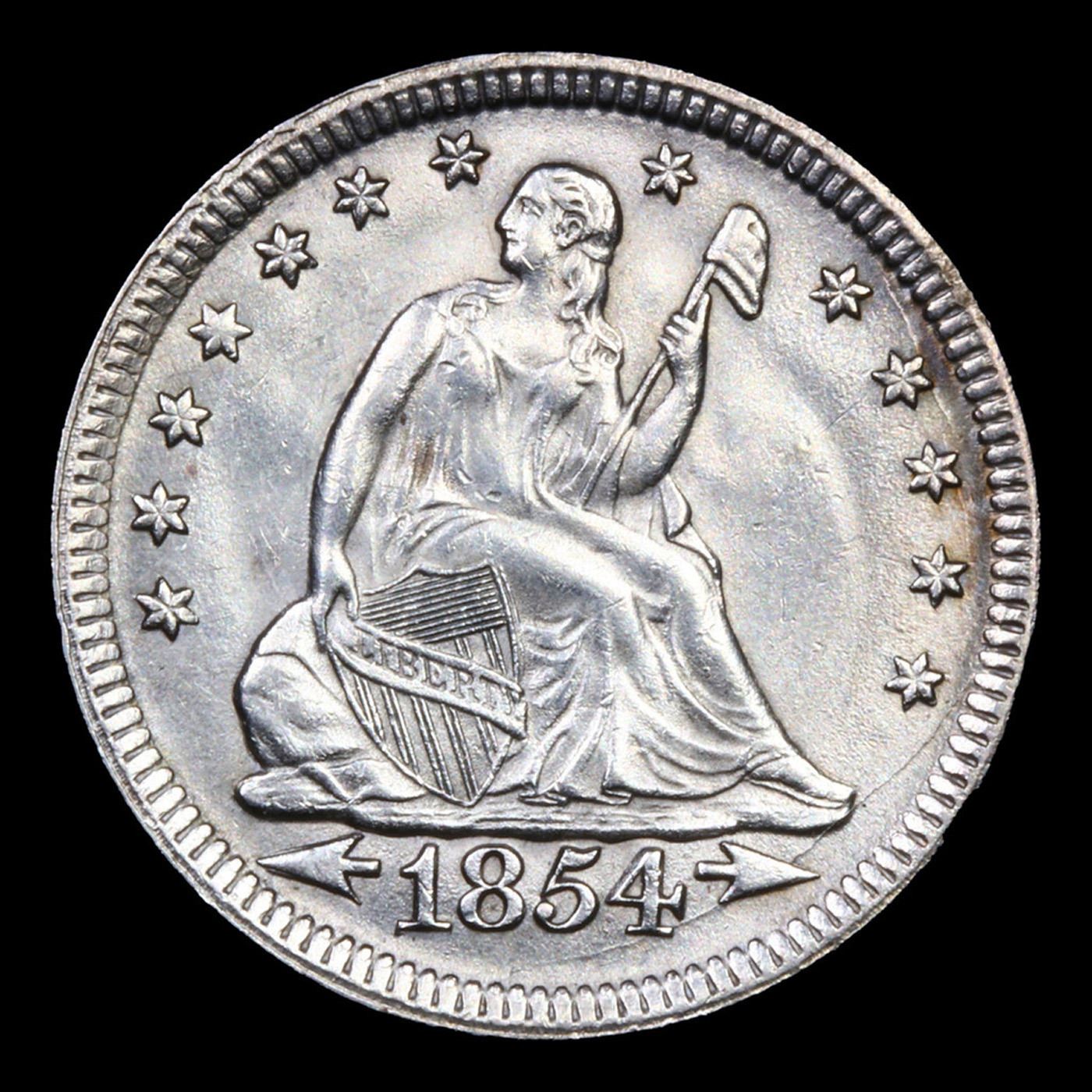 ***Auction Highlight*** 1854 arrows Seated Liberty Quarter 25c Graded ms64+ By SEGS (fc)
